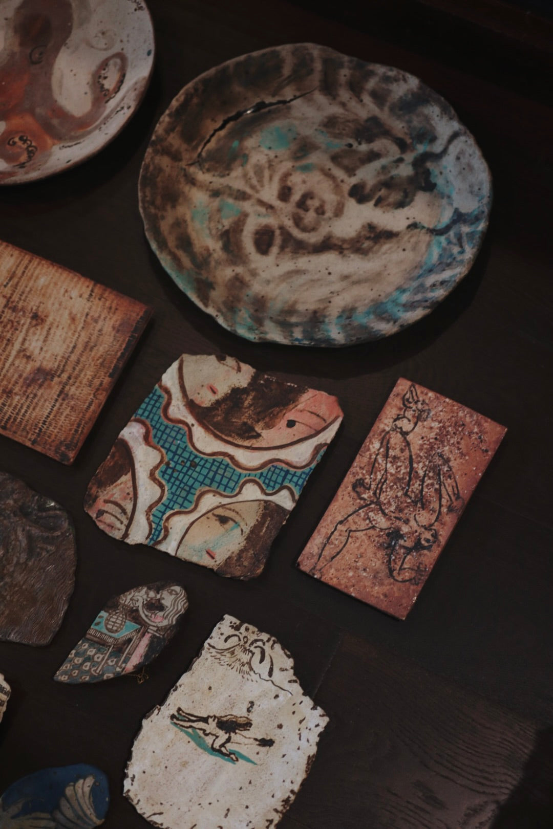水谷智美 x megumireland陶板畫系列作品這次在水谷智美的「暮色」展覽中,將特別展出與水谷是多年好友的畫家 Megumi (メグマイルランド) 的陶板畫系列作品。這些陶板畫作品,由Megumi 進行創作之後,再交由水谷智美進行陶片的燒製。相識已久的兩人大約從十年前便開始一起創作,這些陶板作品保留了燒製時所產生的缺角與不完整,將其視為創作的一部分,並以漆繼的方式填補修復,有些看起來質感像是年代久遠的歐洲老磁磚、或是古代陶片。Megumi除了陶板畫的創作、同時也是一位漫畫家,她的作品構圖詼諧生動,帶有豐富的色彩。陶片上雖然只描繪一個畫面,卻像在看漫畫一般,彷彿可以延伸出各種情境與故事。