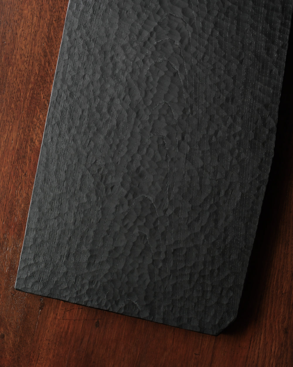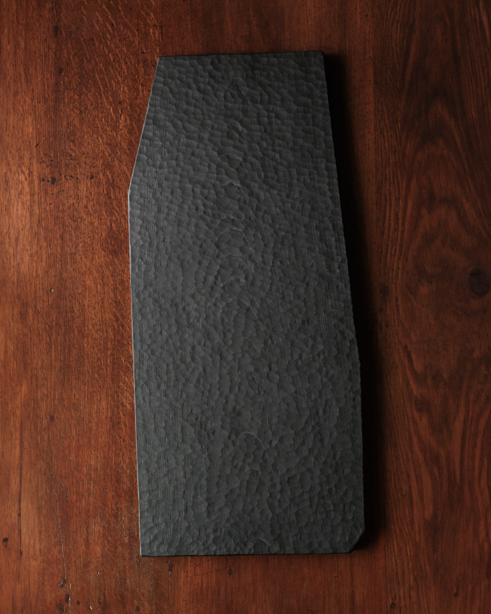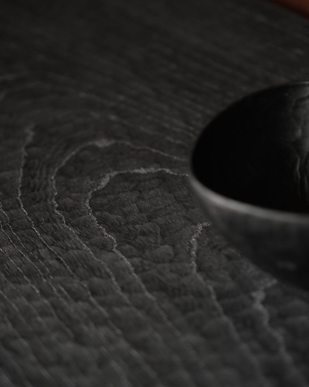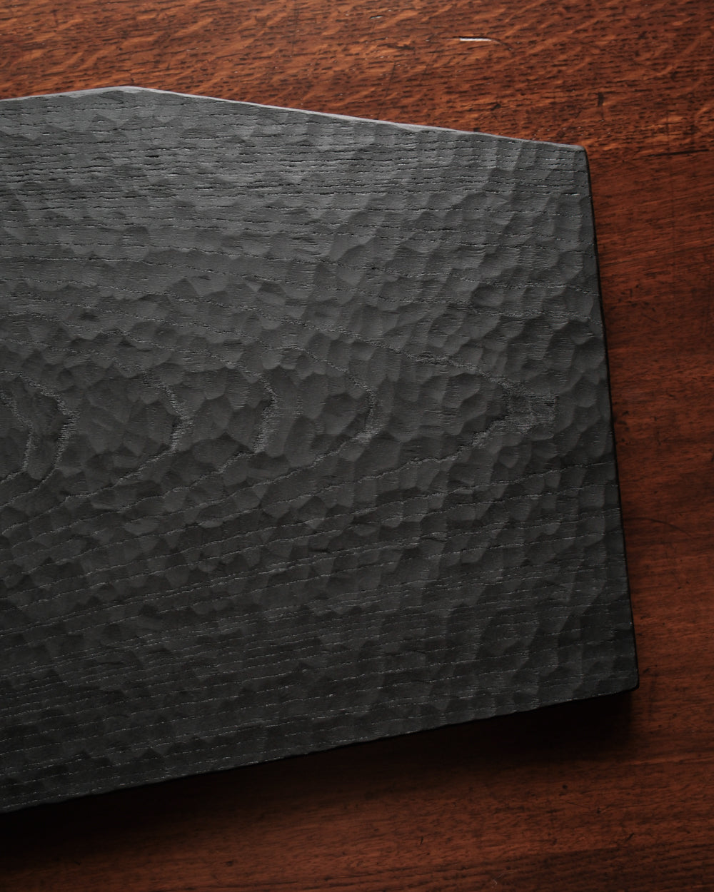 以自然木製作而成的木板皿,表面為大村使用鑿刀手工雕刻出來的紋路。適合用來盛放乾式料理,像是麵包與火腿、起司、生魚片、握壽司、炸物、蛋糕與甜點等。也可作為店舖與展覽中陳列的道具、花器之下的花台。深邃的黑色可以襯托料理和商品的顏色與氛圍。表面為自然漆塗層,便於清洗與照顧。