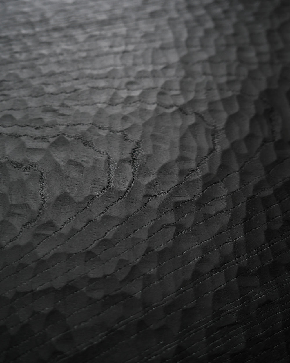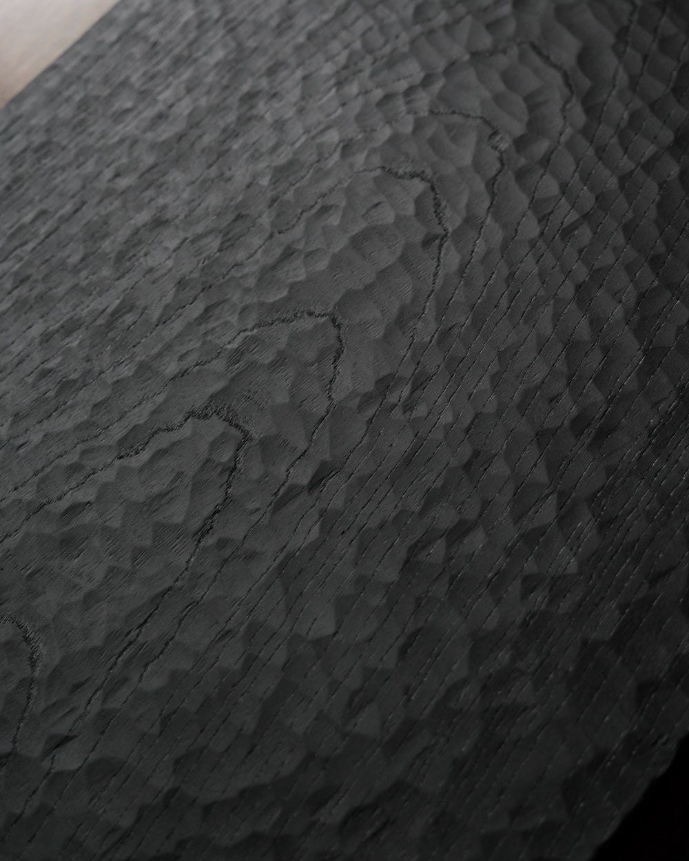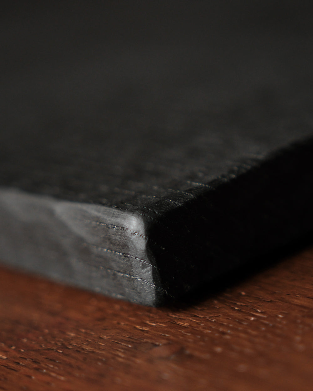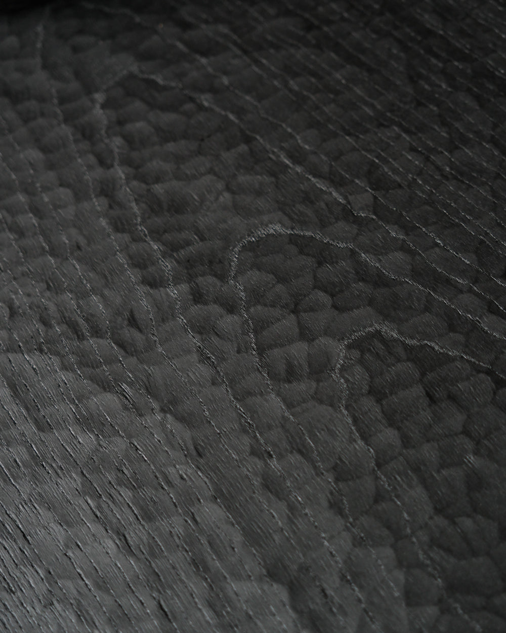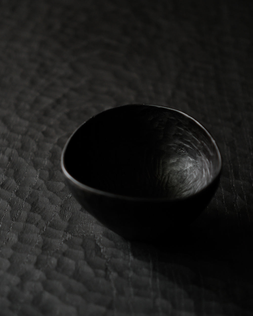 以自然木製作而成的木板皿,表面為大村使用鑿刀手工雕刻出來的紋路。適合用來盛放乾式料理,像是麵包與火腿、起司、生魚片、握壽司、炸物、蛋糕與甜點等。也可作為店舖與展覽中陳列的道具、花器之下的花台。深邃的黑色可以襯托料理和商品的顏色與氛圍。表面為自然漆塗層,便於清洗與照顧。