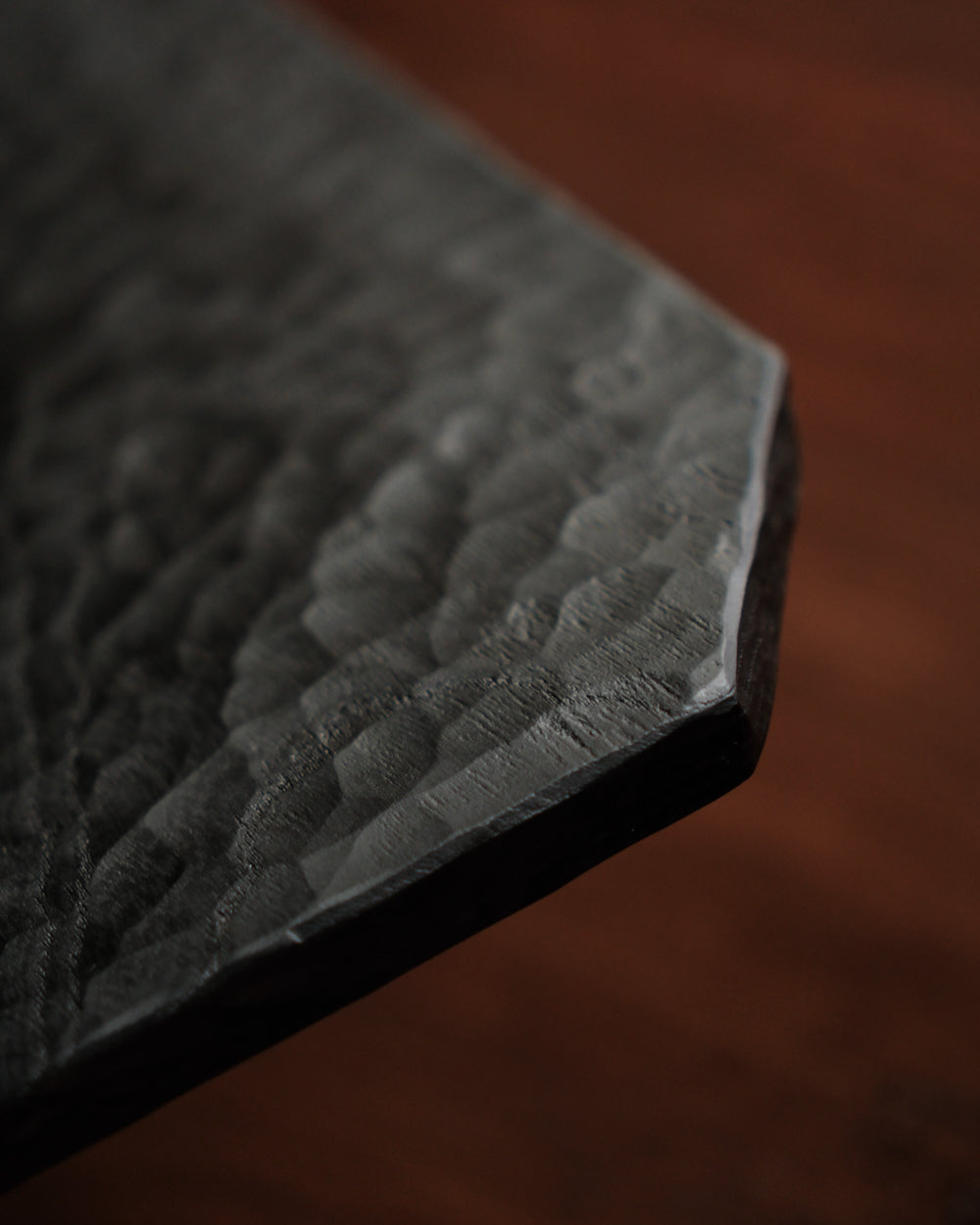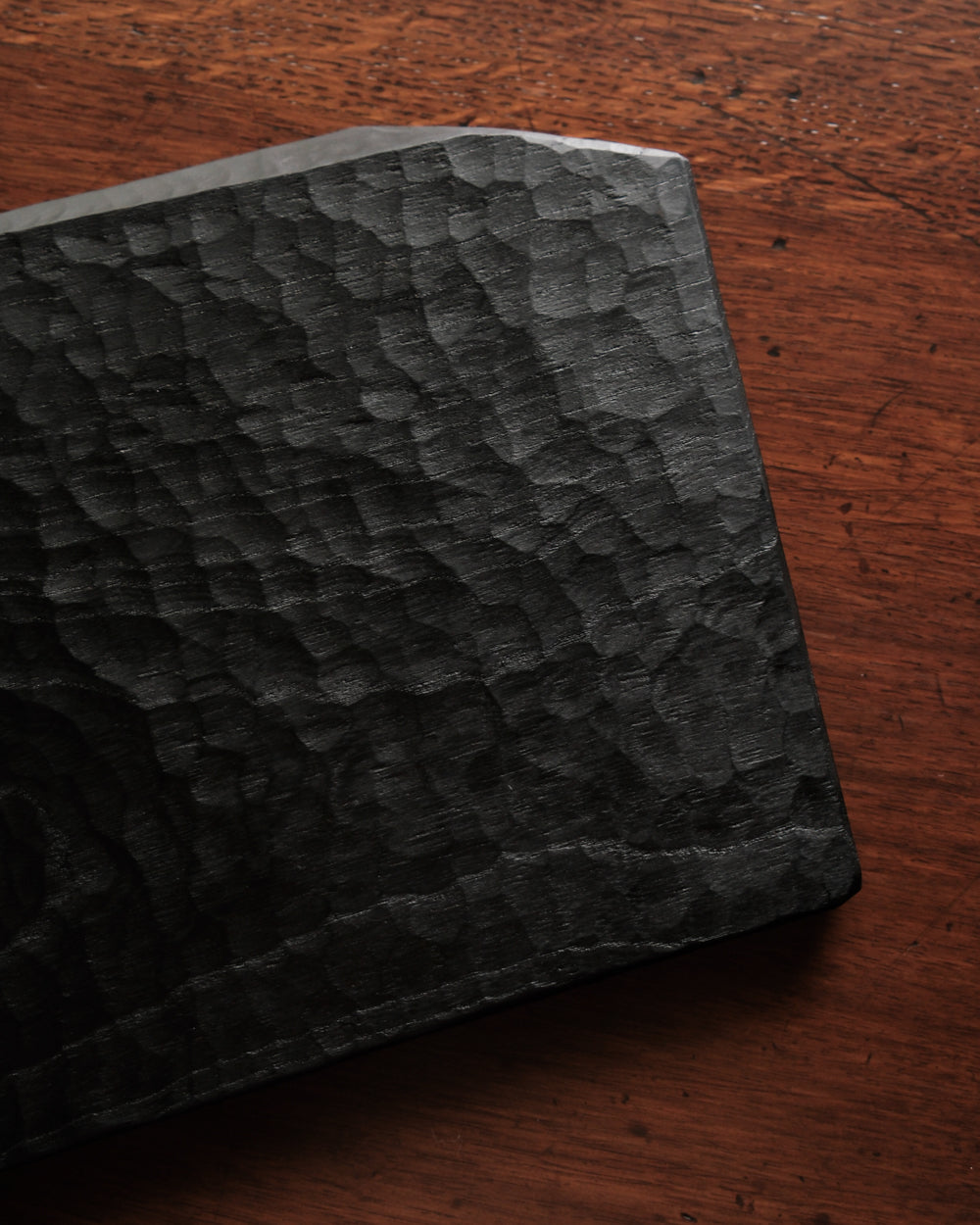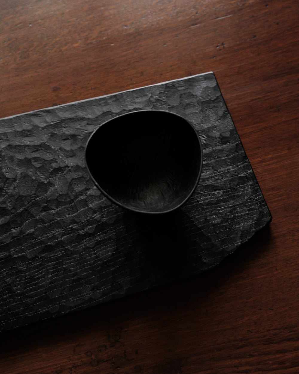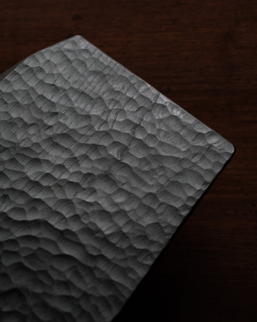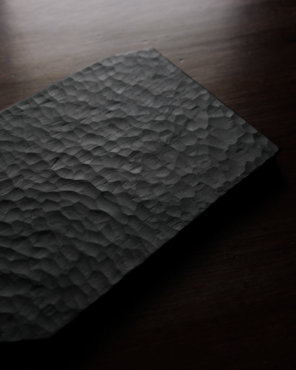 以自然木製作而成的木板皿,表面為大村使用鑿刀手工雕刻出來的紋路。適合用來盛放乾式料理,像是麵包與火腿、起司、生魚片、握壽司、炸物、蛋糕與甜點等。也可作為店舖與展覽中陳列的道具、花器之下的花台。深邃的黑色可以襯托料理和商品的顏色與氛圍。表面為自然漆塗層,便於清洗與照顧。