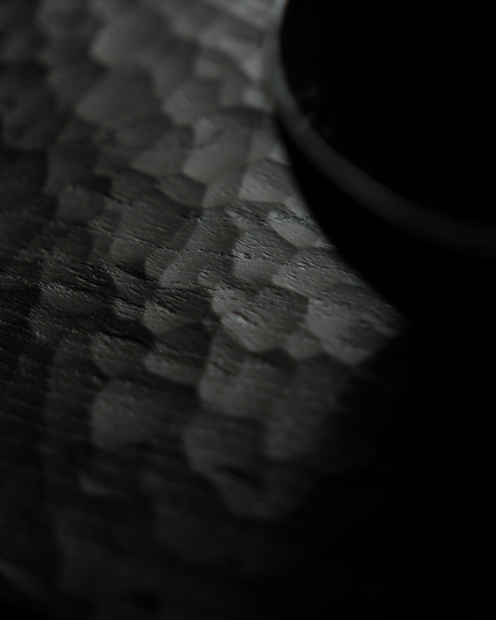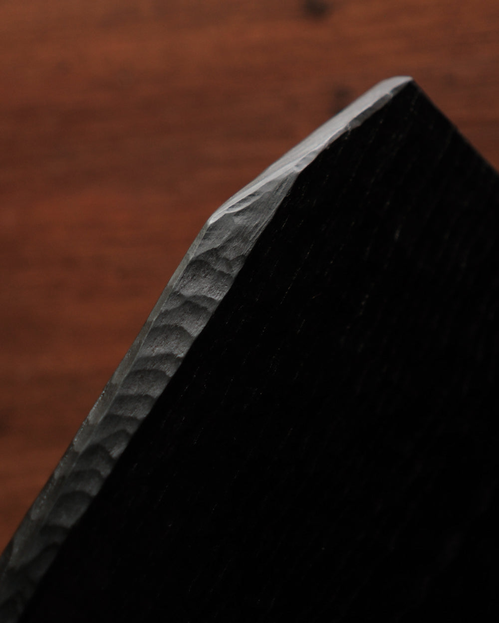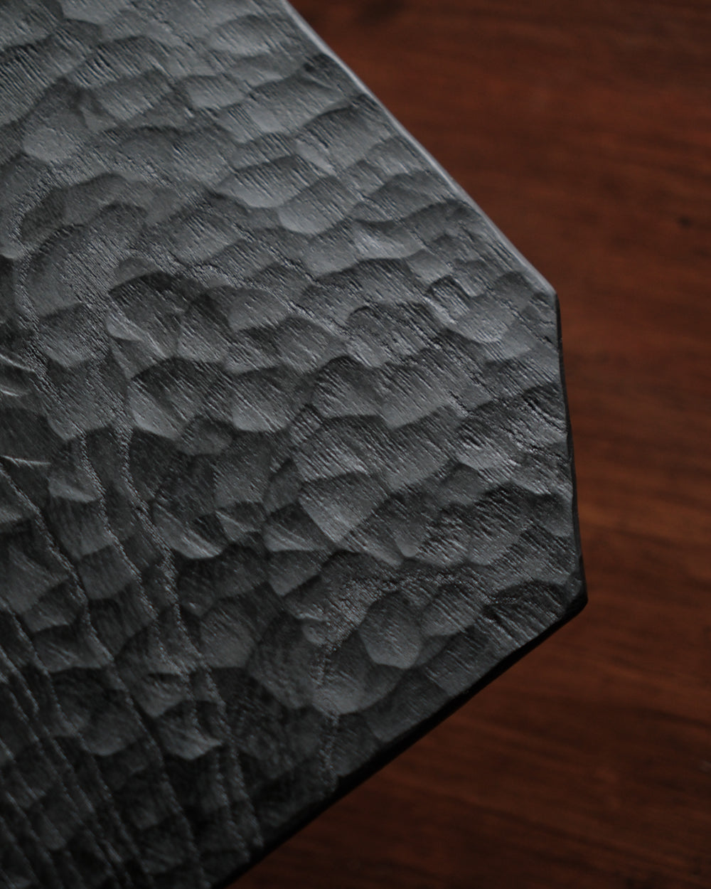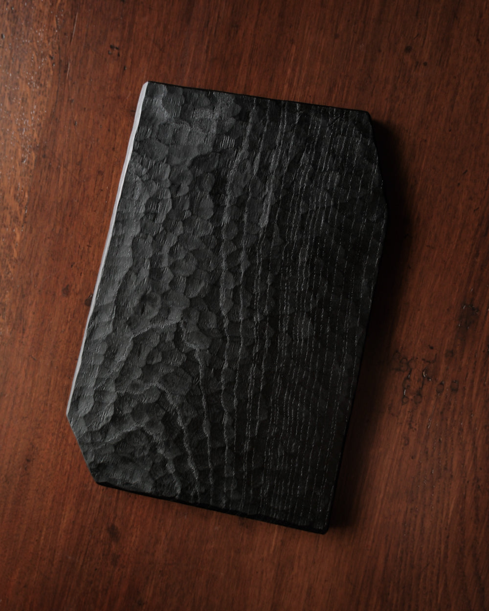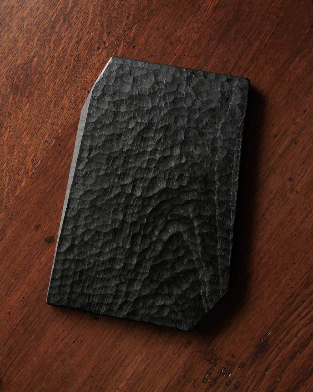 以自然木製作而成的木板皿,表面為大村使用鑿刀手工雕刻出來的紋路。適合用來盛放乾式料理,像是麵包與火腿、起司、生魚片、握壽司、炸物、蛋糕與甜點等。也可作為店舖與展覽中陳列的道具、花器之下的花台。深邃的黑色可以襯托料理和商品的顏色與氛圍。表面為自然漆塗層,便於清洗與照顧。
