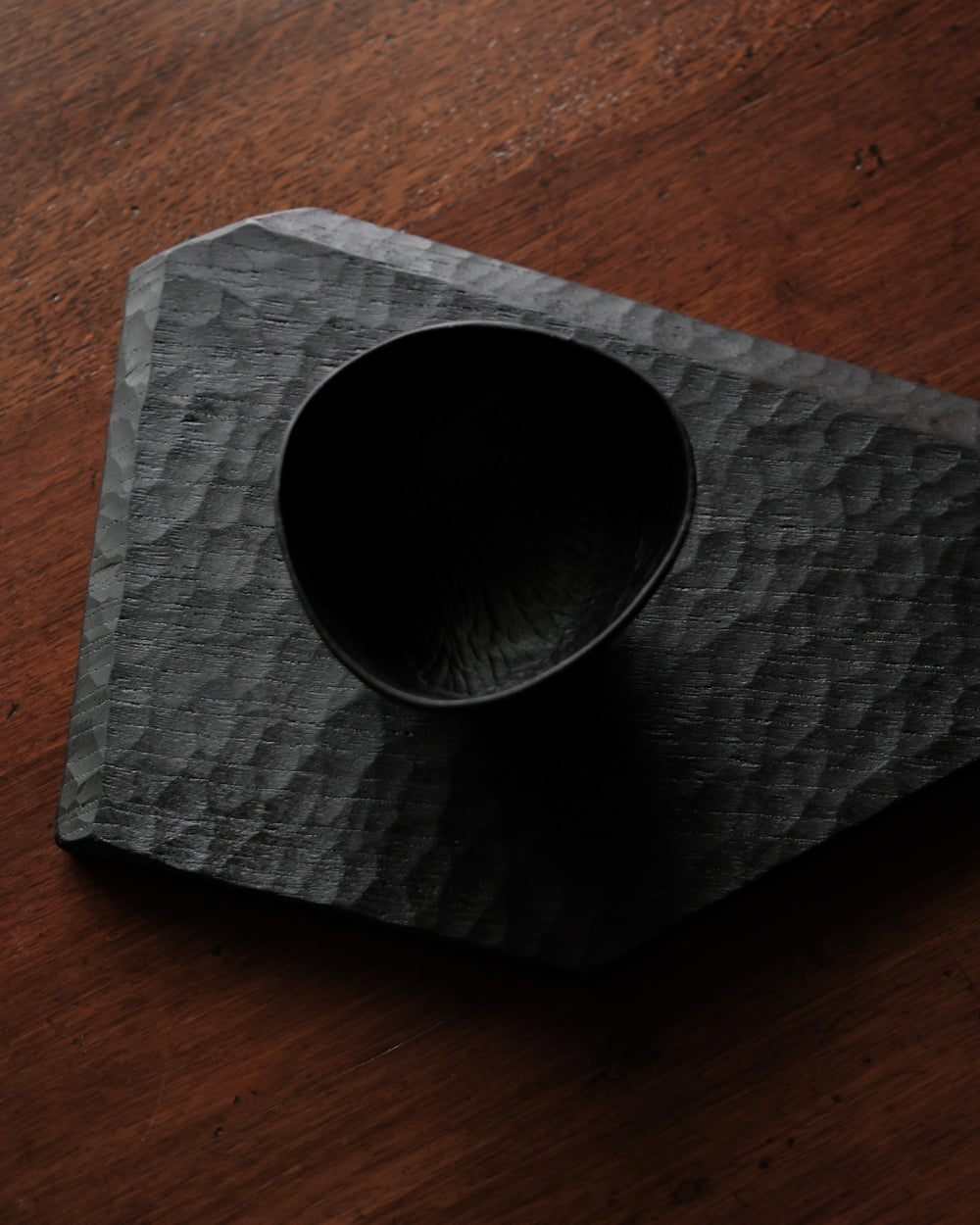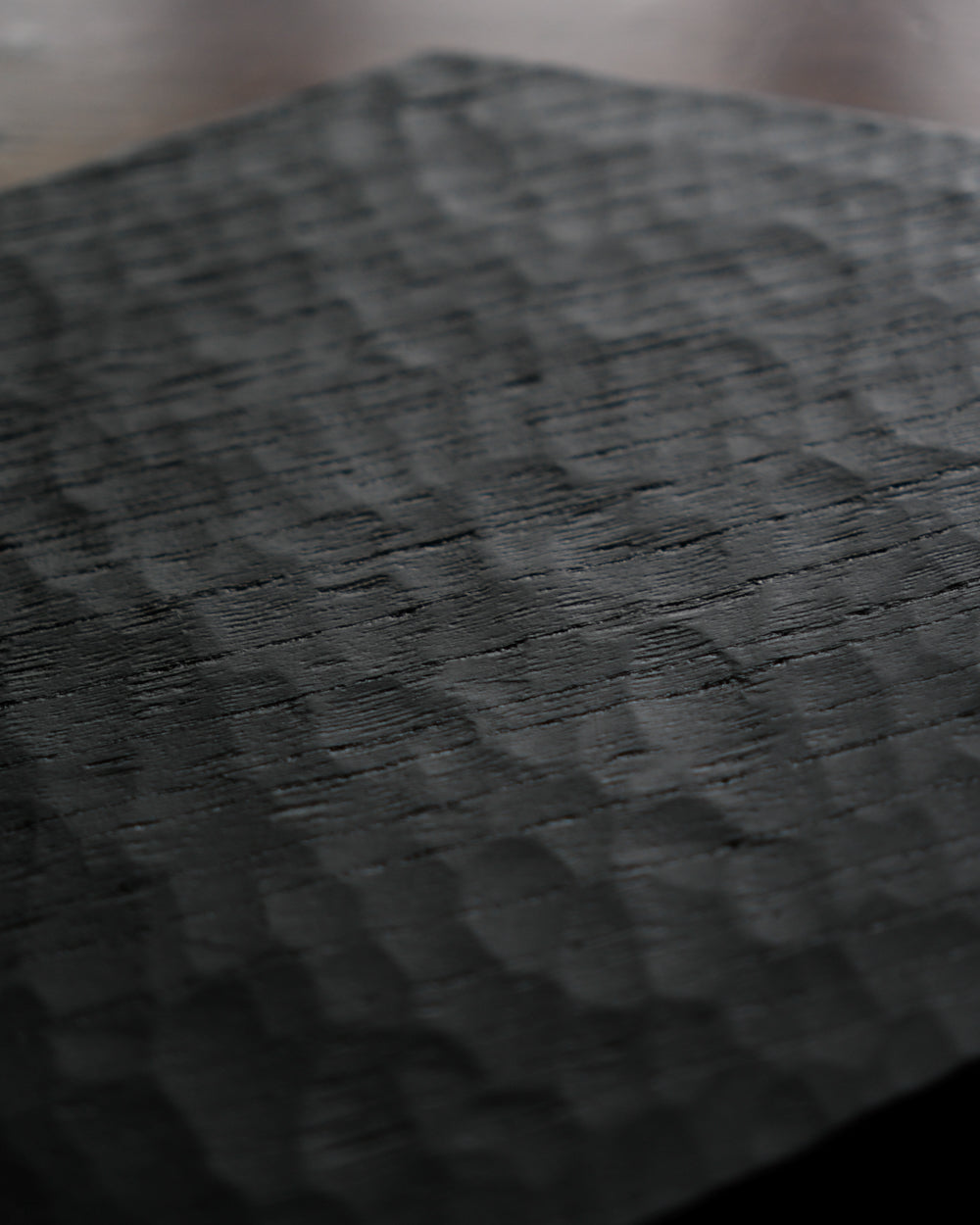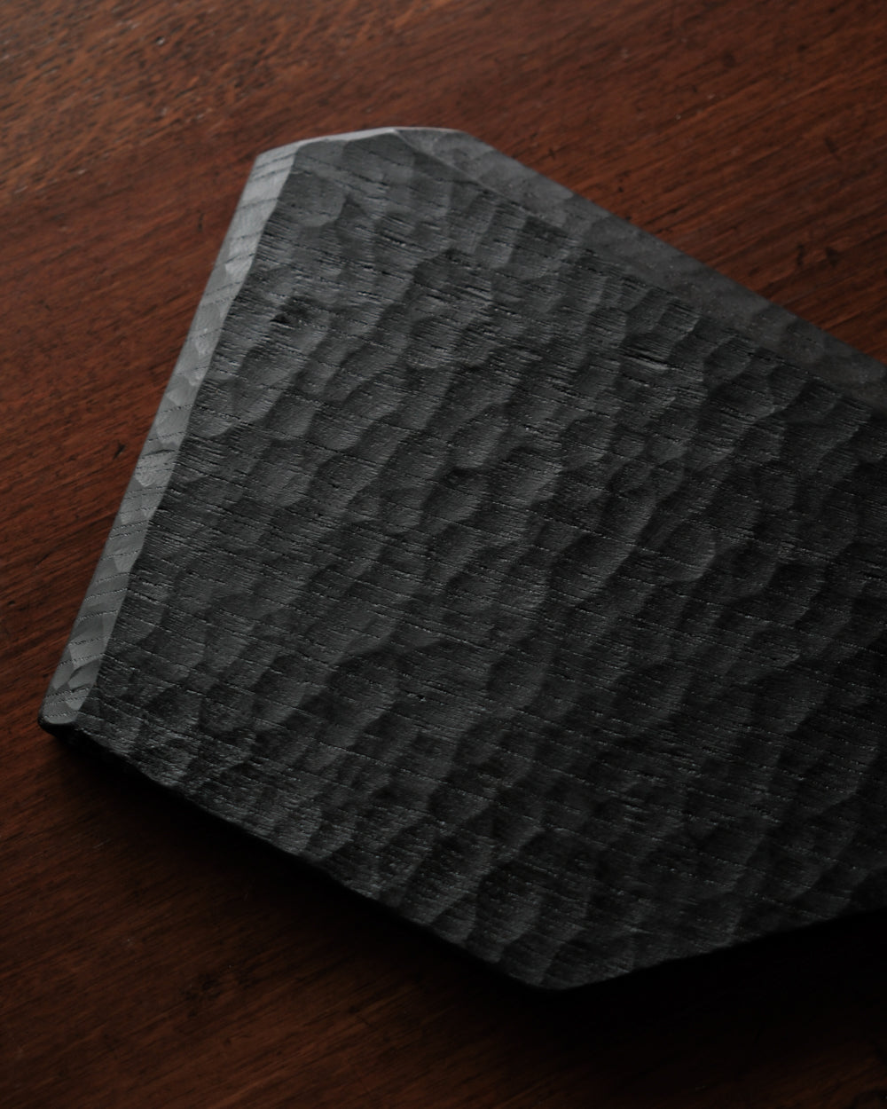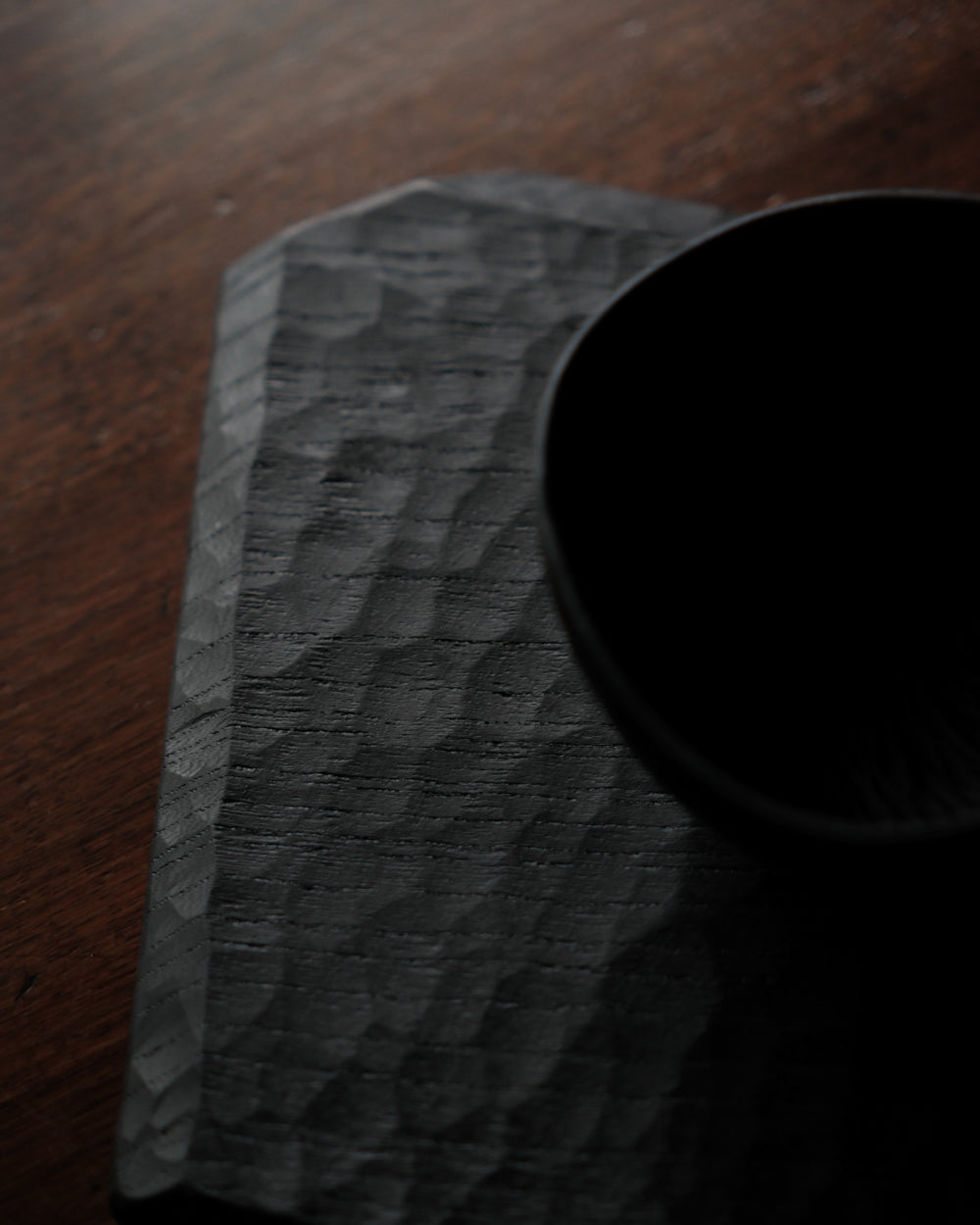 以自然木製作而成的木板皿,表面為大村使用鑿刀手工雕刻出來的紋路。適合用來盛放乾式料理,像是麵包與火腿、起司、生魚片、握壽司、炸物、蛋糕與甜點等。也可作為店舖與展覽中陳列的道具、花器之下的花台。深邃的黑色可以襯托料理和商品的顏色與氛圍。表面為自然漆塗層,便於清洗與照顧。