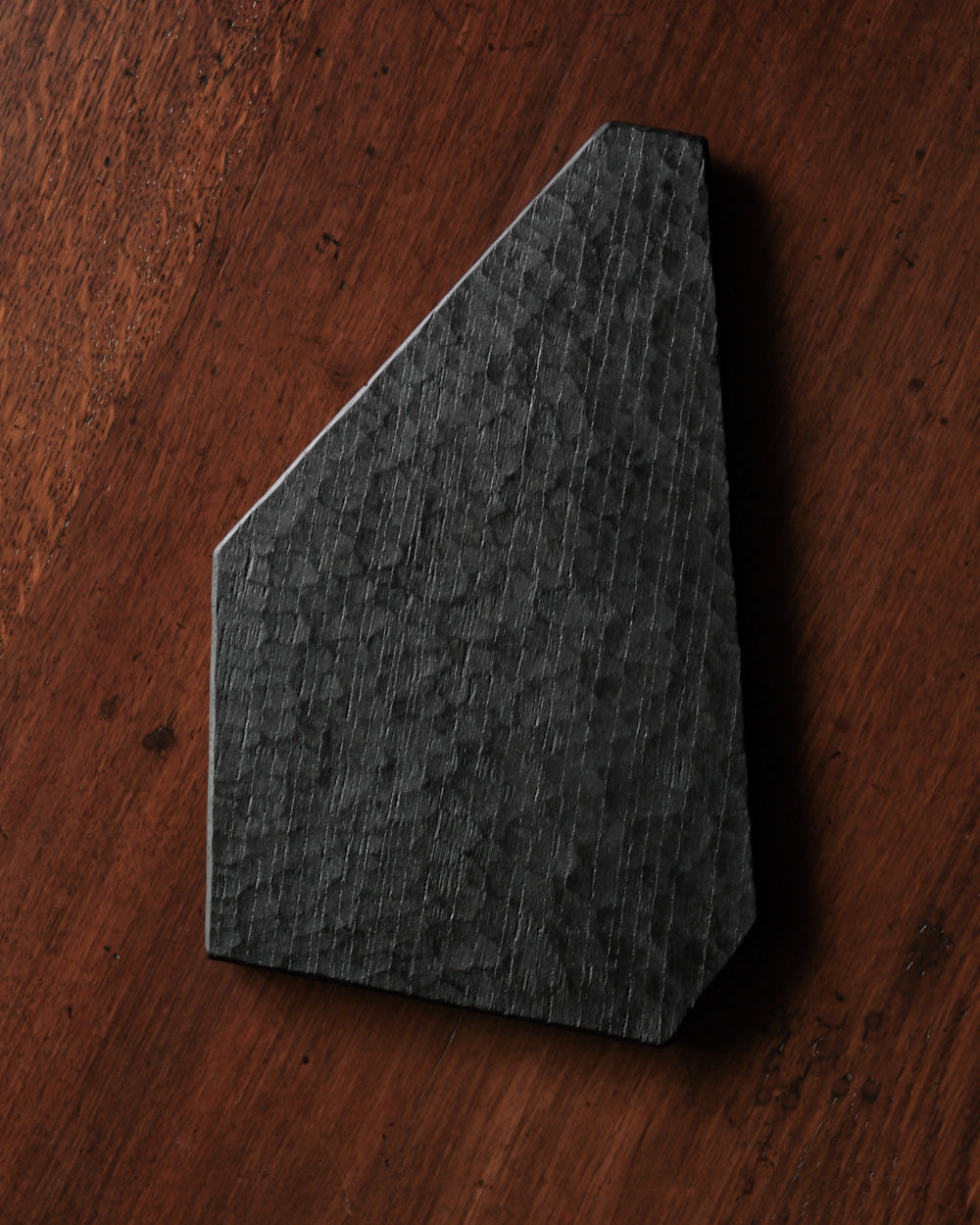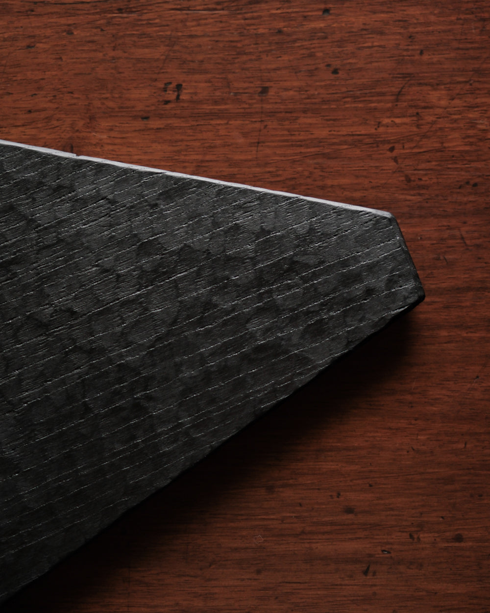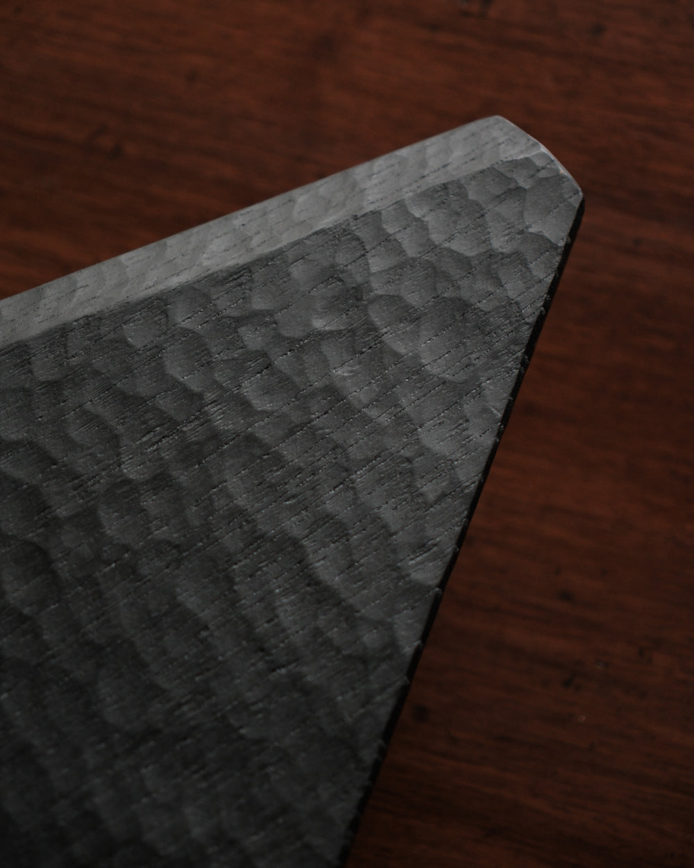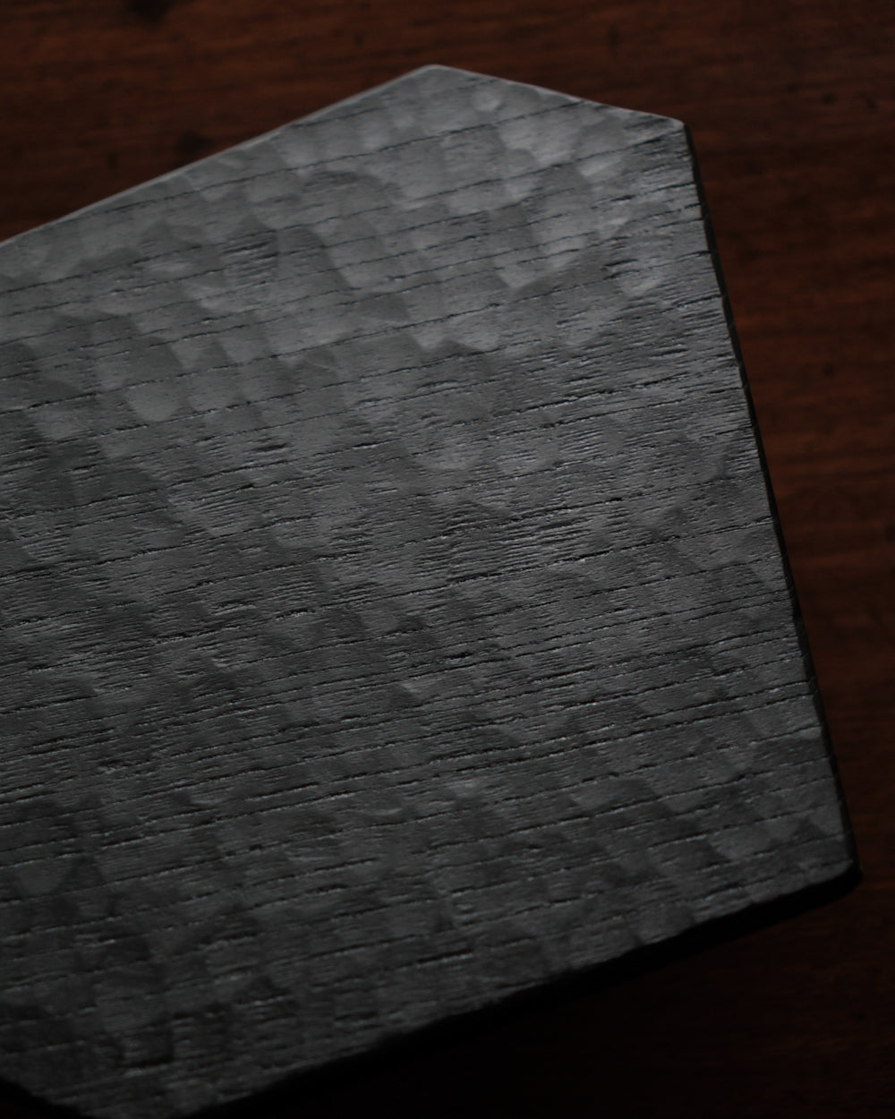 以自然木製作而成的木板皿,表面為大村使用鑿刀手工雕刻出來的紋路。適合用來盛放乾式料理,像是麵包與火腿、起司、生魚片、握壽司、炸物、蛋糕與甜點等。也可作為店舖與展覽中陳列的道具、花器之下的花台。深邃的黑色可以襯托料理和商品的顏色與氛圍。表面為自然漆塗層,便於清洗與照顧。