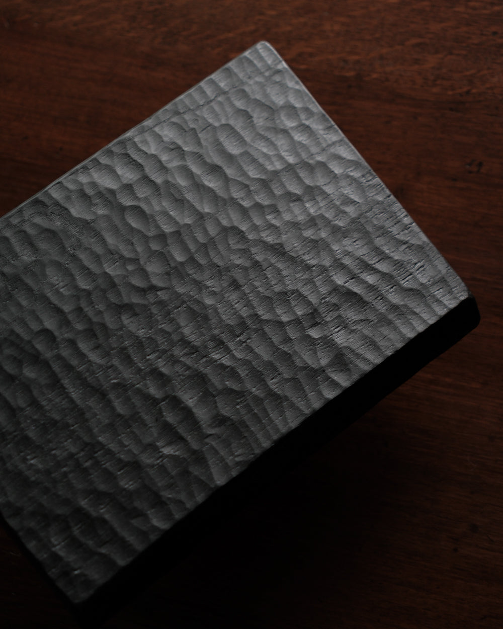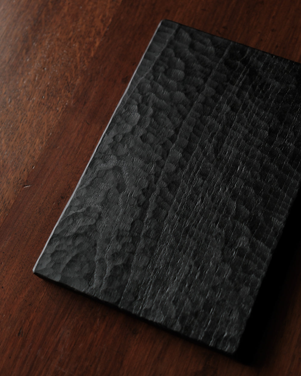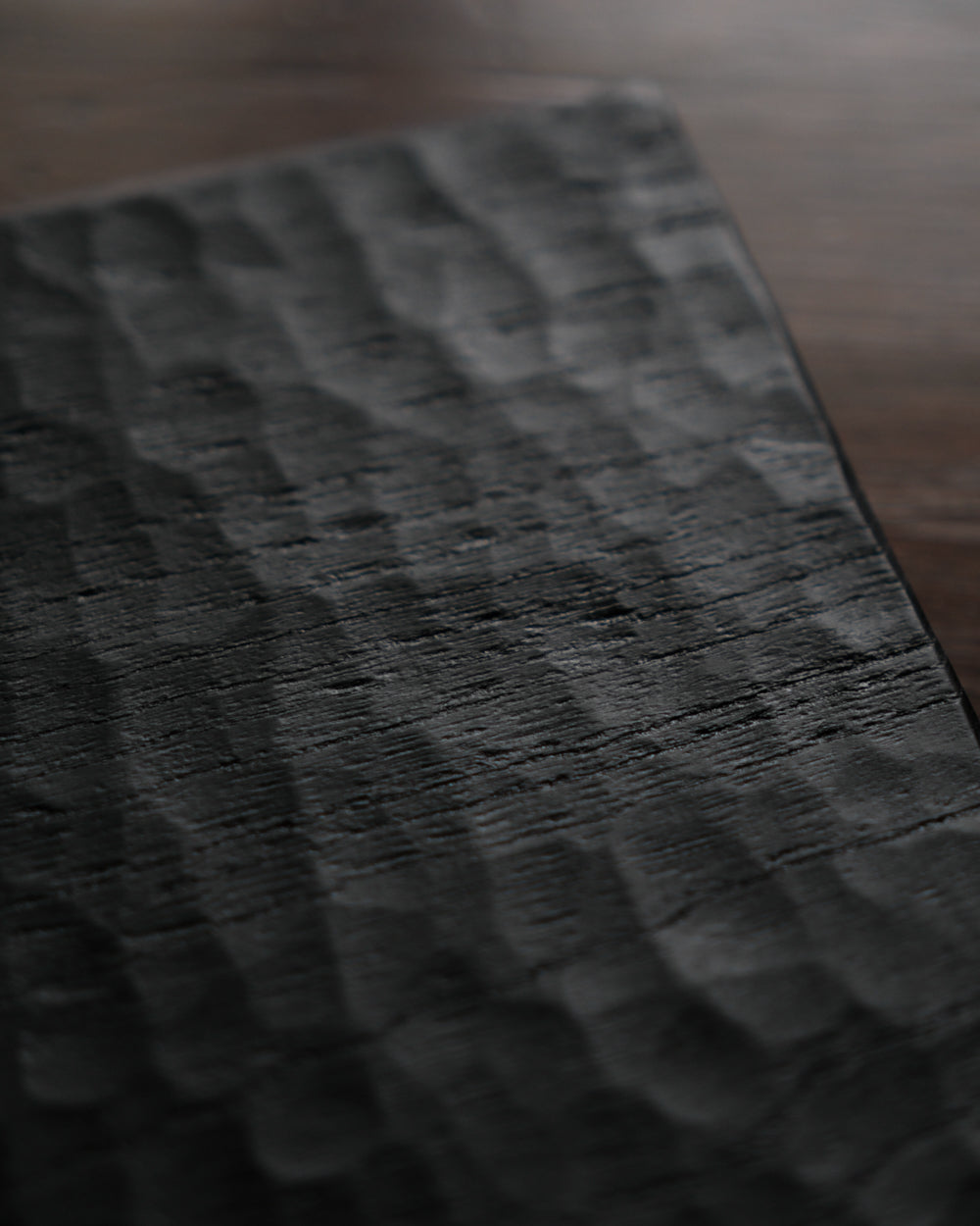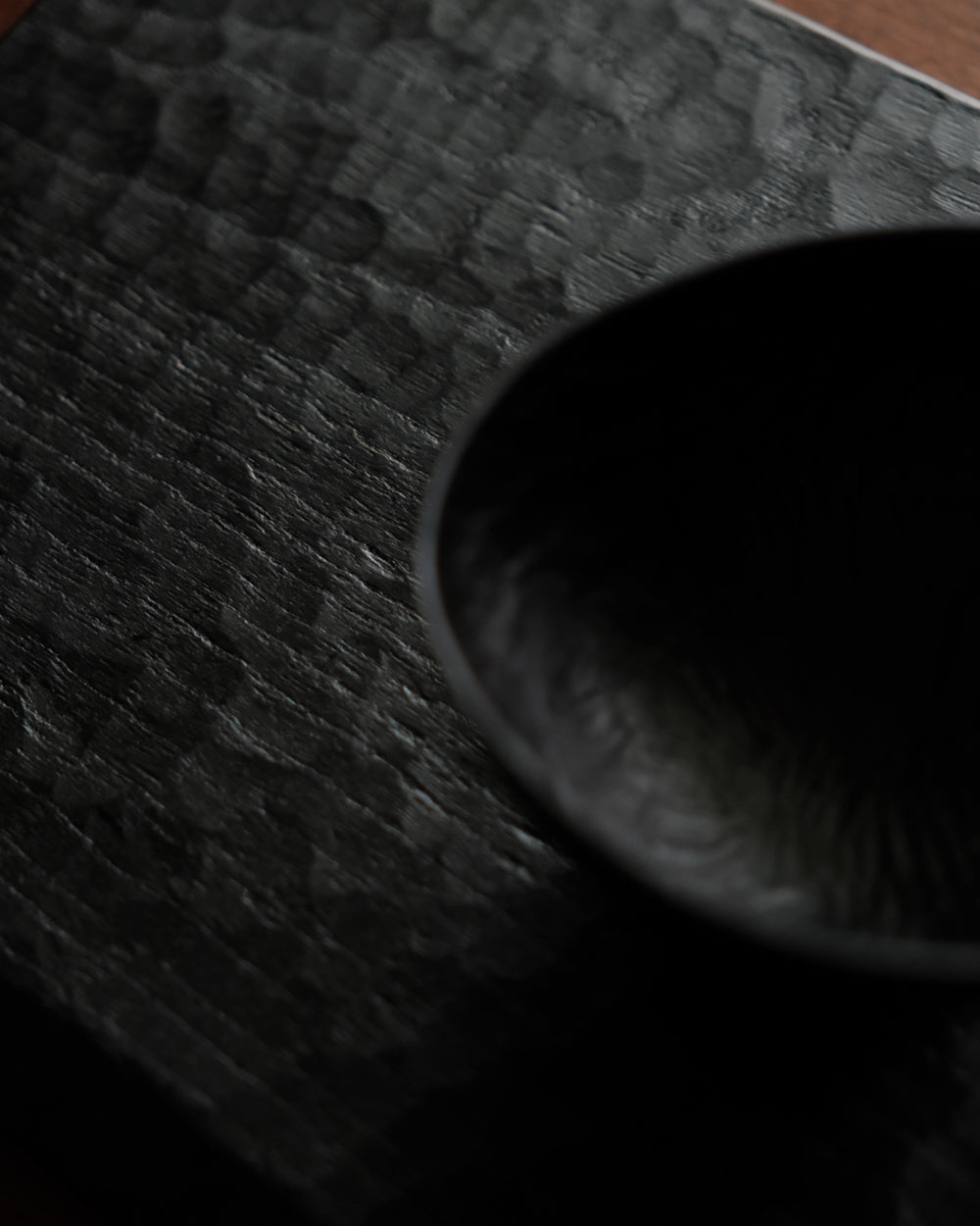 以自然木製作而成的木板皿,表面為大村使用鑿刀手工雕刻出來的紋路。適合用來盛放乾式料理,像是麵包與火腿、起司、生魚片、握壽司、炸物、蛋糕與甜點等。也可作為店舖與展覽中陳列的道具、花器之下的花台。深邃的黑色可以襯托料理和商品的顏色與氛圍。表面為自然漆塗層,便於清洗與照顧。