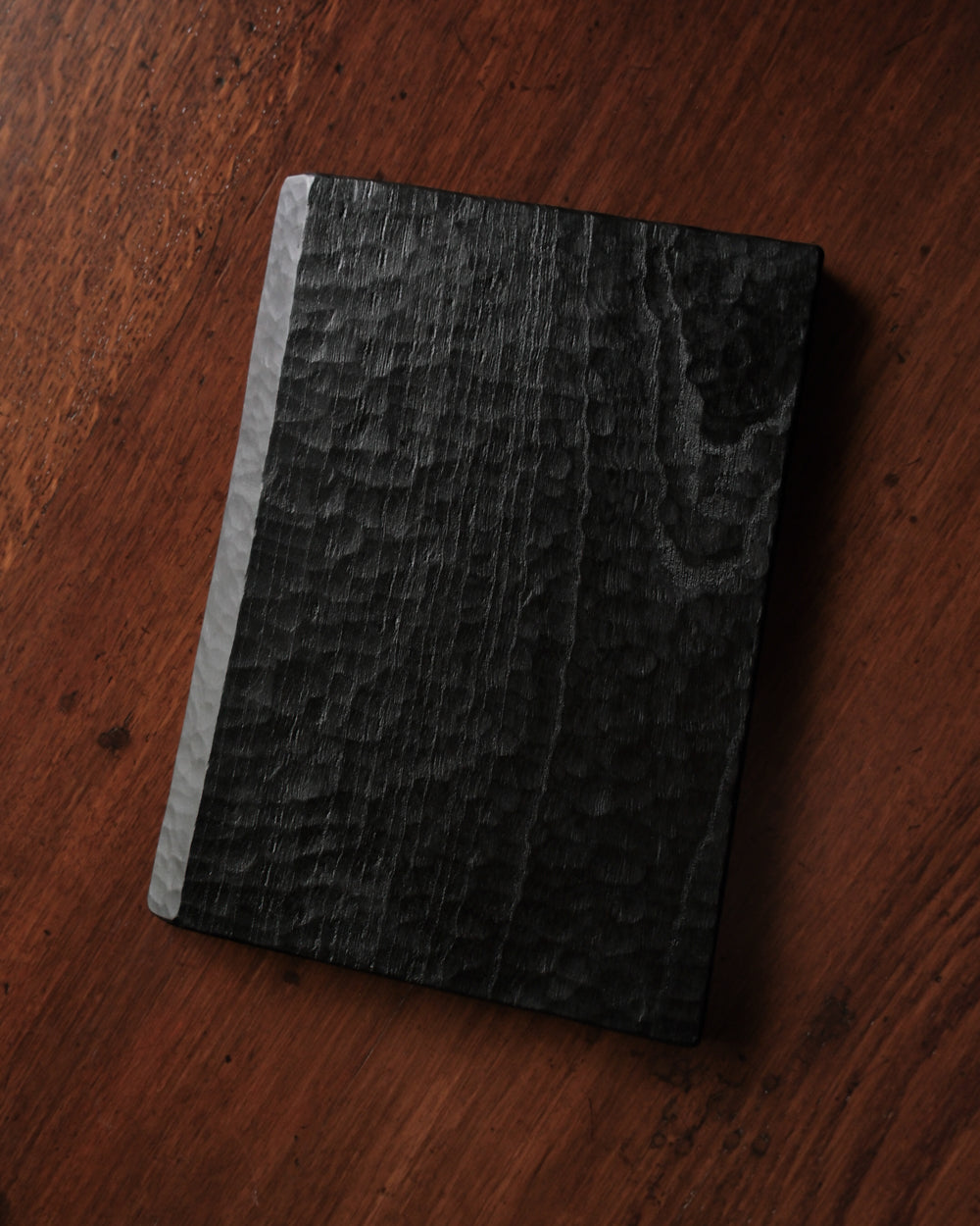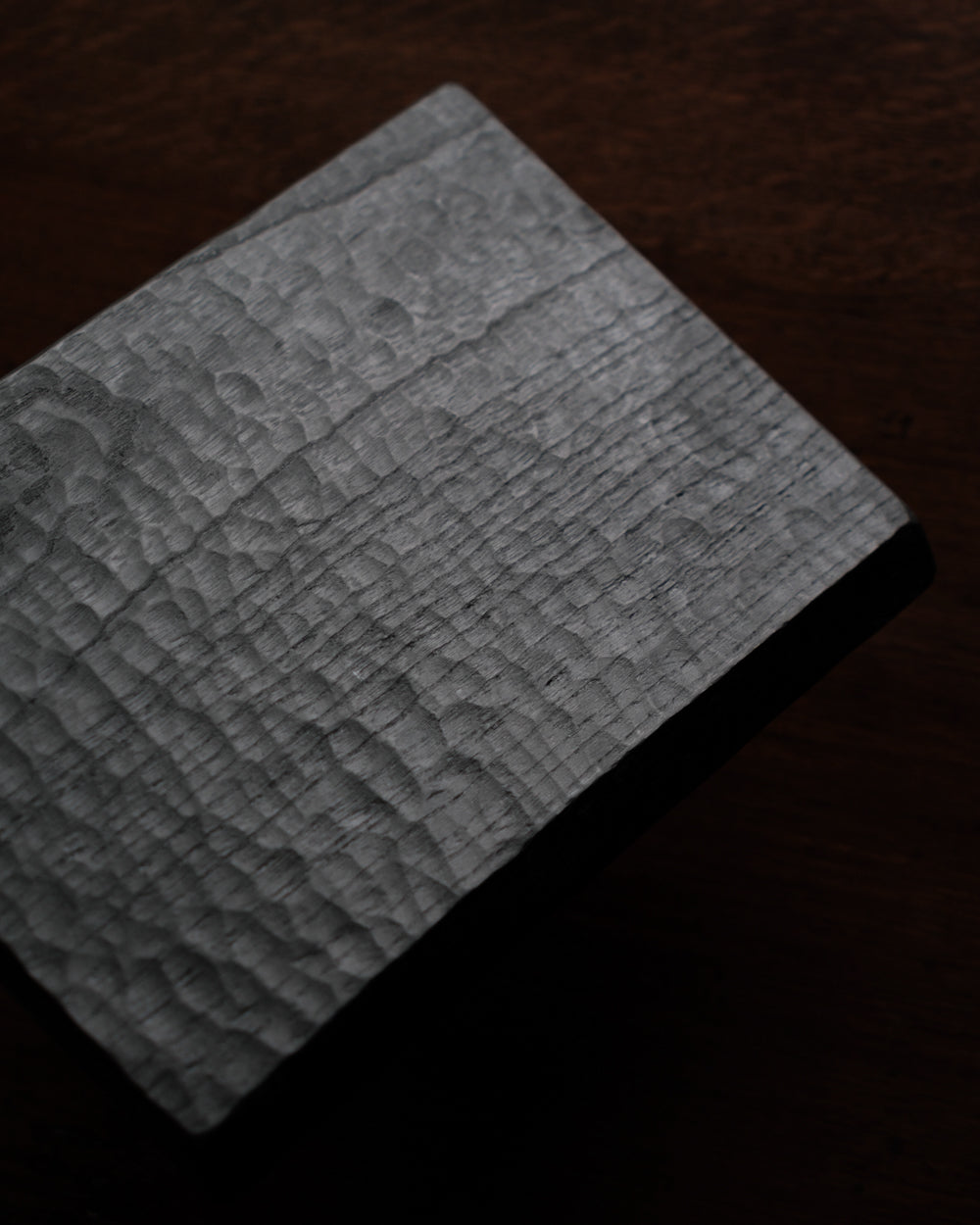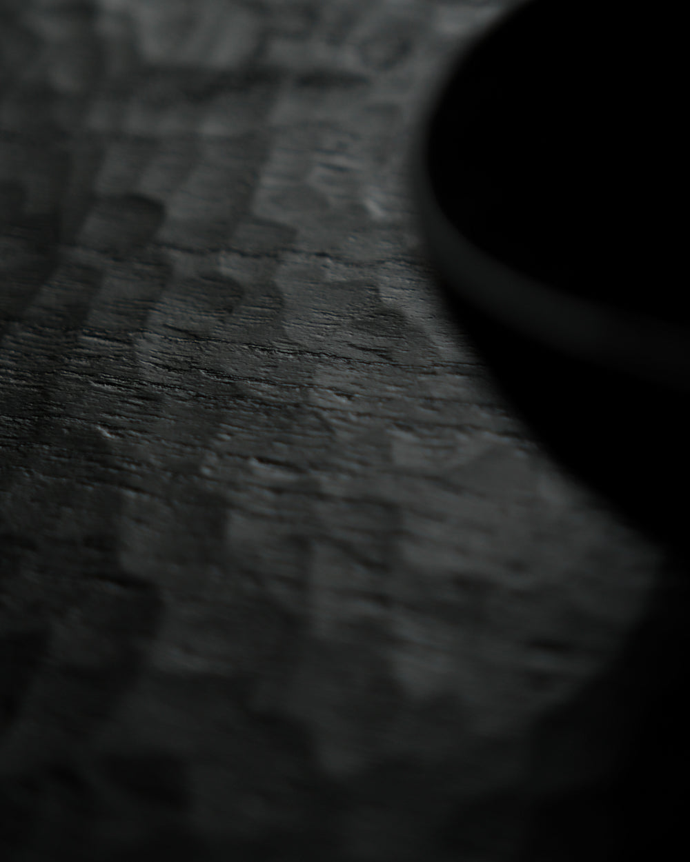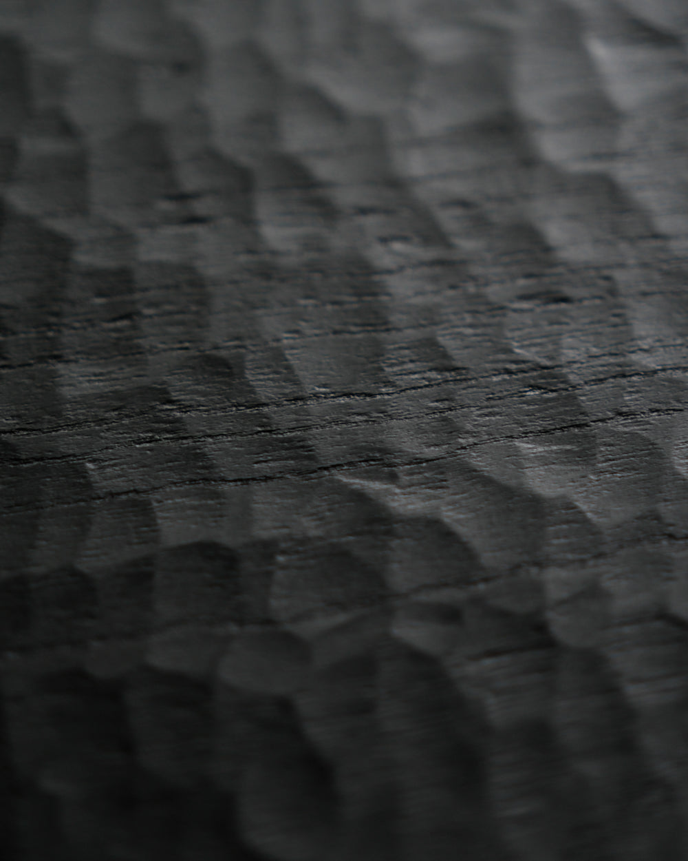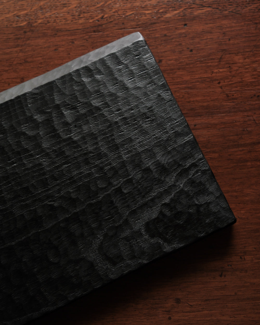 以自然木製作而成的木板皿,表面為大村使用鑿刀手工雕刻出來的紋路。適合用來盛放乾式料理,像是麵包與火腿、起司、生魚片、握壽司、炸物、蛋糕與甜點等。也可作為店舖與展覽中陳列的道具、花器之下的花台。深邃的黑色可以襯托料理和商品的顏色與氛圍。表面為自然漆塗層,便於清洗與照顧。