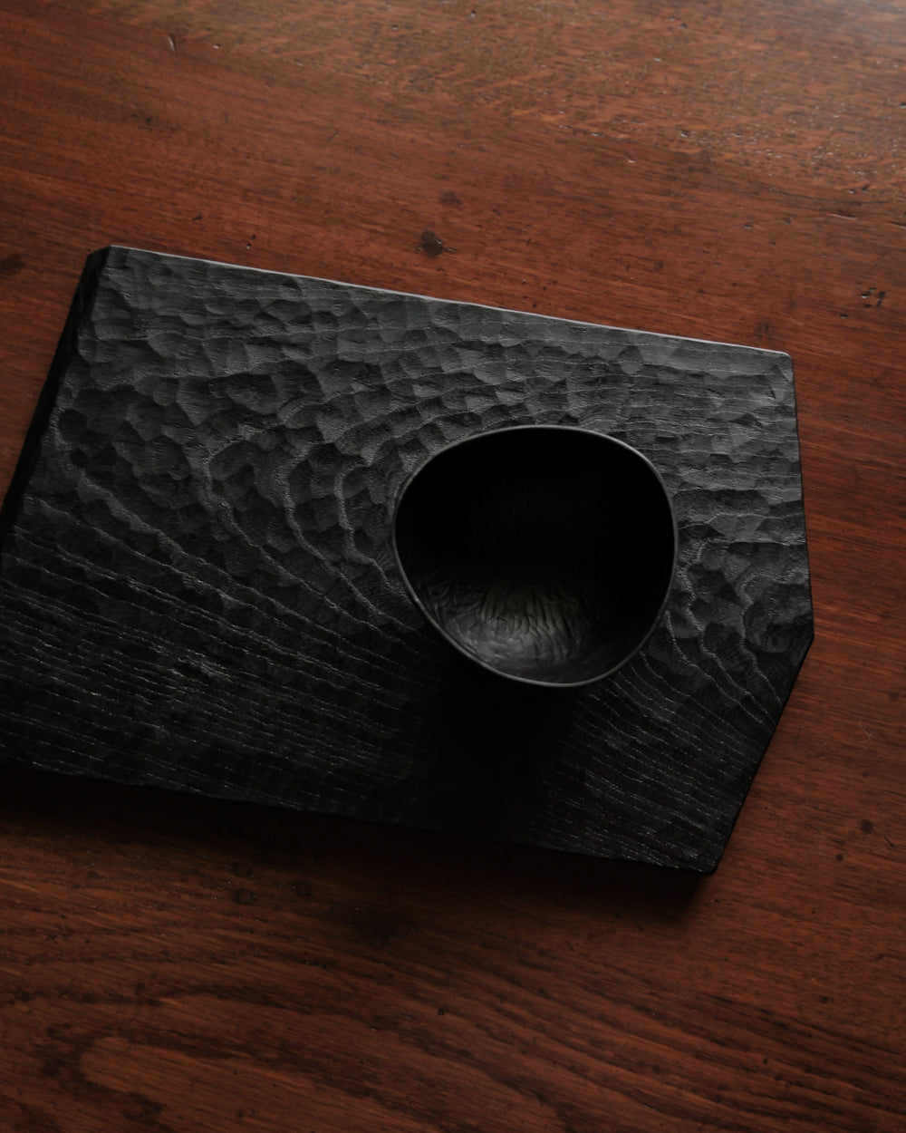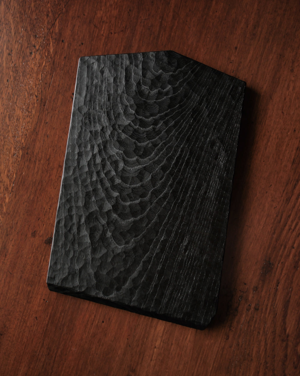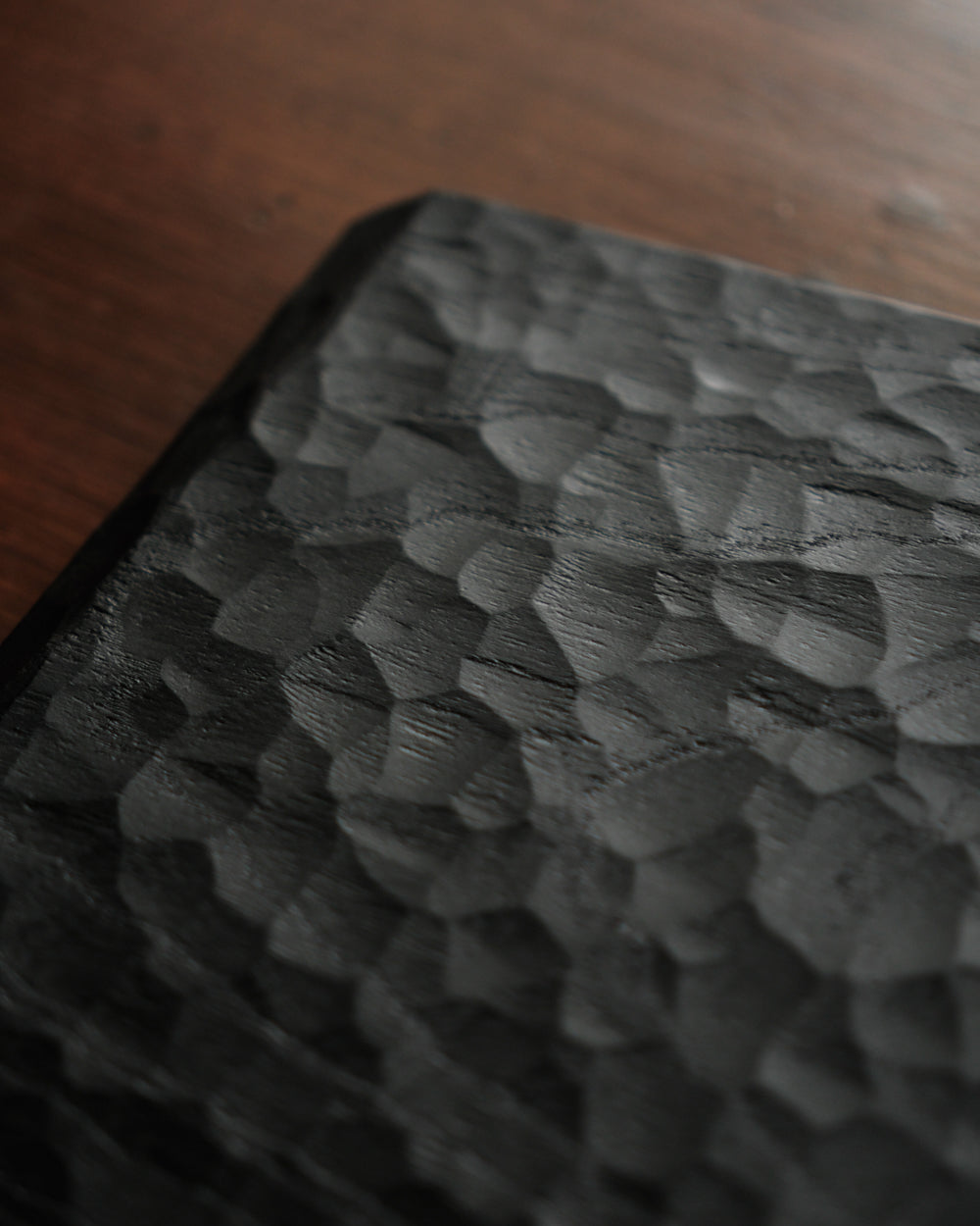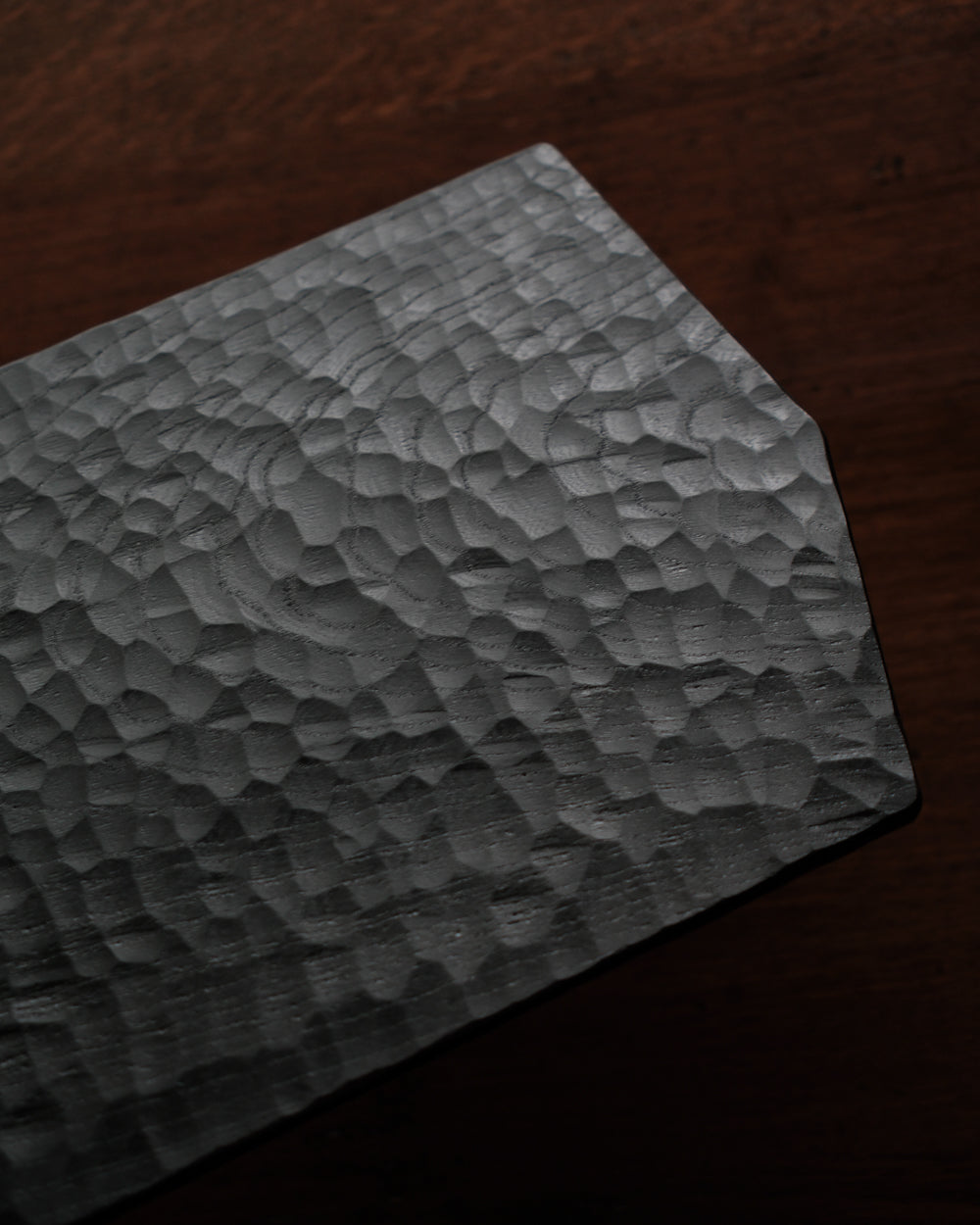 以自然木製作而成的木板皿,表面為大村使用鑿刀手工雕刻出來的紋路。適合用來盛放乾式料理,像是麵包與火腿、起司、生魚片、握壽司、炸物、蛋糕與甜點等。也可作為店舖與展覽中陳列的道具、花器之下的花台。深邃的黑色可以襯托料理和商品的顏色與氛圍。表面為自然漆塗層,便於清洗與照顧。