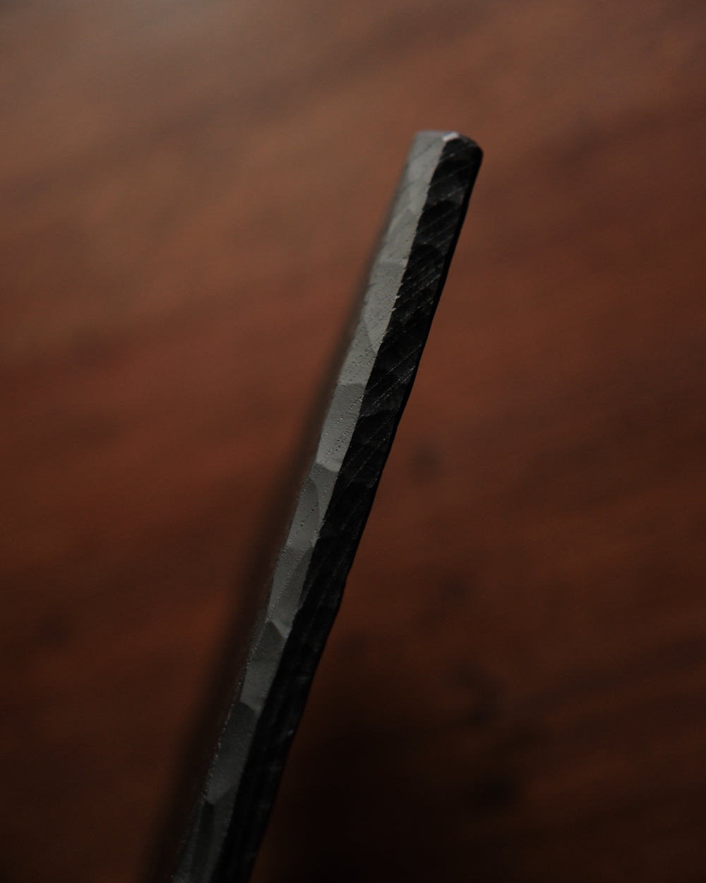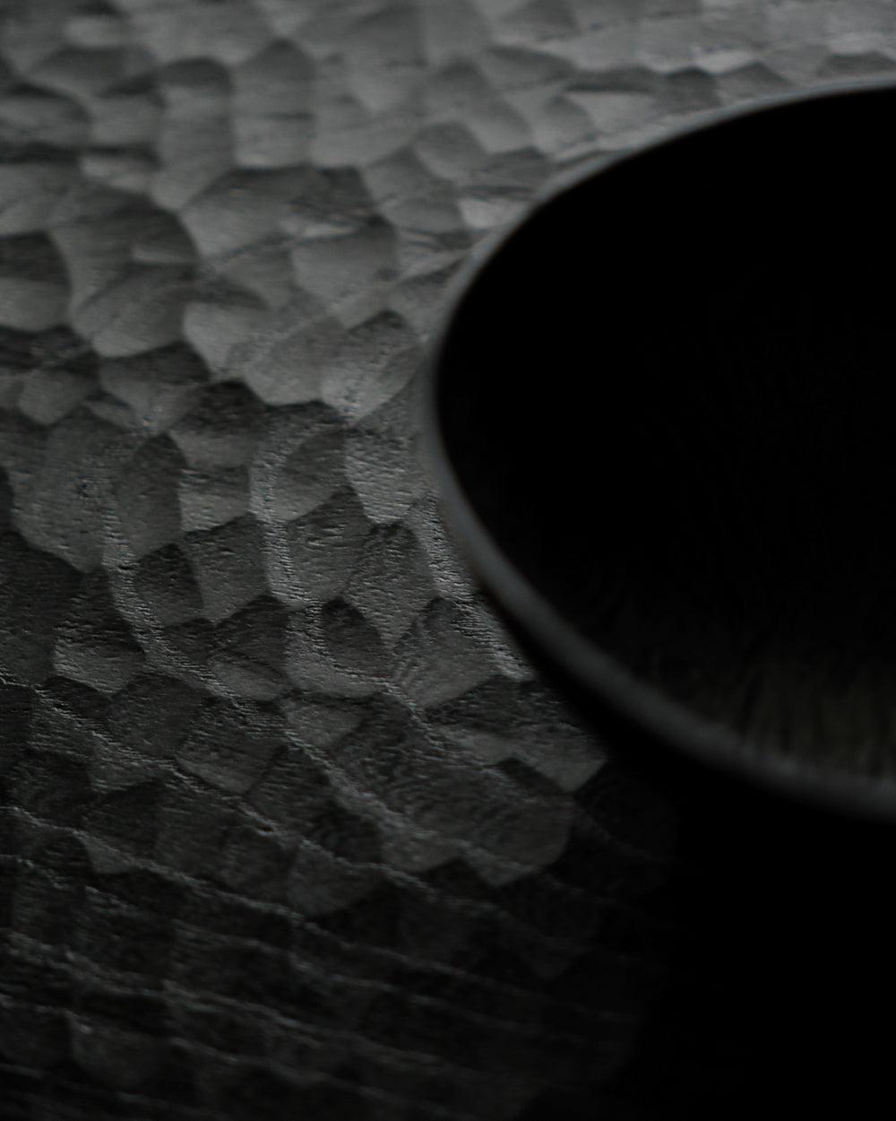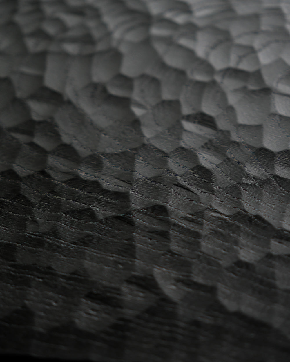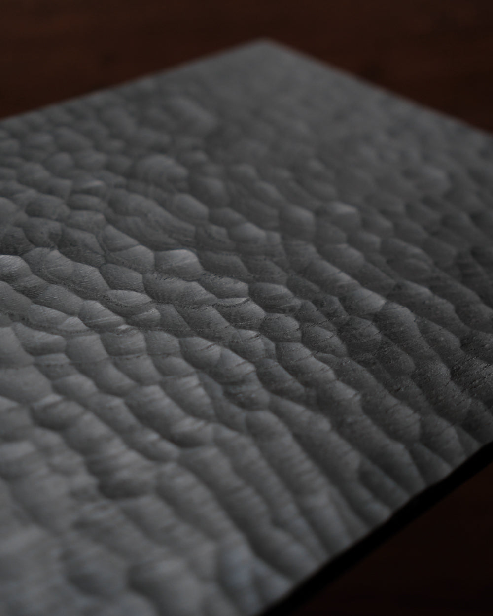 以自然木製作而成的木板皿,表面為大村使用鑿刀手工雕刻出來的紋路。適合用來盛放乾式料理,像是麵包與火腿、起司、生魚片、握壽司、炸物、蛋糕與甜點等。也可作為店舖與展覽中陳列的道具、花器之下的花台。深邃的黑色可以襯托料理和商品的顏色與氛圍。表面為自然漆塗層,便於清洗與照顧。