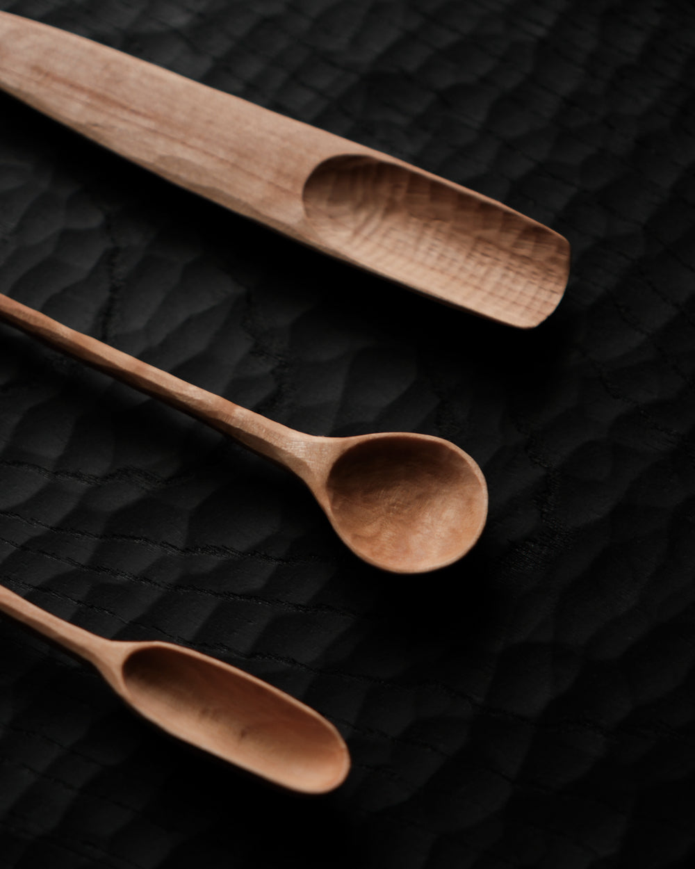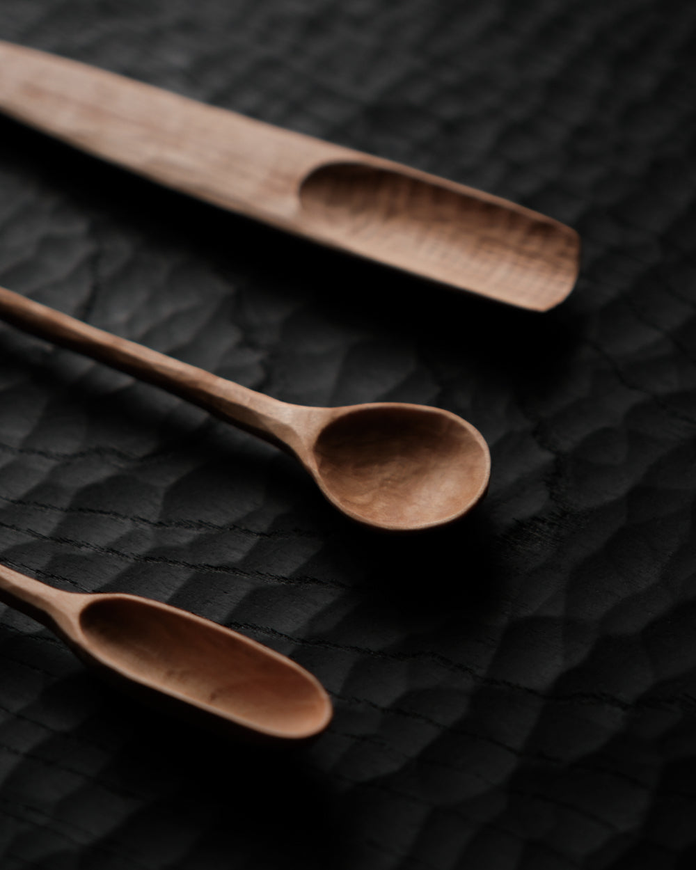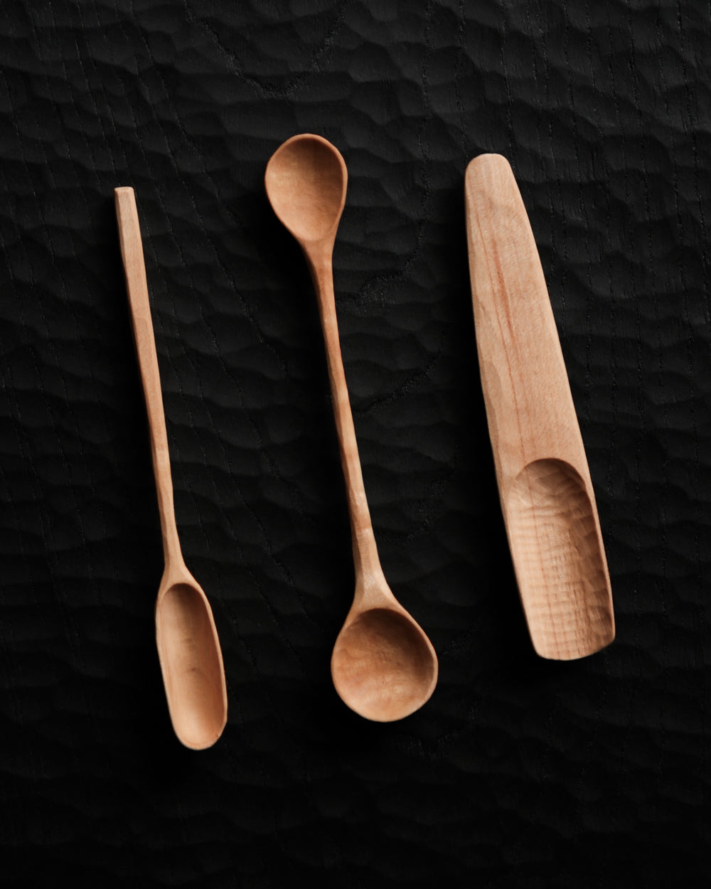 以自然木鑿刻的小木匙,適合作為鹽、糖等調味料與香料的測量匙使用。表面為自然漆塗層,便於清潔與照顧。