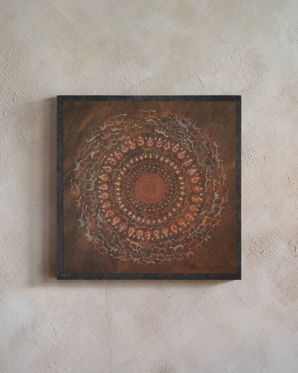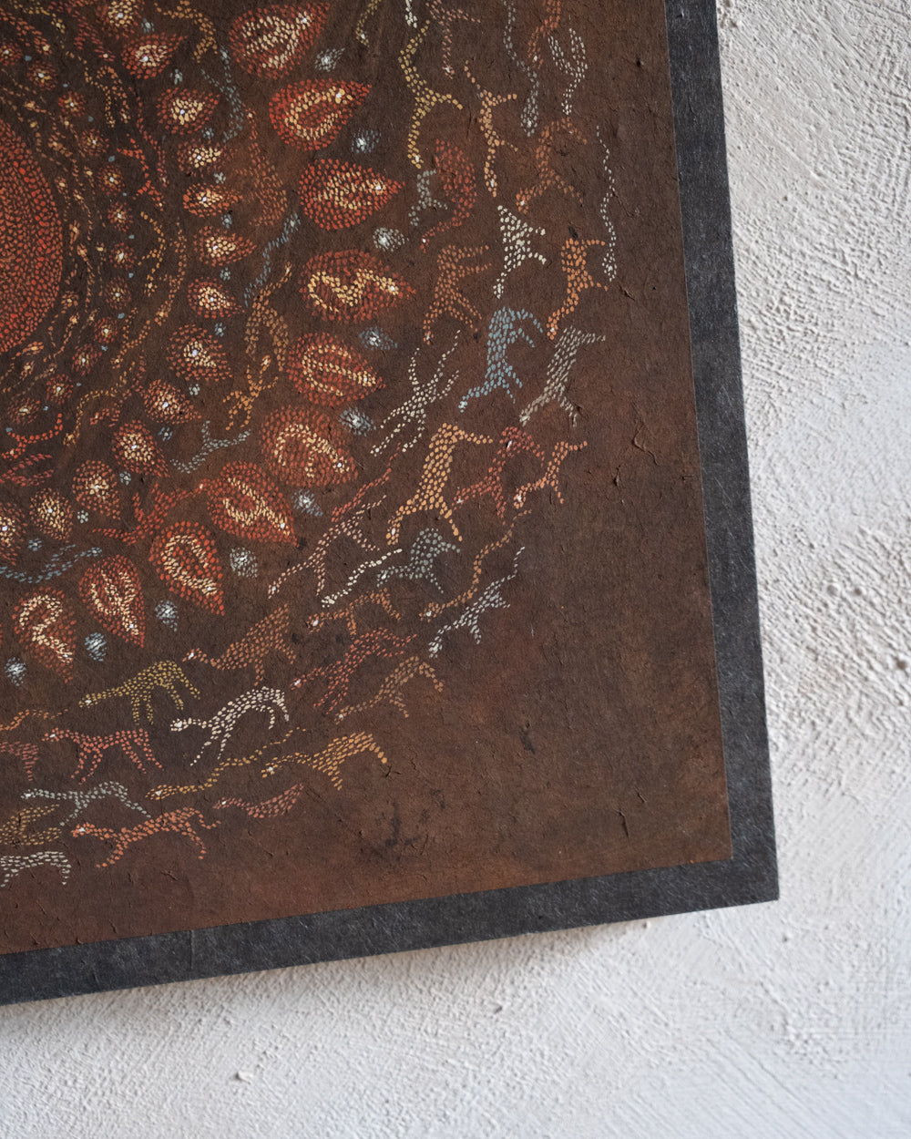這種生命聚集如太陽般的點描意象,如同映照生命歷史般,從細胞核開始,燃燒的小球誕生,各自獲得獨特形態,排列起來,形成如同「曼荼羅 Mandala」般的畫面。