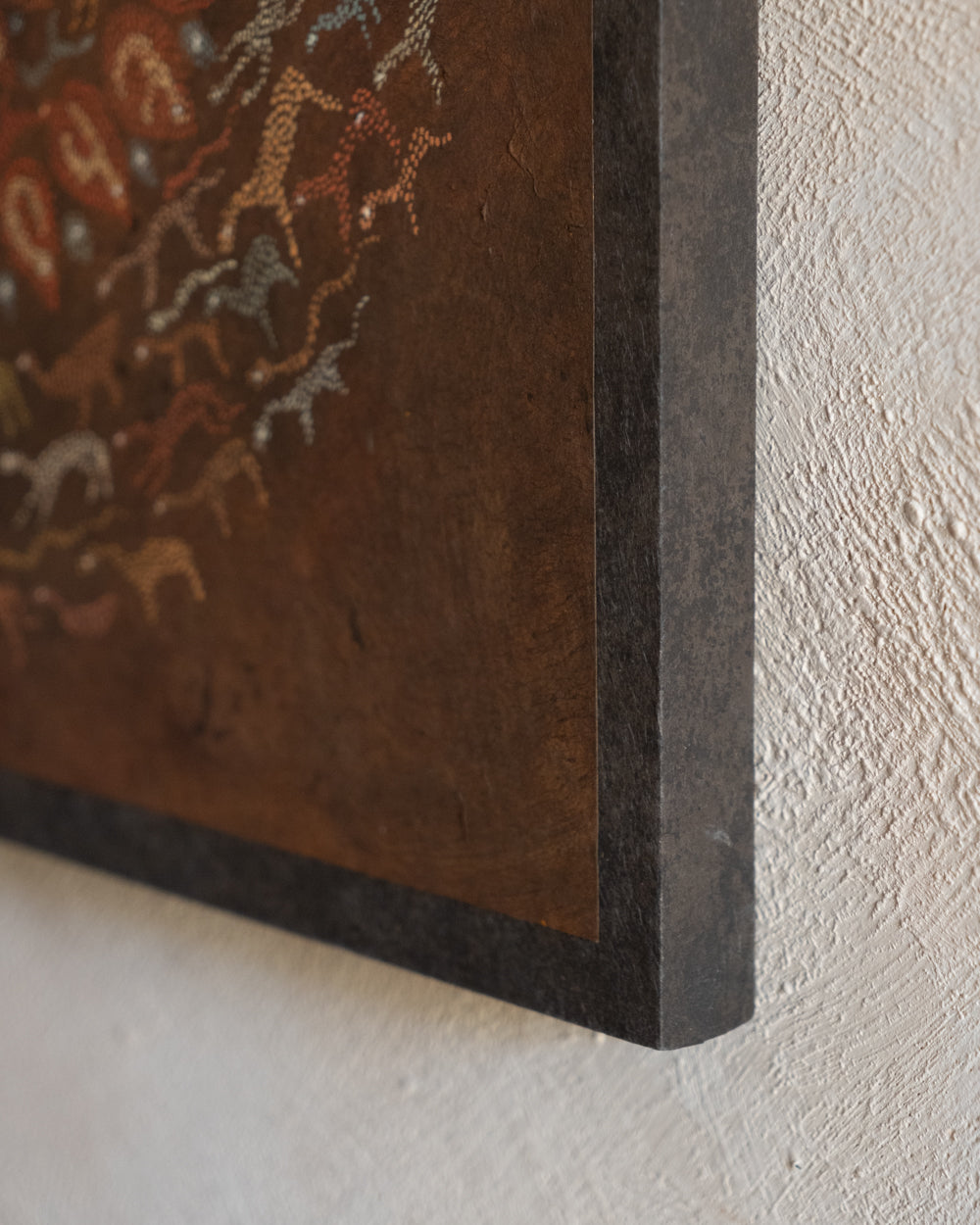 畫面的圖樣並無明確的方向性,縱橫無盡地填滿畫面,那種宛如孩子塗鴉般的自由與奔放,深深地吸引著我。 後來我開始以細筆和顏料代替針與線,臨摹這些刺繡布,用點來描繪生物的形態。」