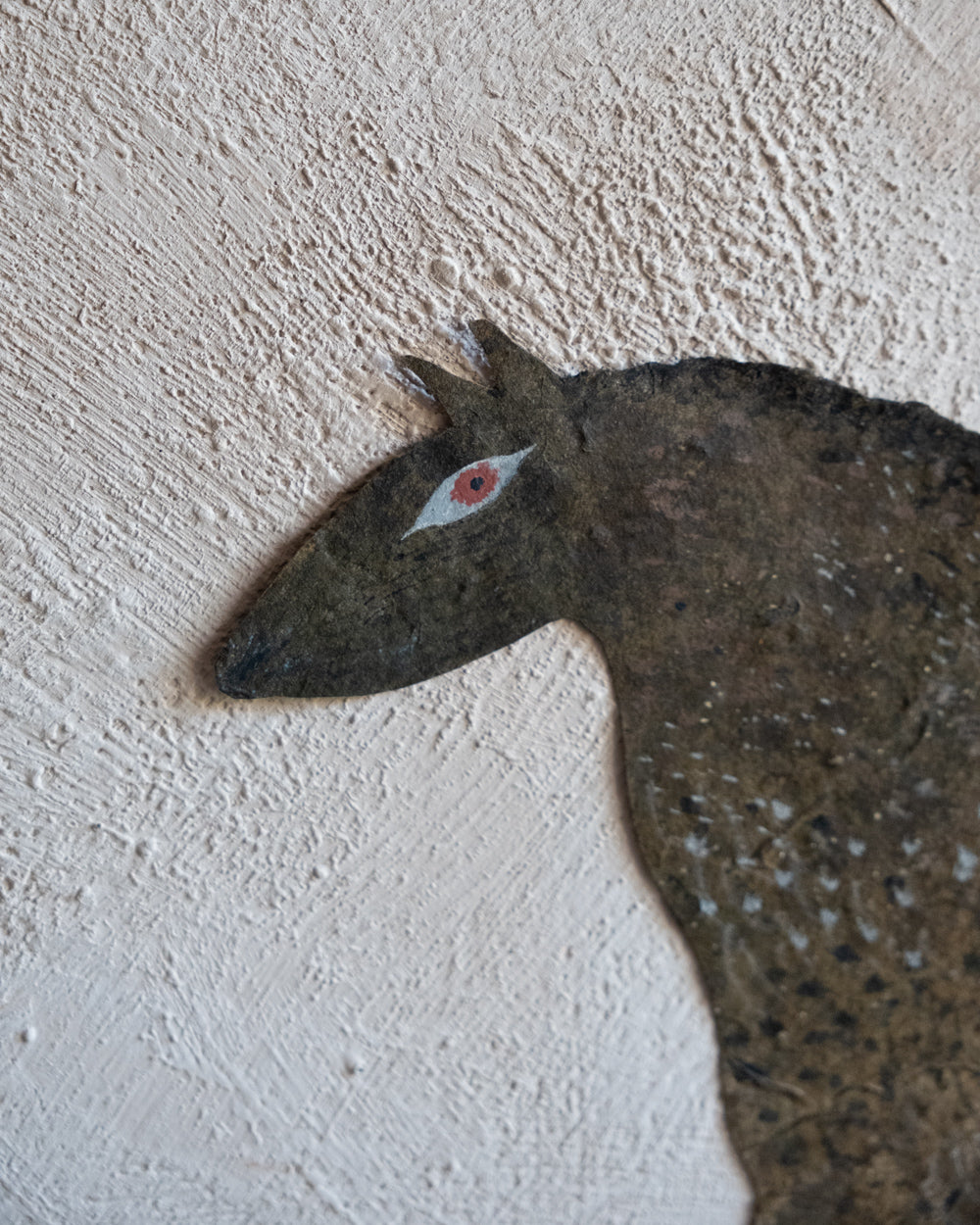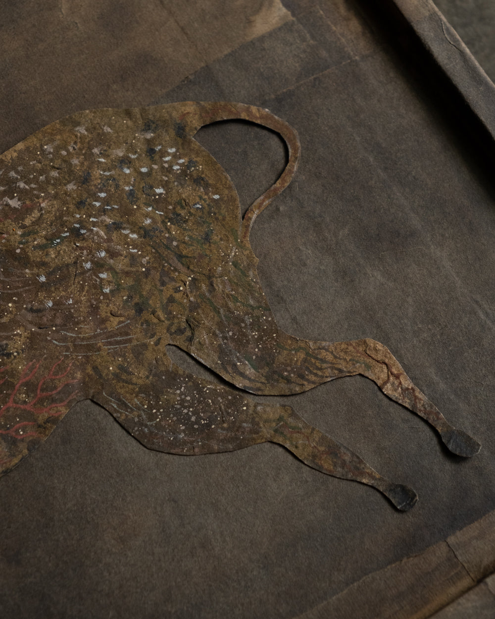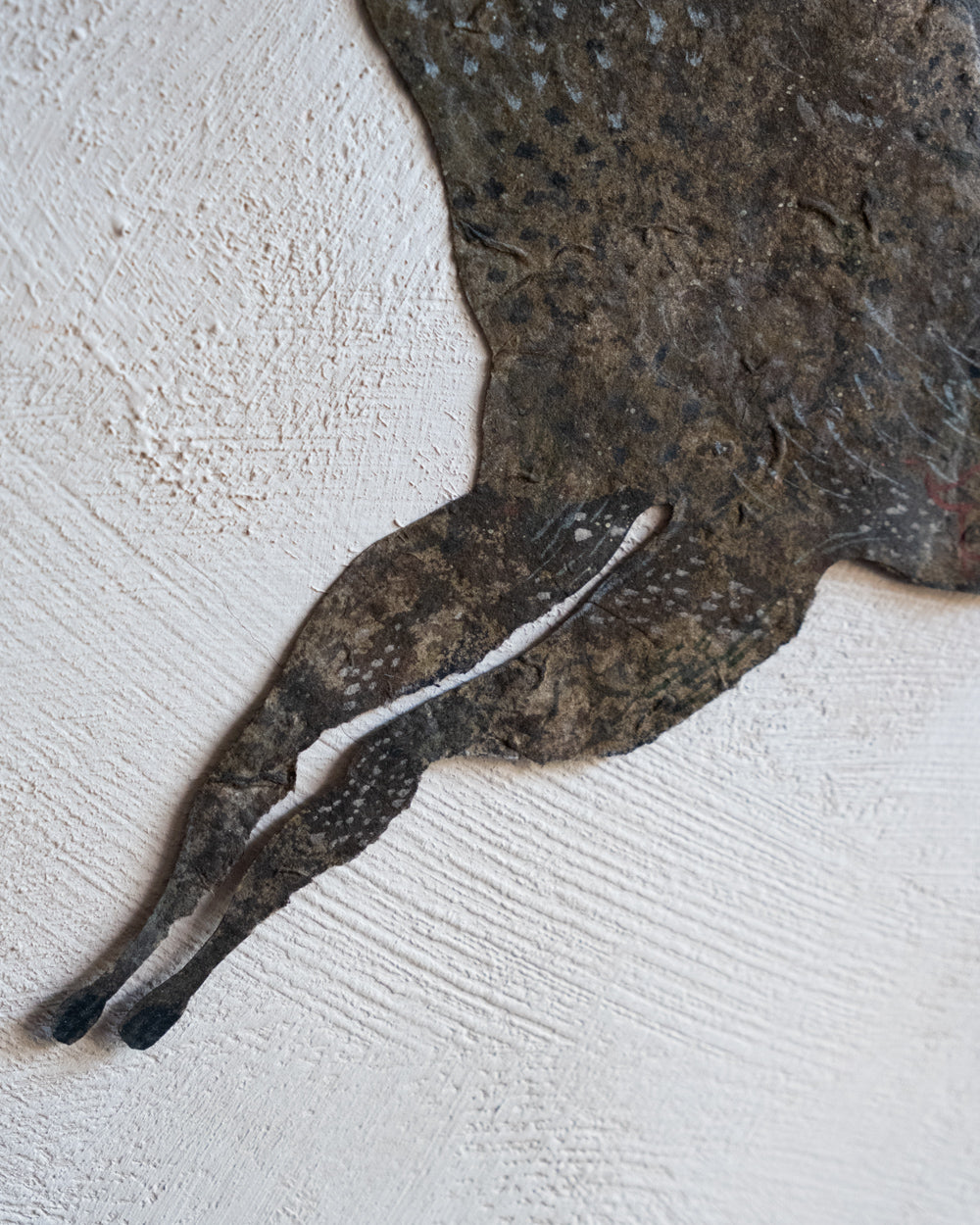 大約在五年前,熊谷遇見了名為Lokta的尼泊爾手工紙,從此他將這種有著自然紋理的紙當作岩壁,注入生命,訴說著無名的神話。熊谷移居至北海道後,大量描繪以鹿為主題的剪紙生物,在學習北方民族的文化信仰的過程中,他觀察到了許多以鹿、馴鹿、駝鹿為主題的壁畫與裝飾。在吸收這些元素的同時,他筆下剪紙生物們的眼神、體態、鹿角的形狀與花紋,也不斷地發生變化,而形成了現在的生物形貌。