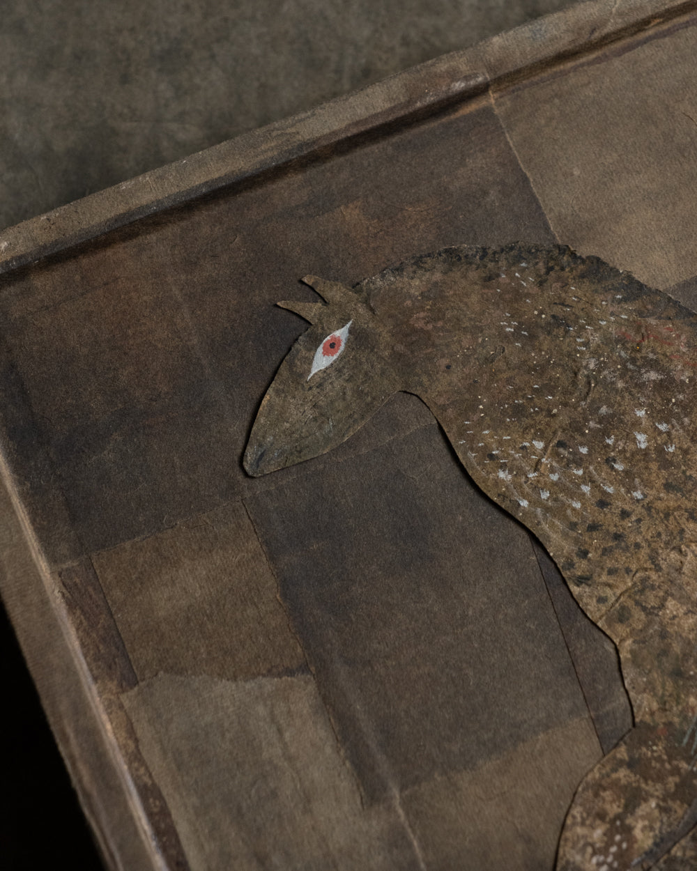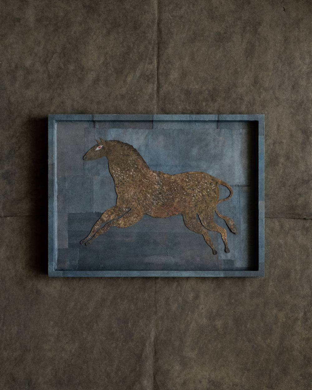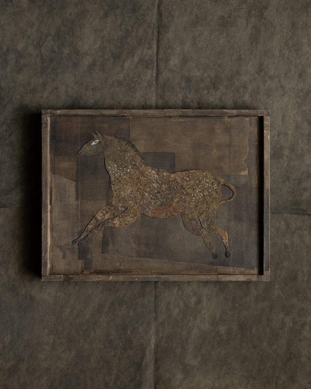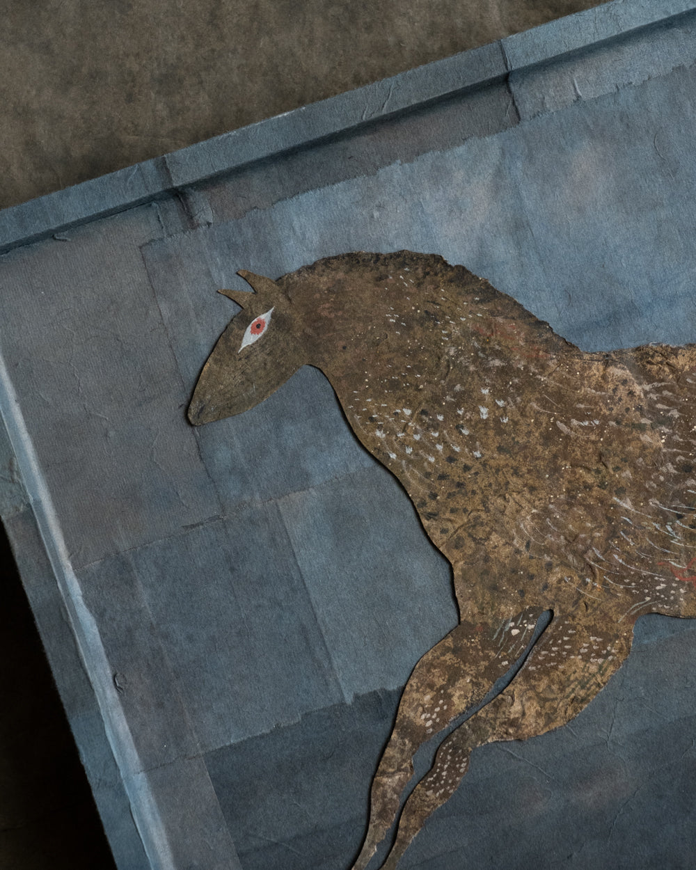 在這次《風之樹》展覽中,台灣作家Gyoku為熊谷隼人的「剪紙生物」製作手工紙敷染框,有「靛藍」與「咖啡」兩種色調,有著古布 boro 的質樸與溫度。以染紙為框,不僅讓作品更加完整,也讓熊谷隼人筆下充滿原始氣息的生物們,在光影之間顯得更加鮮活。