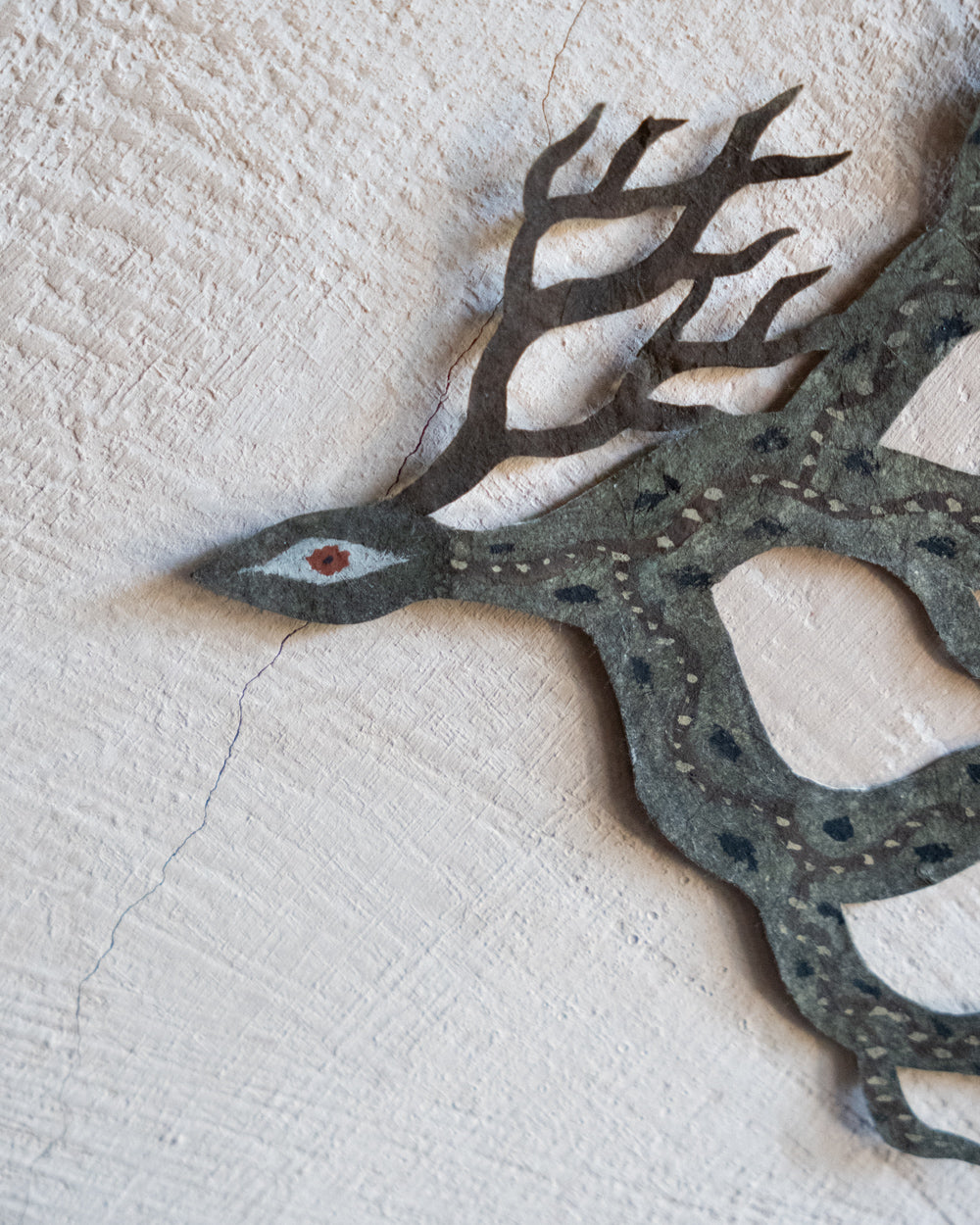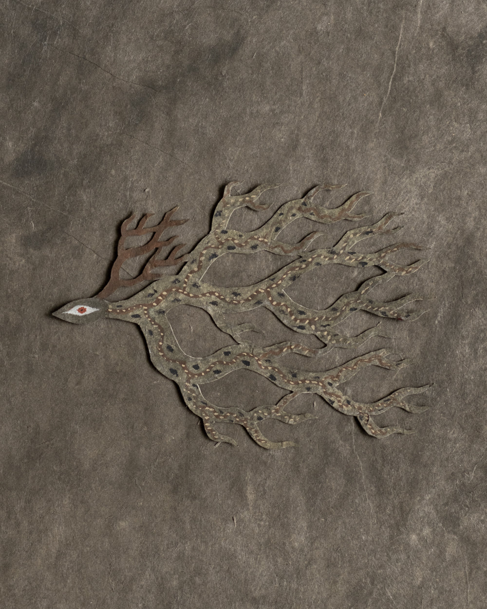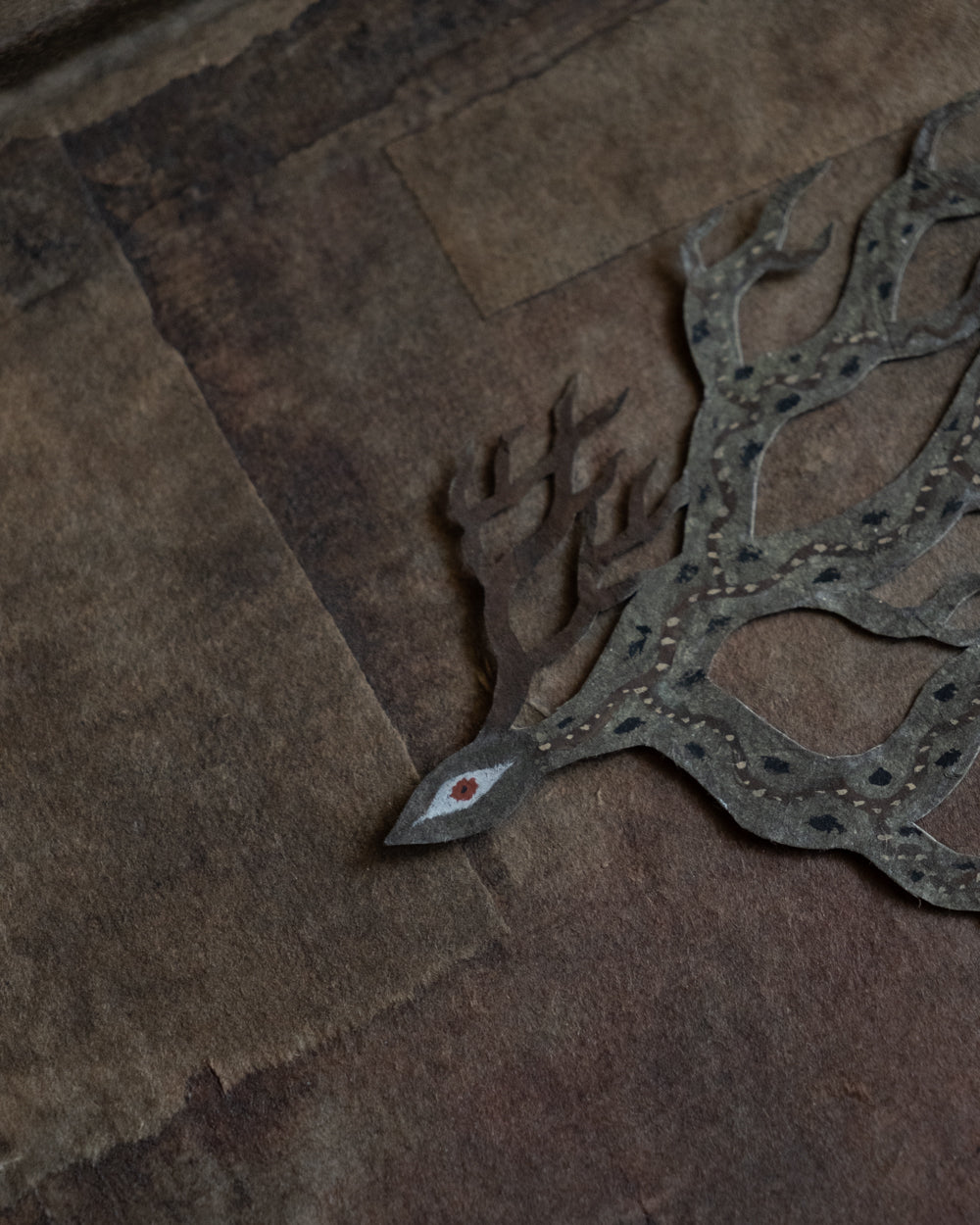 大約在五年前,熊谷遇見了名為Lokta的尼泊爾手工紙,從此他將這種有著自然紋理的紙當作岩壁,注入生命,訴說著無名的神話。熊谷移居至北海道後,大量描繪以鹿為主題的剪紙生物,在學習北方民族的文化信仰的過程中,他觀察到了許多以鹿、馴鹿、駝鹿為主題的壁畫與裝飾。在吸收這些元素的同時,他筆下剪紙生物們的眼神、體態、鹿角的形狀與花紋,也不斷地發生變化,而形成了現在的生物形貌。
