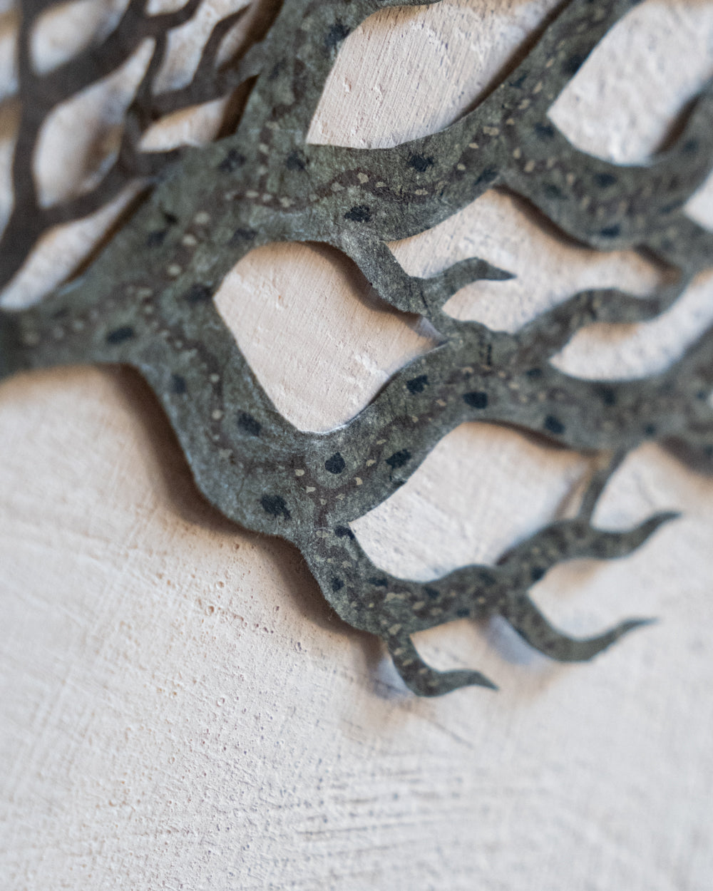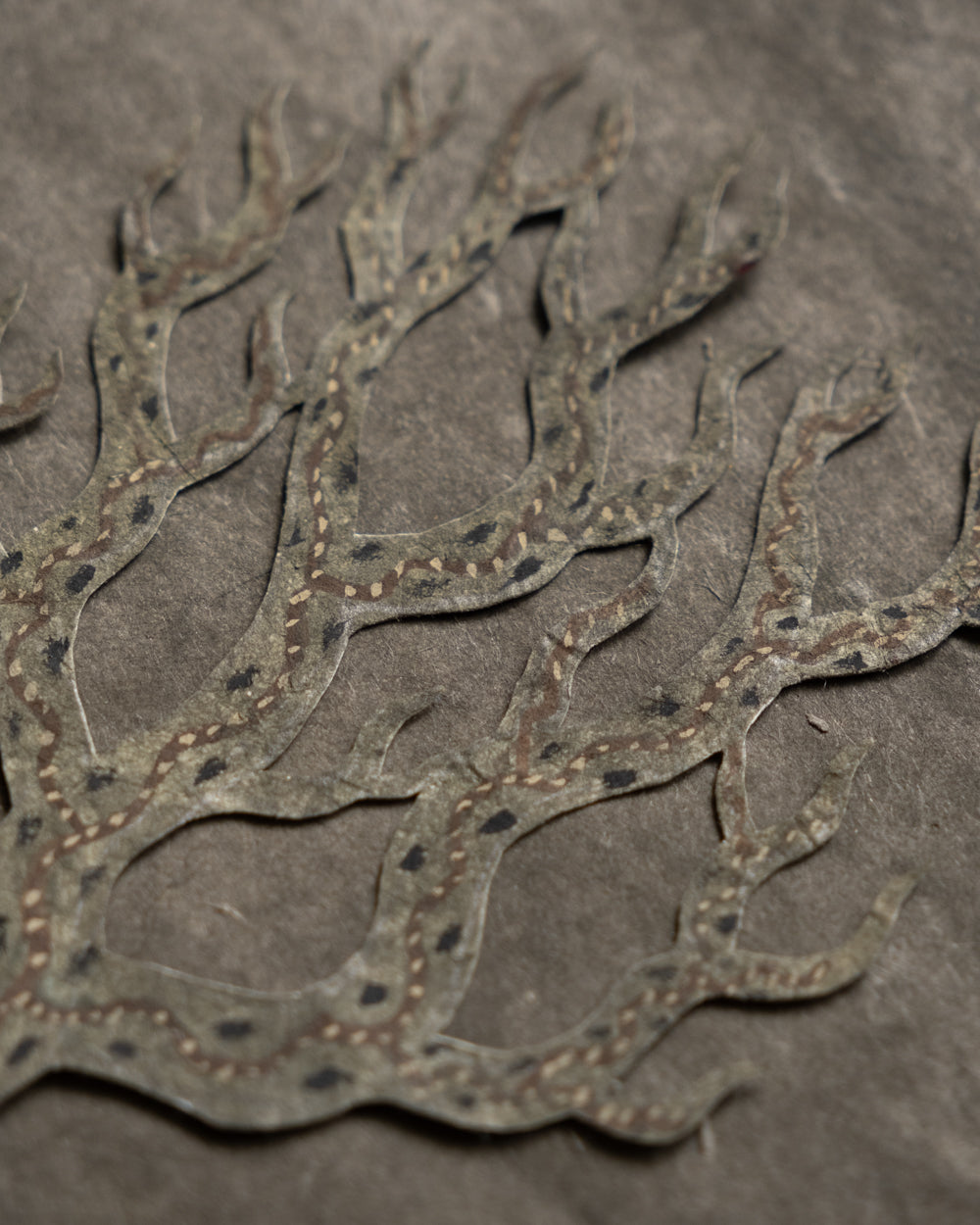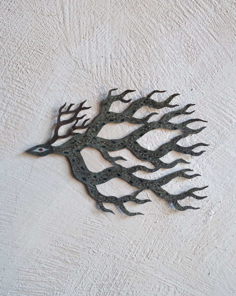 大約在五年前,熊谷遇見了名為Lokta的尼泊爾手工紙,從此他將這種有著自然紋理的紙當作岩壁,注入生命,訴說著無名的神話。熊谷移居至北海道後,大量描繪以鹿為主題的剪紙生物,在學習北方民族的文化信仰的過程中,他觀察到了許多以鹿、馴鹿、駝鹿為主題的壁畫與裝飾。在吸收這些元素的同時,他筆下剪紙生物們的眼神、體態、鹿角的形狀與花紋,也不斷地發生變化,而形成了現在的生物形貌。