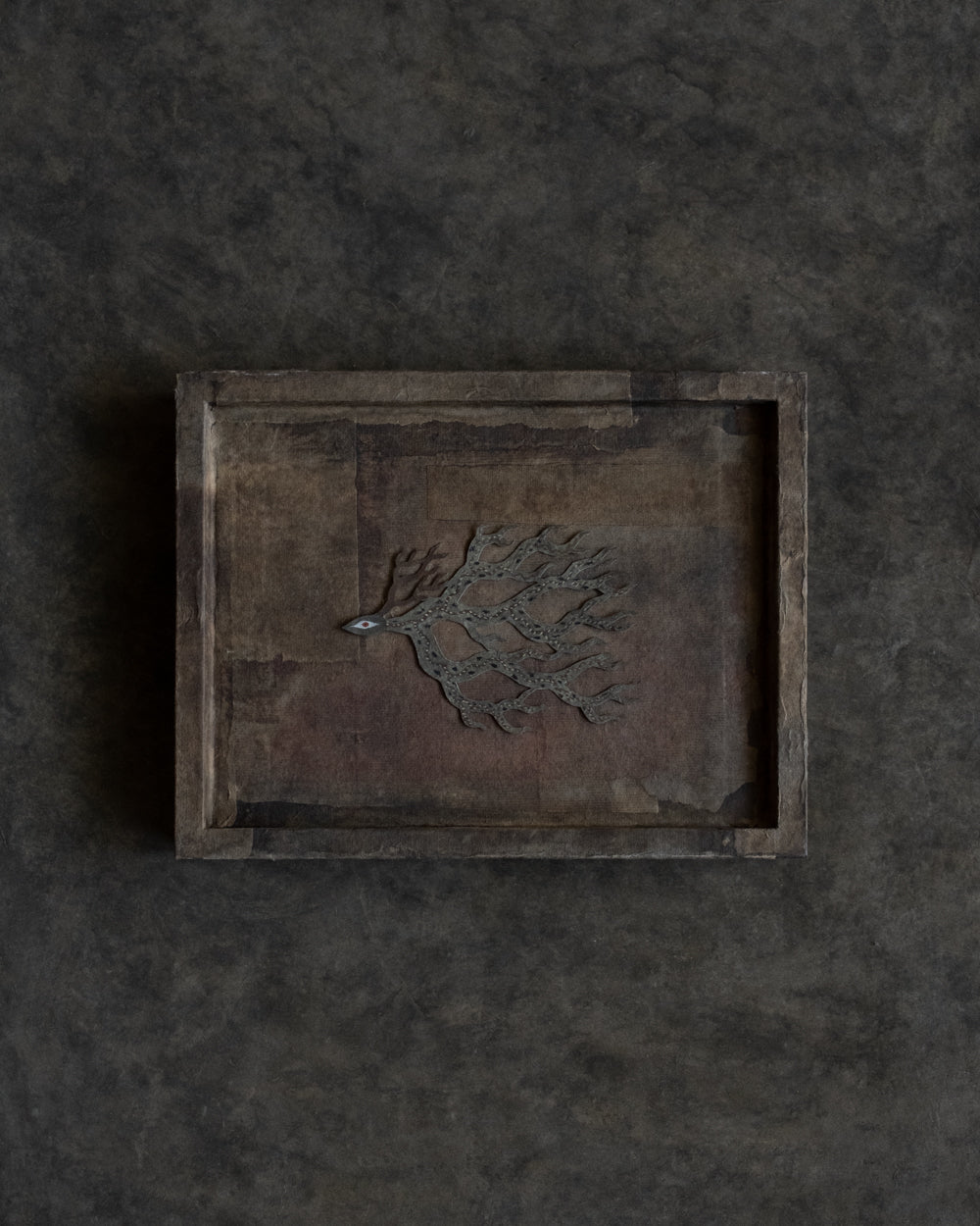 在這次《風之樹》展覽中,台灣作家Gyoku為熊谷隼人的「剪紙生物」製作手工紙敷染框,有「靛藍」與「咖啡」兩種色調,有著古布 boro 的質樸與溫度。以染紙為框,不僅讓作品更加完整,也讓熊谷隼人筆下充滿原始氣息的生物們,在光影之間顯得更加鮮活。