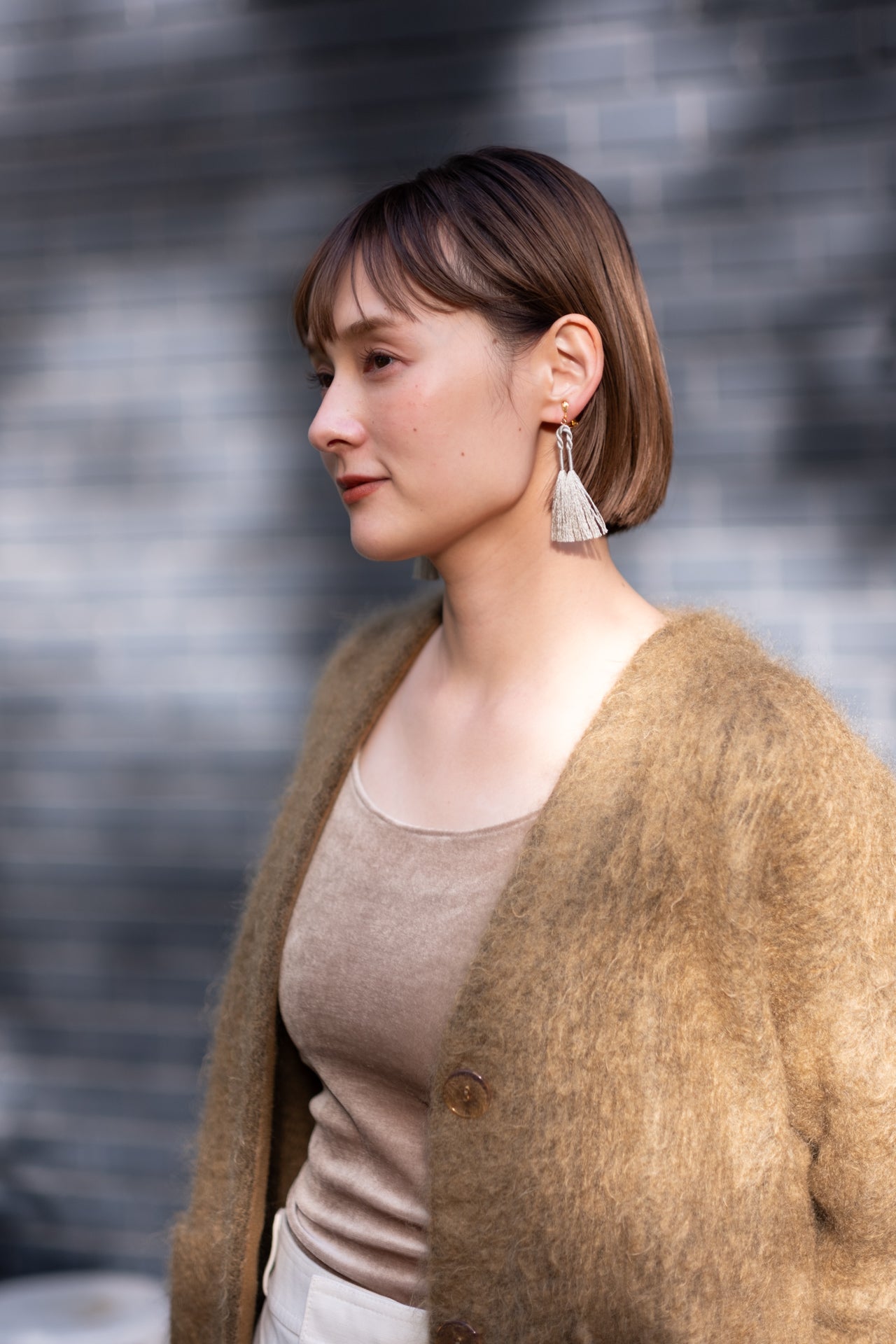 野生蠶絲線親膚柔軟,隨著擺動輕盈搖曳,映出溫和的光澤。內部編入看不見的不鏽鋼線,支撐並維持拱形的優美輪廓。