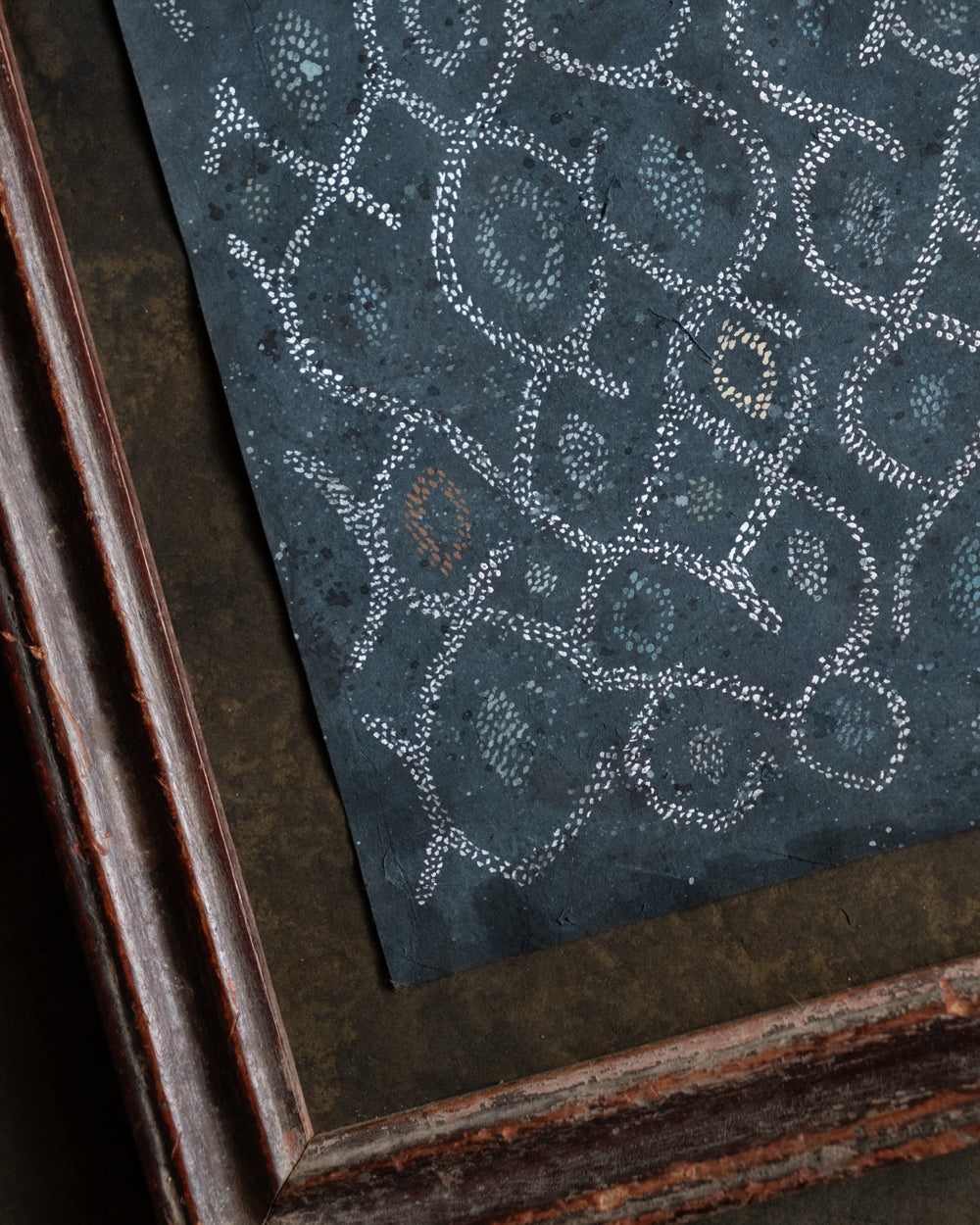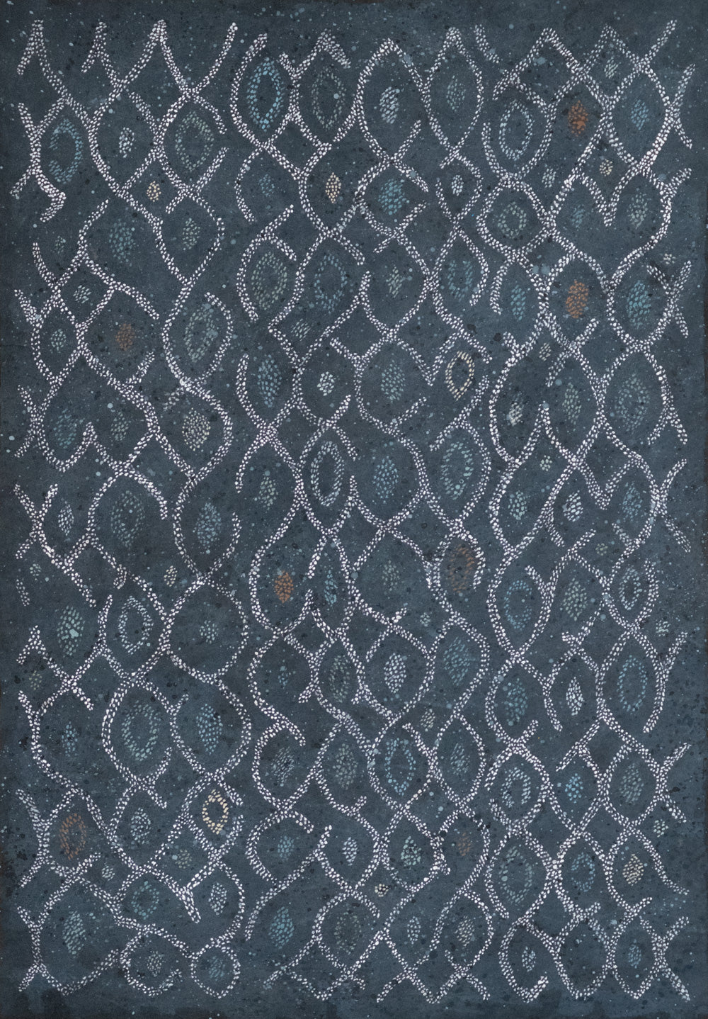 熊谷的點描繪畫,以洞窟般的土色或夜空的靛藍作為底色,灑落各種色點。從點到線,再到面的緩慢發展之中,各種形象的痕跡浮現而出。