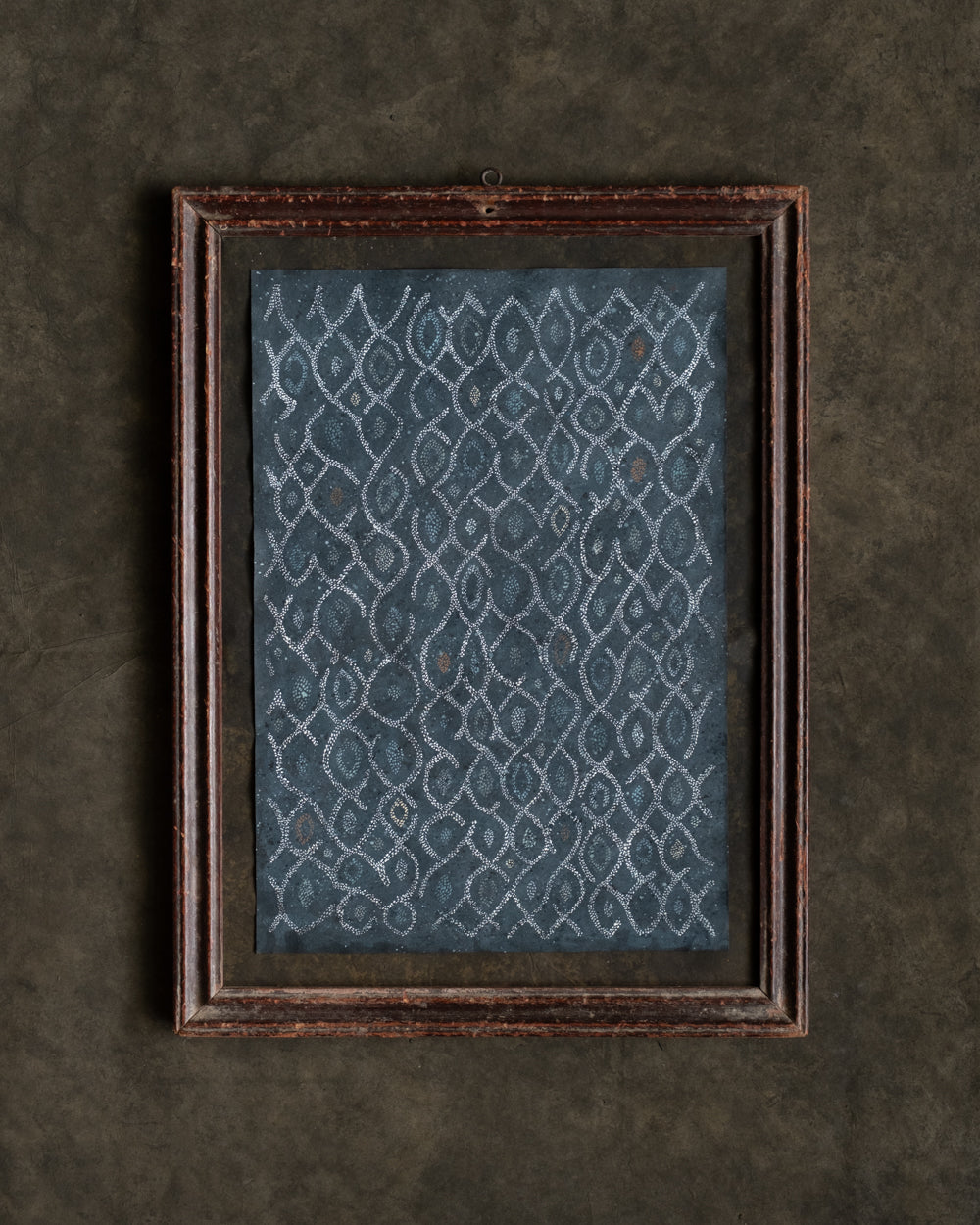 畫面的圖樣並無明確的方向性,縱橫無盡地填滿畫面,那種宛如孩子塗鴉般的自由與奔放,深深地吸引著我。 後來我開始以細筆和顏料代替針與線,臨摹這些刺繡布,用點來描繪生物的形態。」