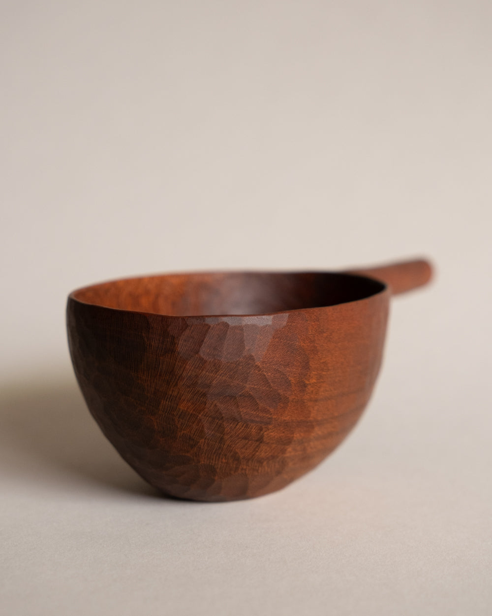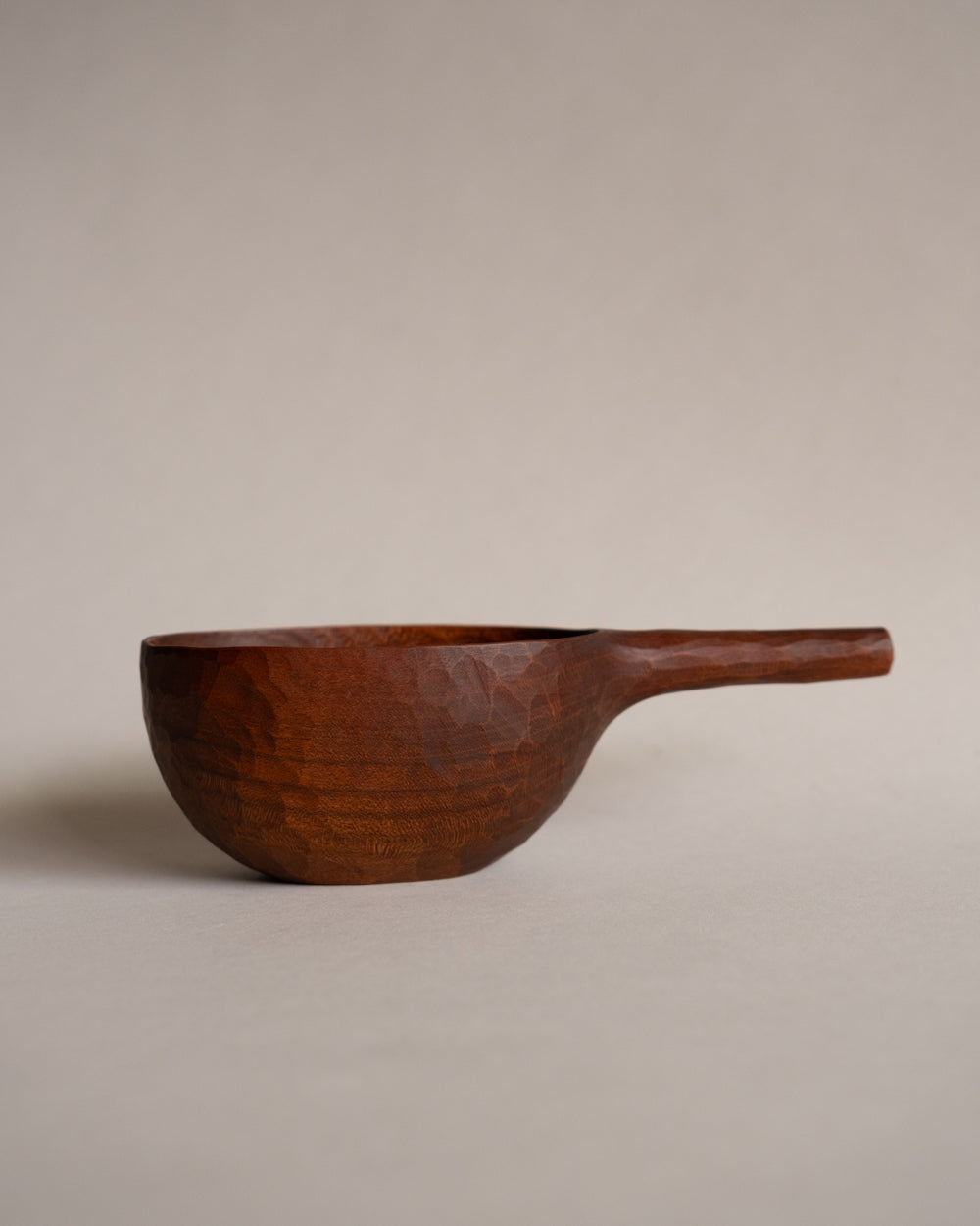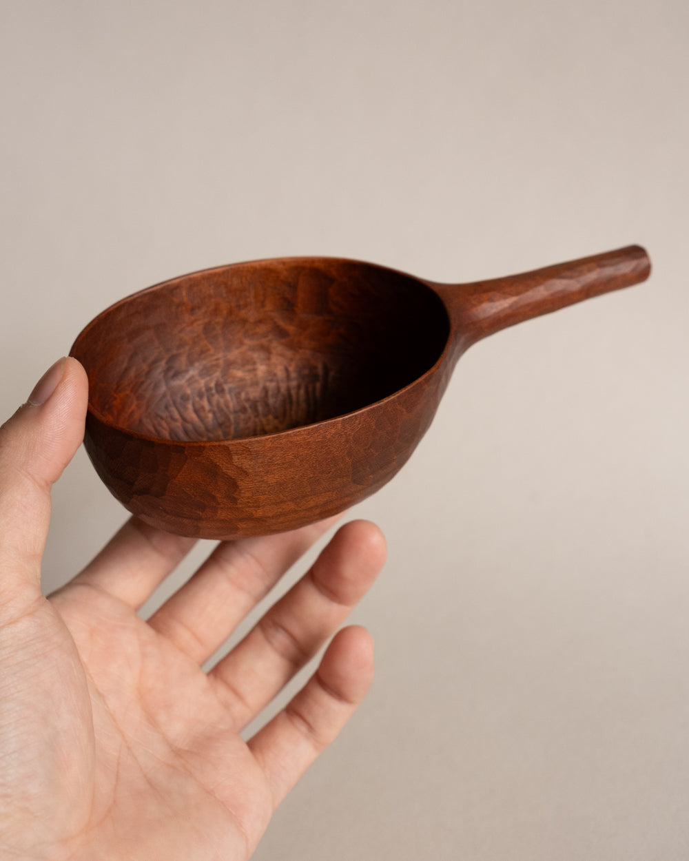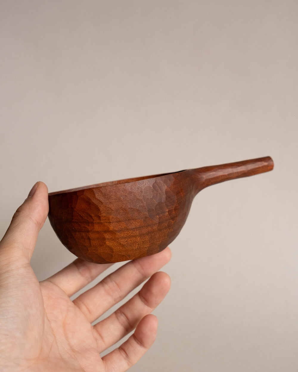 「在農家的生活裡,有時能在裝滿穀物的大袋子中,看到家中不用的漆碗或飯碗。當需要從袋中舀出穀物時,人們會自然伸手拿起身邊的器物——若覺得順手、好用,那件器具便會被長年使用下去,成為生活的一部分。大村先生所製作的『一合椀』,正是象徵著農家生活中樸實景象的手作之物。」——塚本美樹