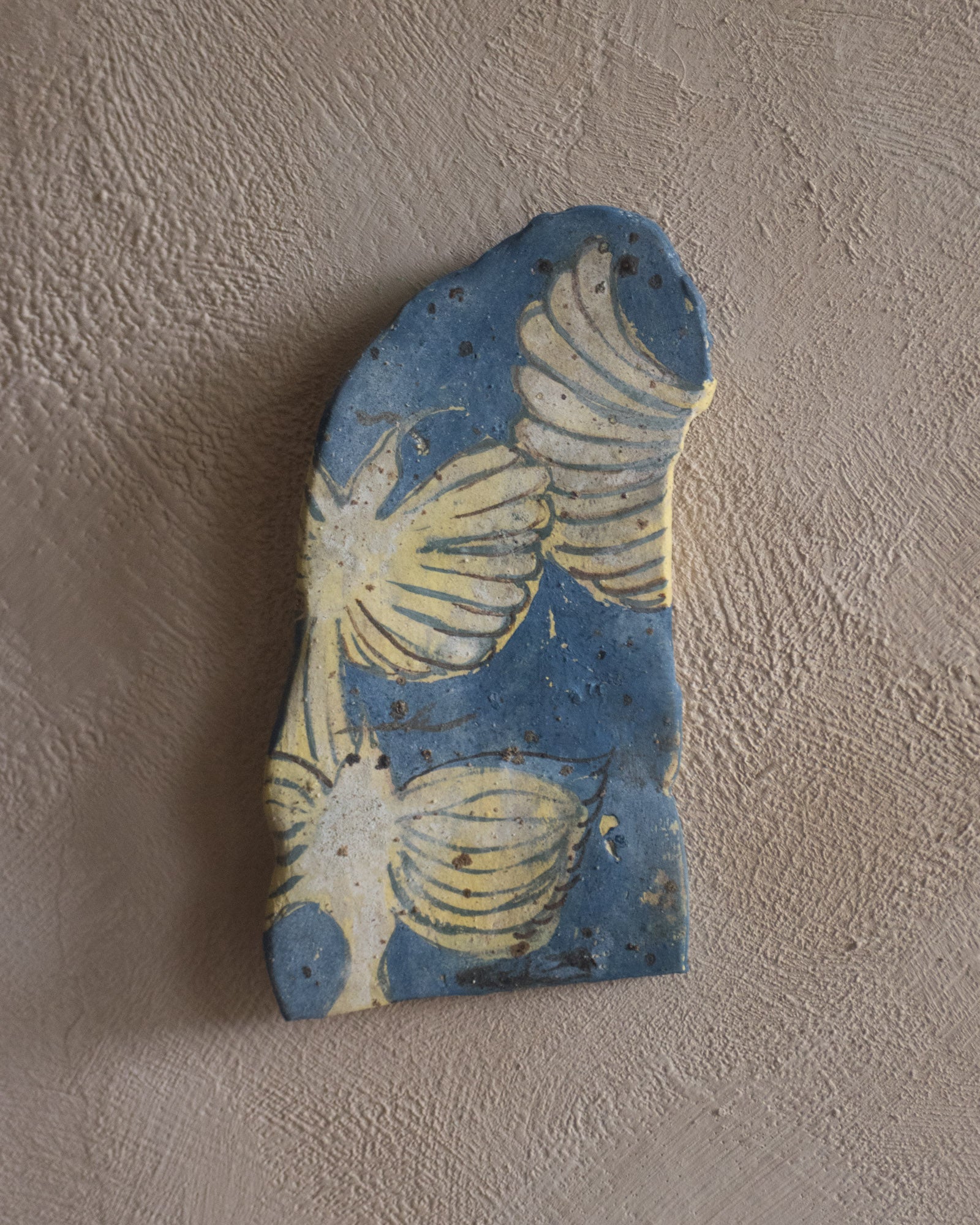 這些陶板畫作品,由 Megumi 進行創作之後,再交由水谷智美進行陶片的燒製。相識已久的兩人大約從十年前便開始一起創作。這些陶板作品保留了燒製時所產生的缺角與不完整,將其視為創作的一部分,並以漆繼的方式填補修復,有些看起來質感像是年代久遠的歐洲老磁磚、或是古代陶片。