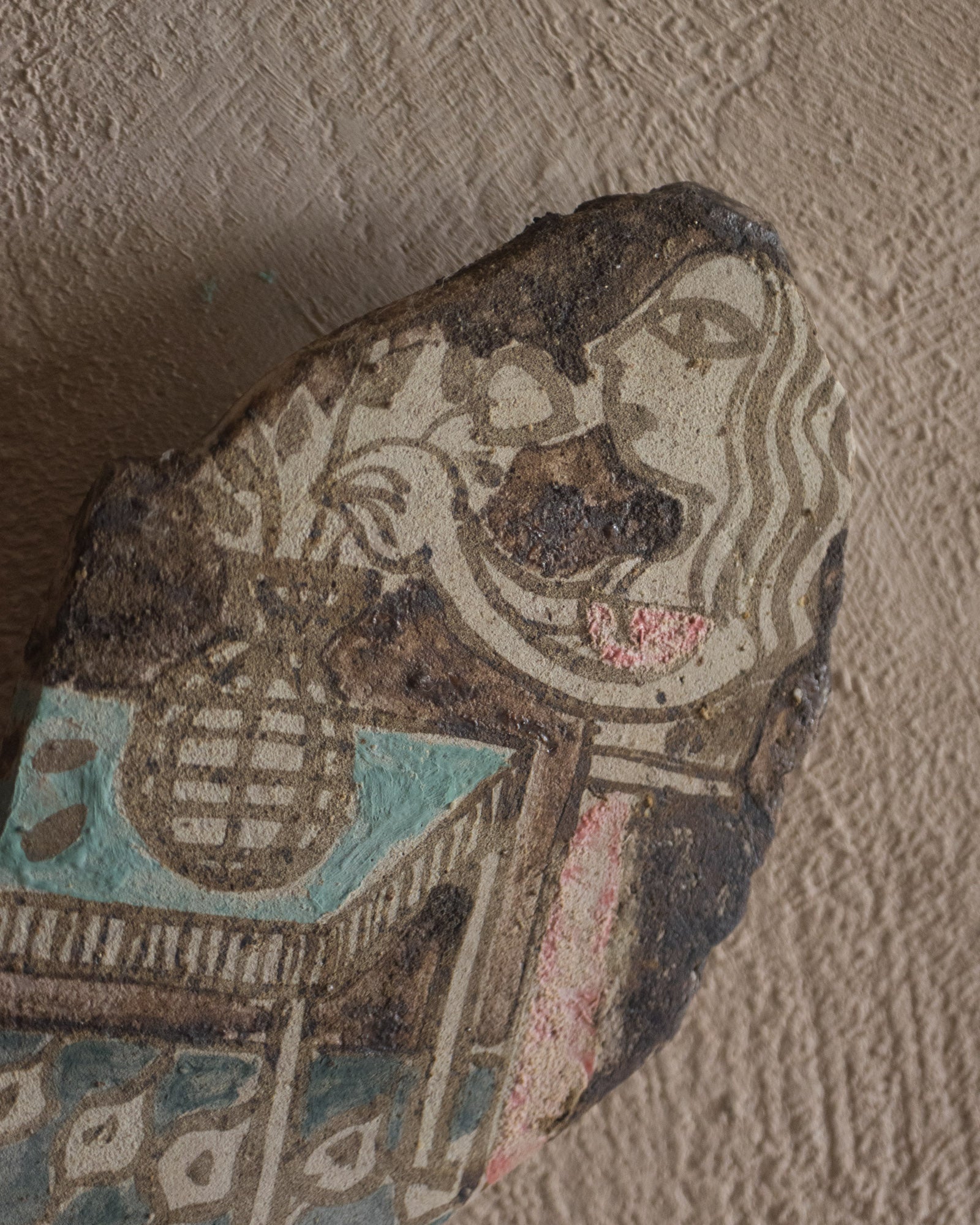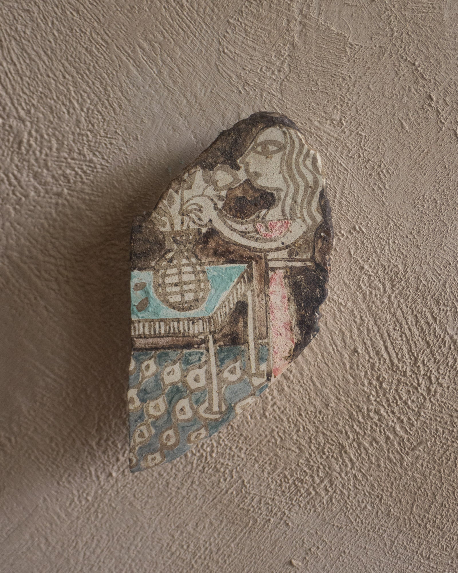 這些陶板畫作品,由 Megumi 進行創作之後,再交由水谷智美進行陶片的燒製。相識已久的兩人大約從十年前便開始一起創作。這些陶板作品保留了燒製時所產生的缺角與不完整,將其視為創作的一部分,並以漆繼的方式填補修復,有些看起來質感像是年代久遠的歐洲老磁磚、或是古代陶片。