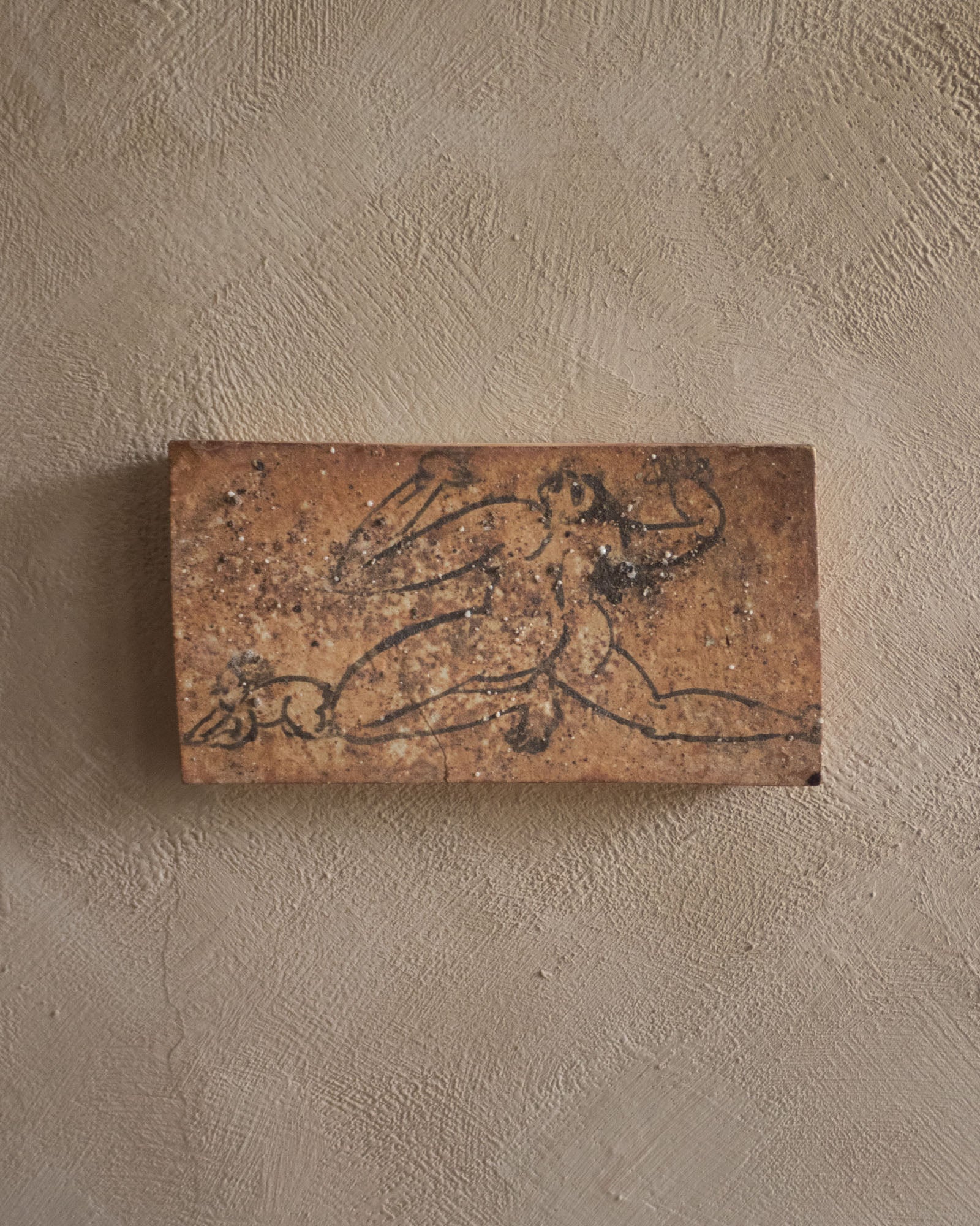 這些陶板畫作品,由 Megumi 進行創作之後,再交由水谷智美進行陶片的燒製。相識已久的兩人大約從十年前便開始一起創作。這些陶板作品保留了燒製時所產生的缺角與不完整,將其視為創作的一部分,並以漆繼的方式填補修復,有些看起來質感像是年代久遠的歐洲老磁磚、或是古代陶片。