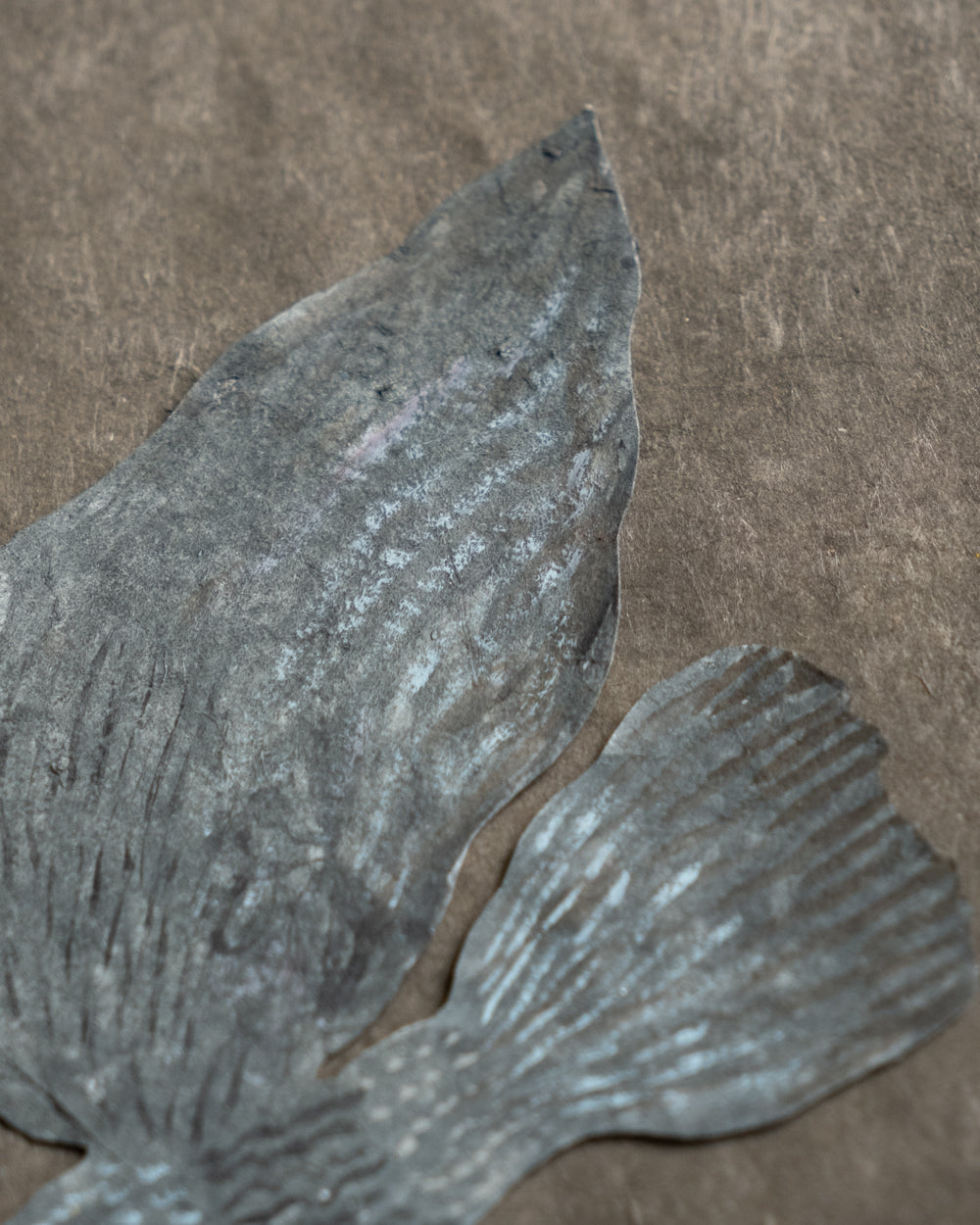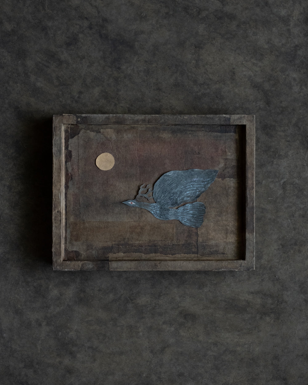在這次《風之樹》展覽中,台灣作家Gyoku為熊谷隼人的「剪紙生物」製作手工紙敷染框,有「靛藍」與「咖啡」兩種色調,有著古布 boro 的質樸與溫度。以染紙為框,不僅讓作品更加完整,也讓熊谷隼人筆下充滿原始氣息的生物們,在光影之間顯得更加鮮活。