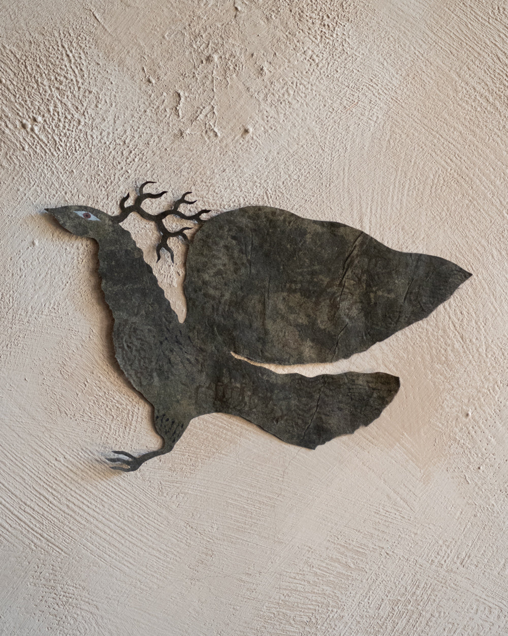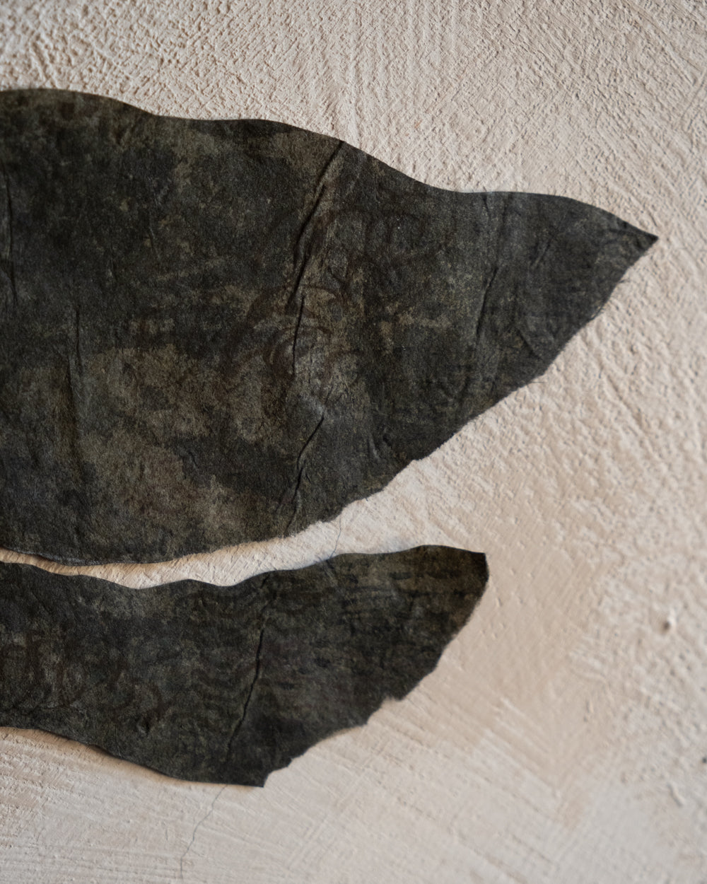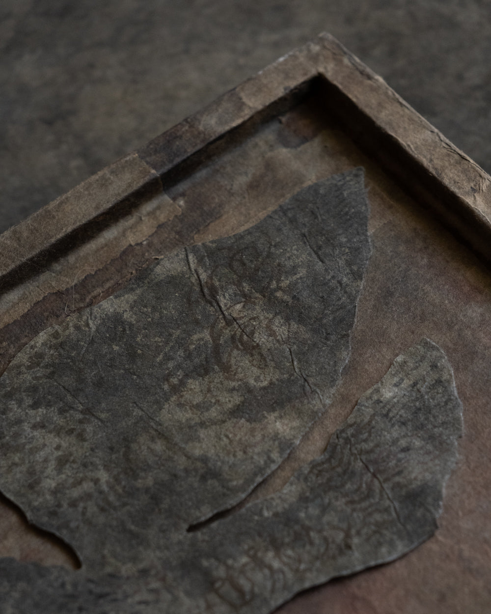 在這次《風之樹》展覽中,台灣作家Gyoku為熊谷隼人的「剪紙生物」製作手工紙敷染框,有「靛藍」與「咖啡」兩種色調,有著古布 boro 的質樸與溫度。以染紙為框,不僅讓作品更加完整,也讓熊谷隼人筆下充滿原始氣息的生物們,在光影之間顯得更加鮮活。