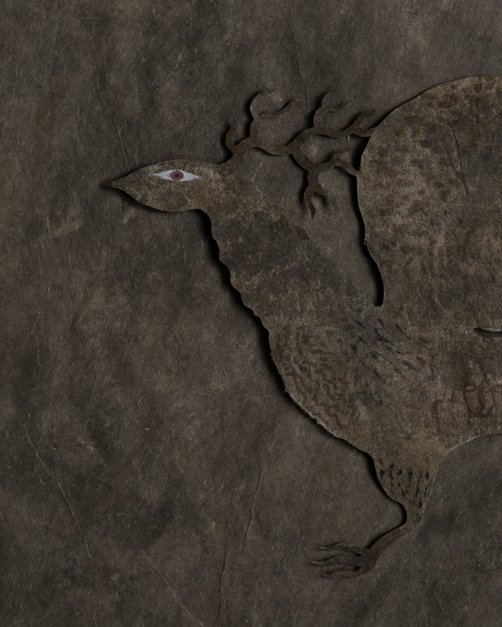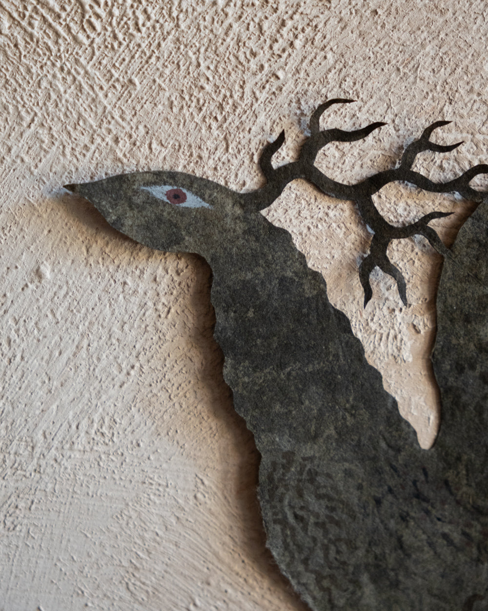 大約在五年前,熊谷遇見了名為Lokta的尼泊爾手工紙,從此他將這種有著自然紋理的紙當作岩壁,注入生命,訴說著無名的神話。熊谷移居至北海道後,大量描繪以鹿為主題的剪紙生物,在學習北方民族的文化信仰的過程中,他觀察到了許多以鹿、馴鹿、駝鹿為主題的壁畫與裝飾。在吸收這些元素的同時,他筆下剪紙生物們的眼神、體態、鹿角的形狀與花紋,也不斷地發生變化,而形成了現在的生物形貌。