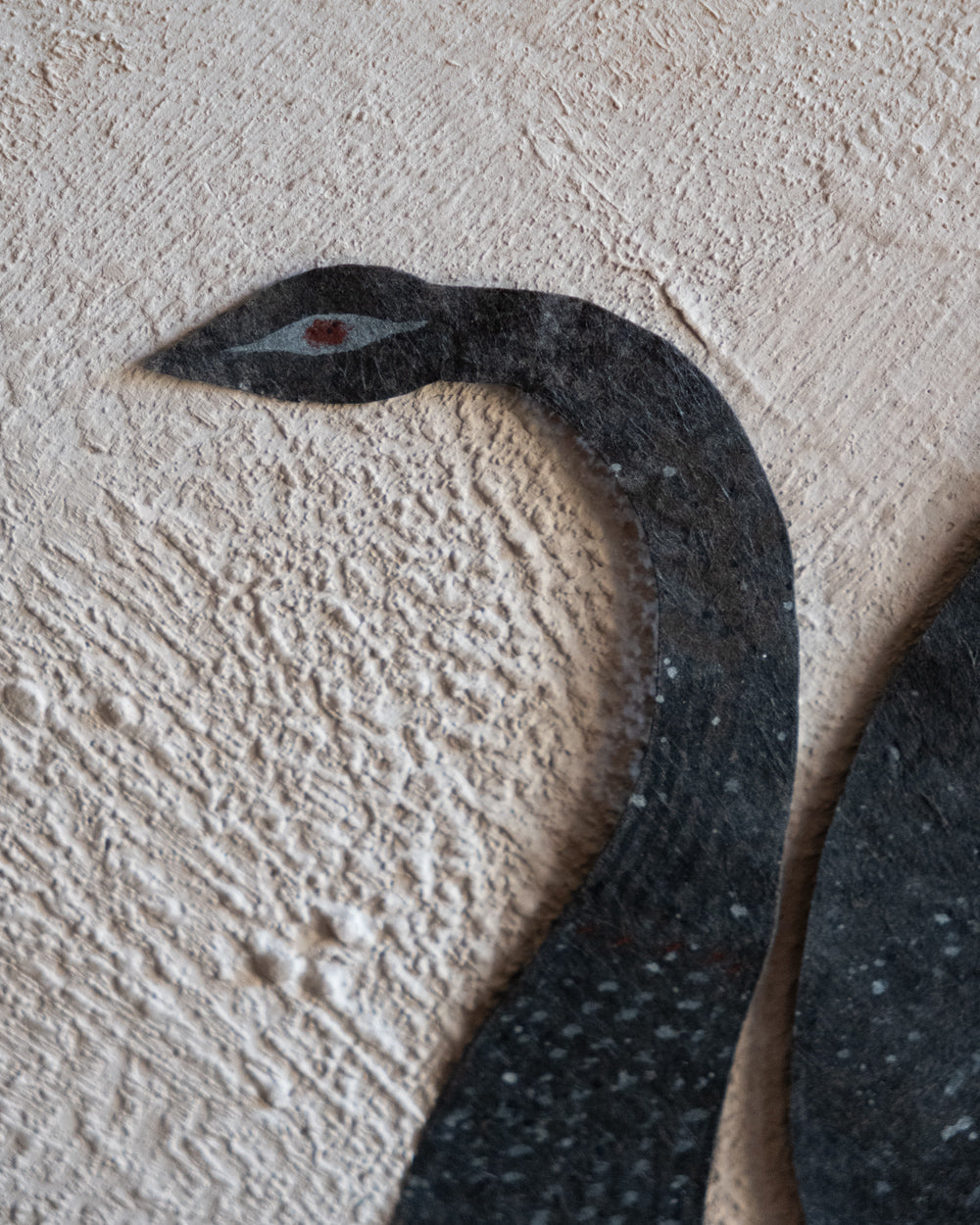 熊谷稱自己一直都不擅長在方形畫布上作畫,也無法習慣在制式的幾何圖形裡,掌握恰到好處的構圖與平衡。透過剪紙生物有機的身體輪廓,反而讓熊谷從既有的畫布形式中解放,頭部、身軀、四肢⋯⋯描繪的對象自然地由外形引導而出,筆觸也隨之自然流動。