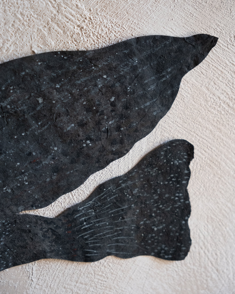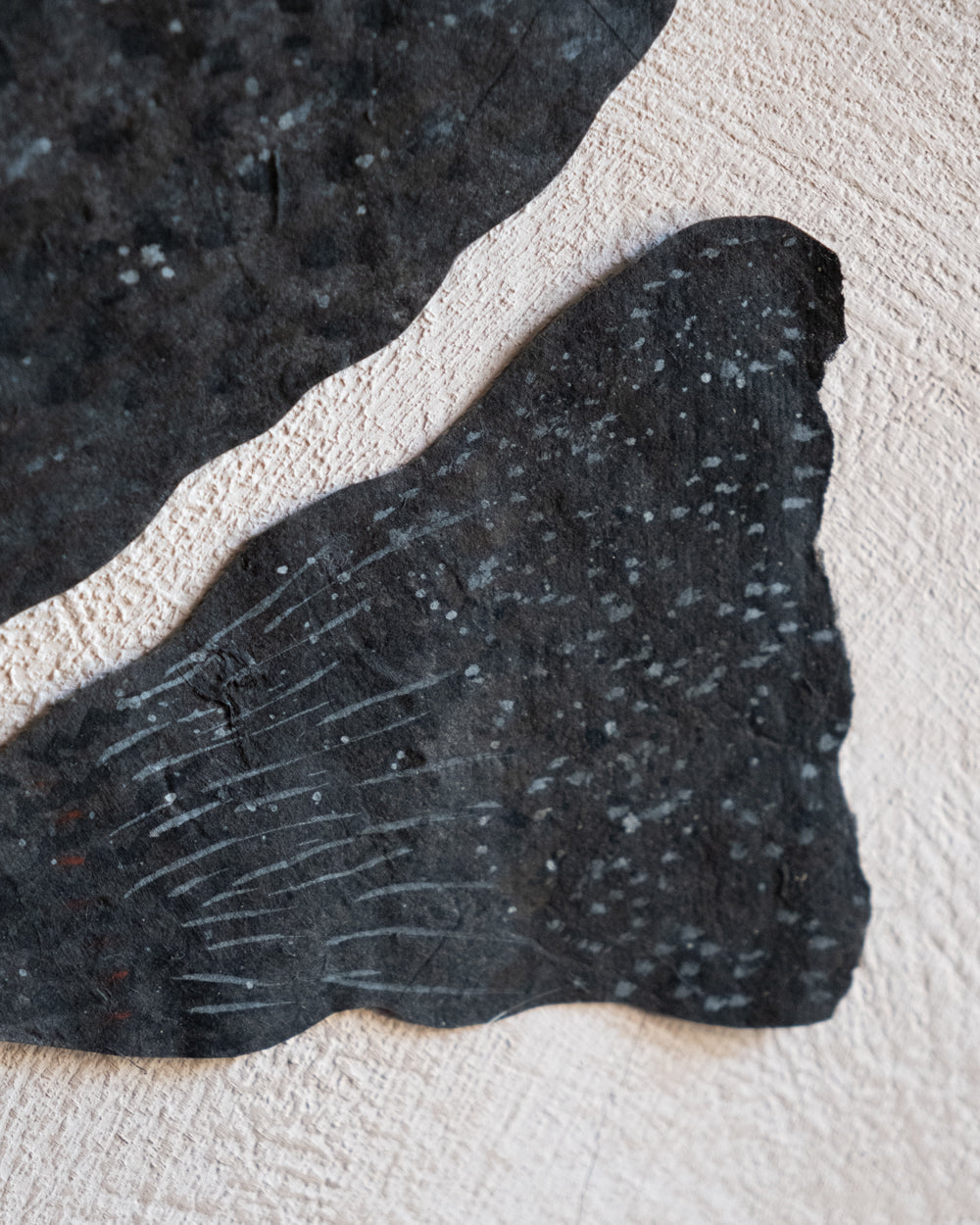 在這次《風之樹》展覽中,台灣作家Gyoku為熊谷隼人的「剪紙生物」製作手工紙敷染框,有「靛藍」與「咖啡」兩種色調,有著古布 boro 的質樸與溫度。以染紙為框,不僅讓作品更加完整,也讓熊谷隼人筆下充滿原始氣息的生物們,在光影之間顯得更加鮮活。