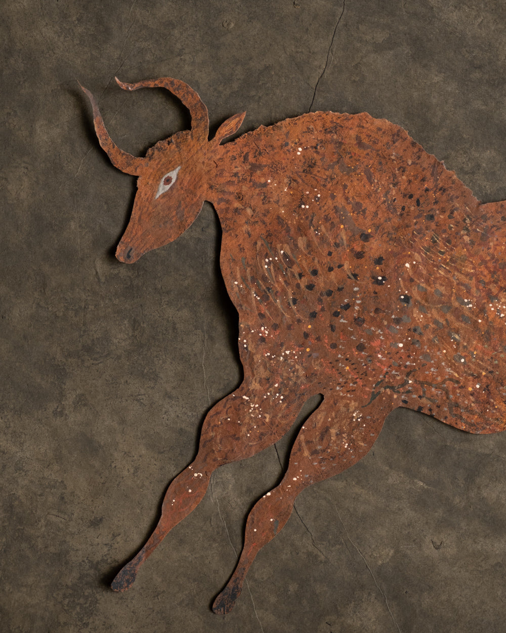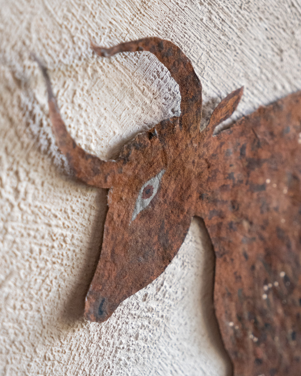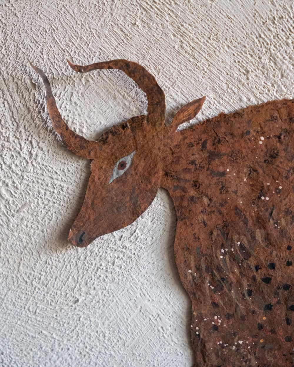 大約在五年前,熊谷遇見了名為Lokta的尼泊爾手工紙,從此他將這種有著自然紋理的紙當作岩壁,注入生命,訴說著無名的神話。熊谷移居至北海道後,大量描繪以鹿為主題的剪紙生物,在學習北方民族的文化信仰的過程中,他觀察到了許多以鹿、馴鹿、駝鹿為主題的壁畫與裝飾。在吸收這些元素的同時,他筆下剪紙生物們的眼神、體態、鹿角的形狀與花紋,也不斷地發生變化,而形成了現在的生物形貌。