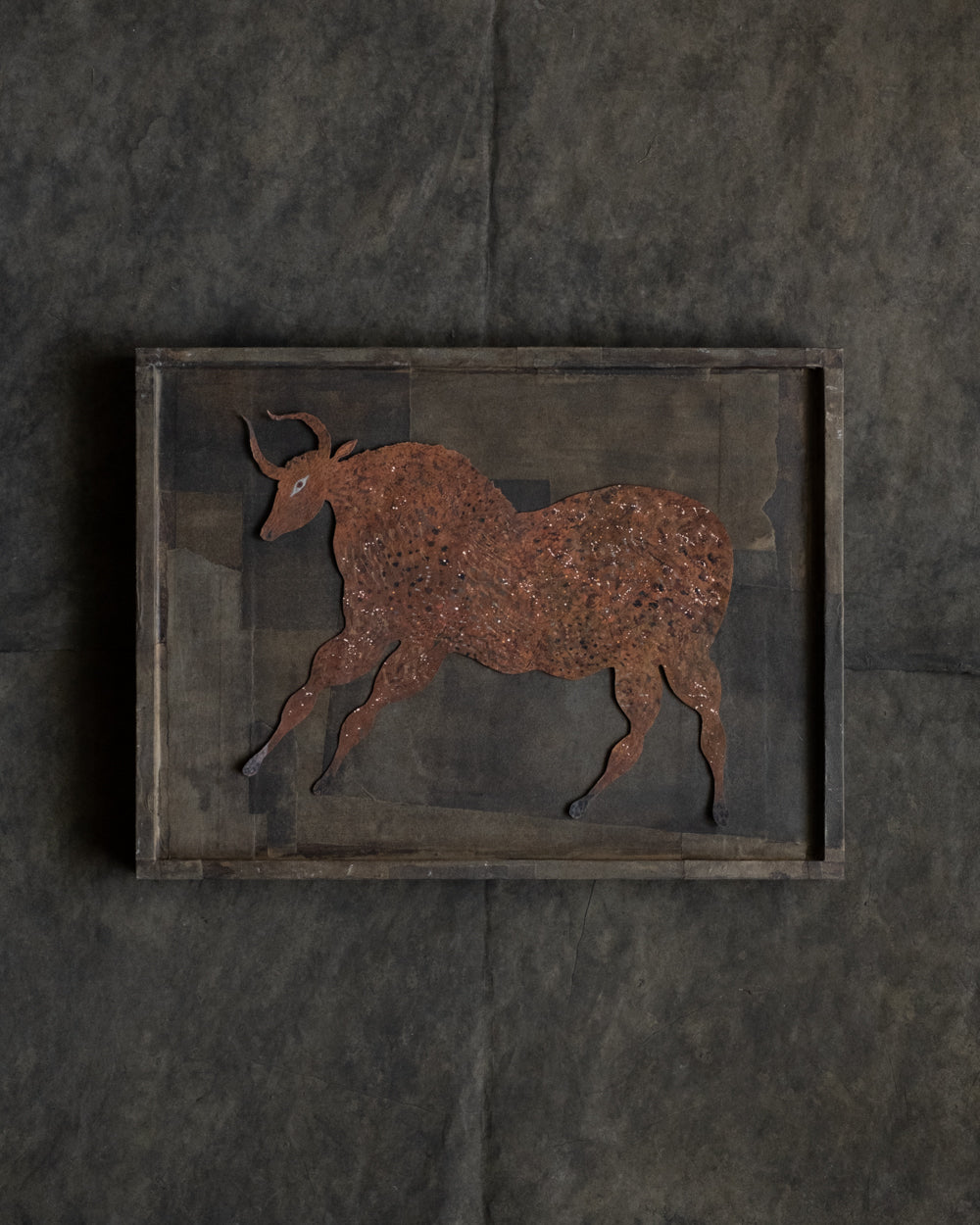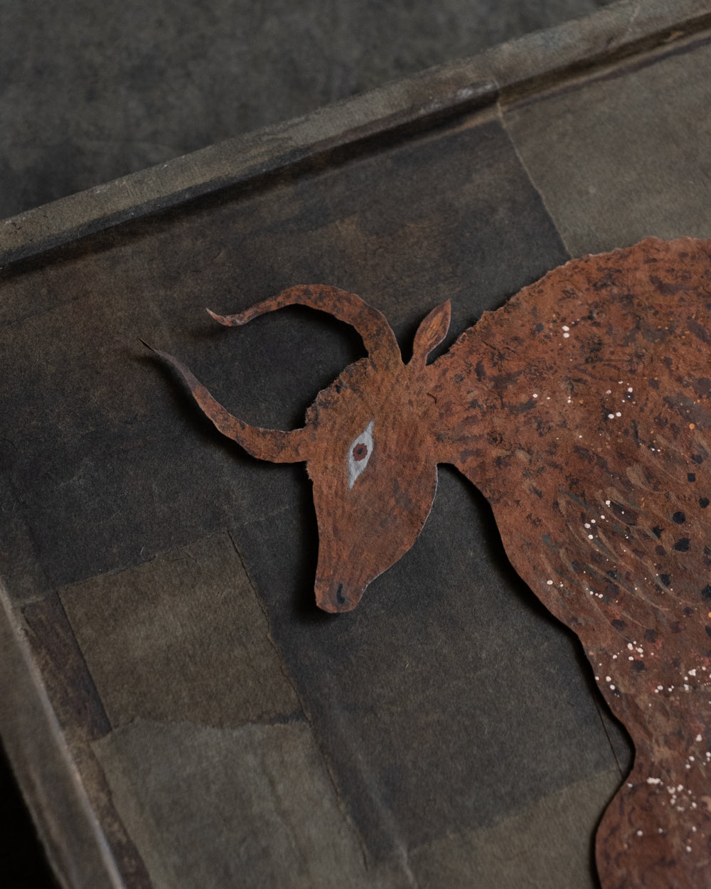 在這次《風之樹》展覽中,台灣作家Gyoku為熊谷隼人的「剪紙生物」製作手工紙敷染框,有「靛藍」與「咖啡」兩種色調,有著古布 boro 的質樸與溫度。以染紙為框,不僅讓作品更加完整,也讓熊谷隼人筆下充滿原始氣息的生物們,在光影之間顯得更加鮮活。