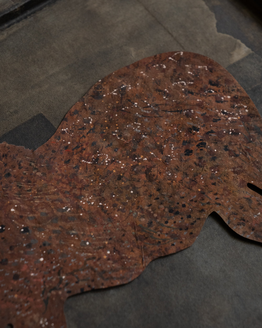 熊谷稱自己一直都不擅長在方形畫布上作畫,也無法習慣在制式的幾何圖形裡,掌握恰到好處的構圖與平衡。透過剪紙生物有機的身體輪廓,反而讓熊谷從既有的畫布形式中解放,頭部、身軀、四肢⋯⋯描繪的對象自然地由外形引導而出,筆觸也隨之自然流動。