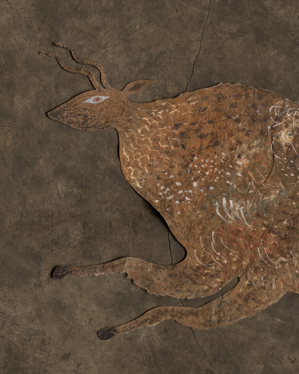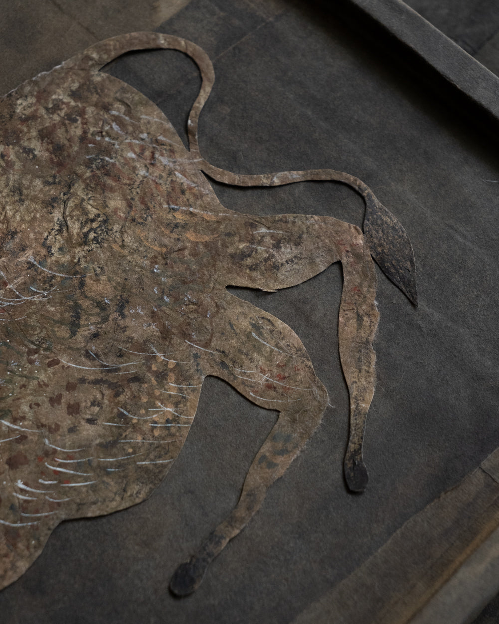 大約在五年前,熊谷遇見了名為Lokta的尼泊爾手工紙,從此他將這種有著自然紋理的紙當作岩壁,注入生命,訴說著無名的神話。熊谷移居至北海道後,大量描繪以鹿為主題的剪紙生物,在學習北方民族的文化信仰的過程中,他觀察到了許多以鹿、馴鹿、駝鹿為主題的壁畫與裝飾。在吸收這些元素的同時,他筆下剪紙生物們的眼神、體態、鹿角的形狀與花紋,也不斷地發生變化,而形成了現在的生物形貌。