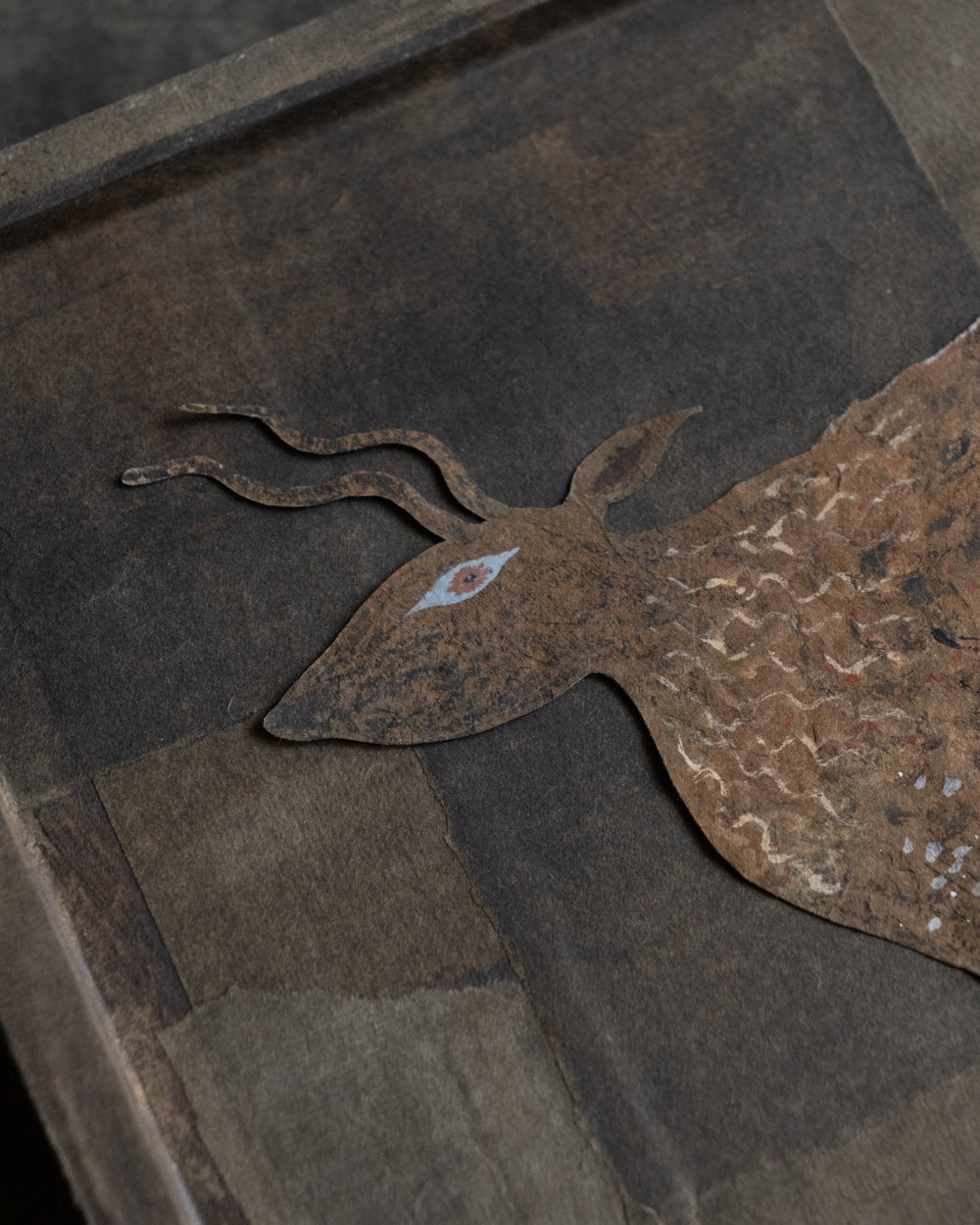 在這次《風之樹》展覽中,台灣作家Gyoku為熊谷隼人的「剪紙生物」製作手工紙敷染框,有「靛藍」與「咖啡」兩種色調,有著古布 boro 的質樸與溫度。以染紙為框,不僅讓作品更加完整,也讓熊谷隼人筆下充滿原始氣息的生物們,在光影之間顯得更加鮮活。