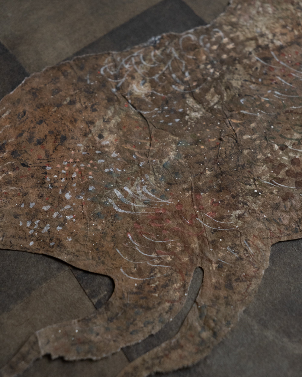 ※ 熊谷隼人的剪紙生物作品,以手工紙與顏料創作而成。每一件作品皆以手工裁切與繪製,因此在紙張纖維、邊緣形狀與顏色層次上,皆會有手工感的表現。這些細微的不均勻與手感,是熊谷繪畫作品的特徵,也代表著每一件生物的獨特性。