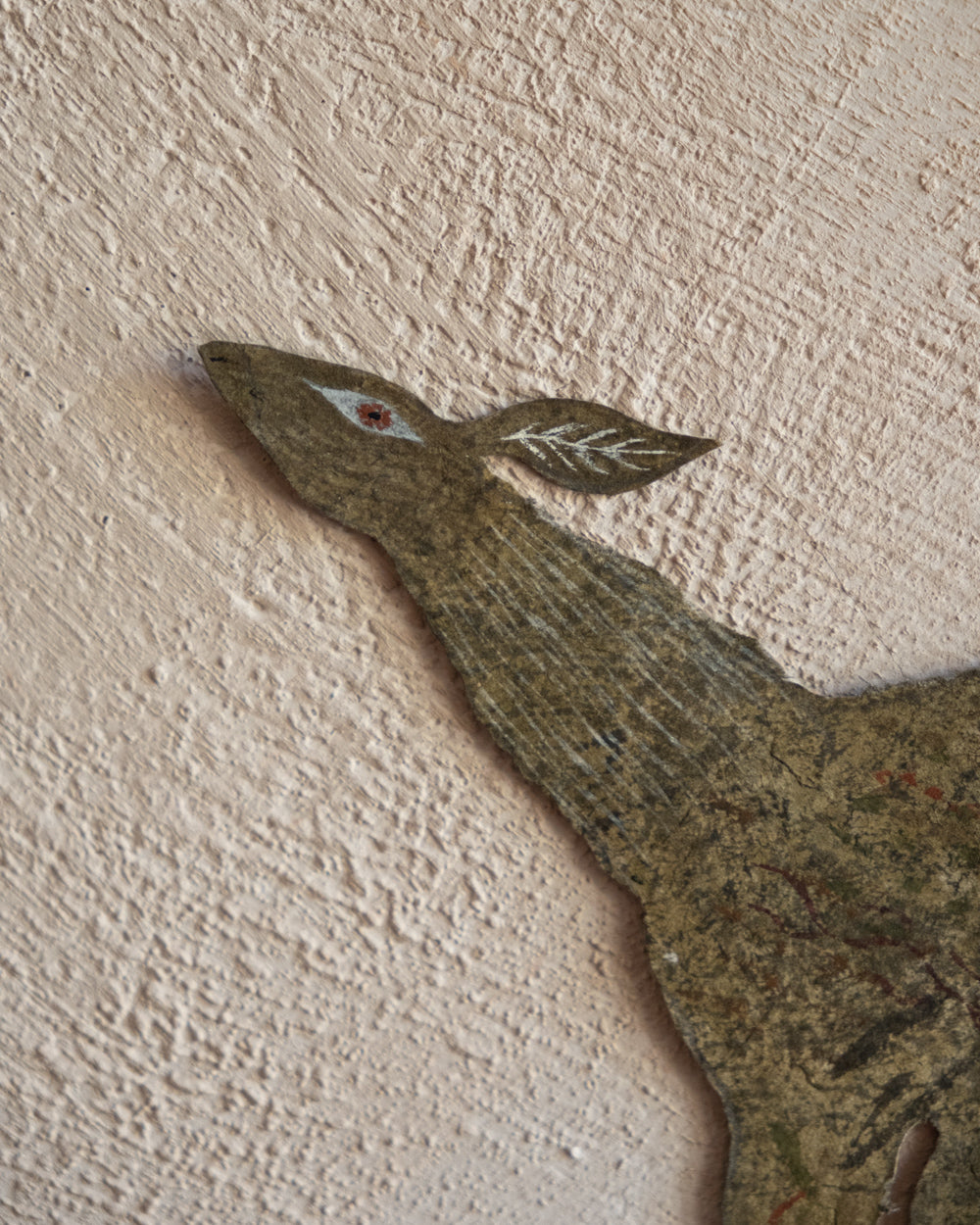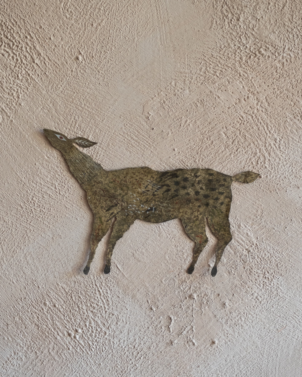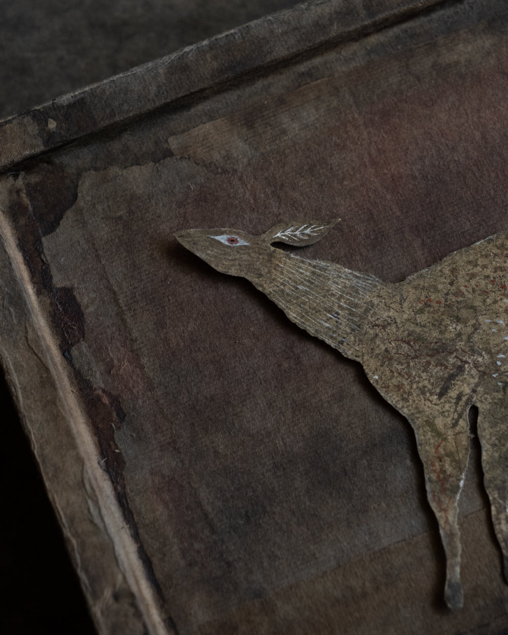 大約在五年前,熊谷遇見了名為Lokta的尼泊爾手工紙,從此他將這種有著自然紋理的紙當作岩壁,注入生命,訴說著無名的神話。熊谷移居至北海道後,大量描繪以鹿為主題的剪紙生物,在學習北方民族的文化信仰的過程中,他觀察到了許多以鹿、馴鹿、駝鹿為主題的壁畫與裝飾。在吸收這些元素的同時,他筆下剪紙生物們的眼神、體態、鹿角的形狀與花紋,也不斷地發生變化,而形成了現在的生物形貌。
