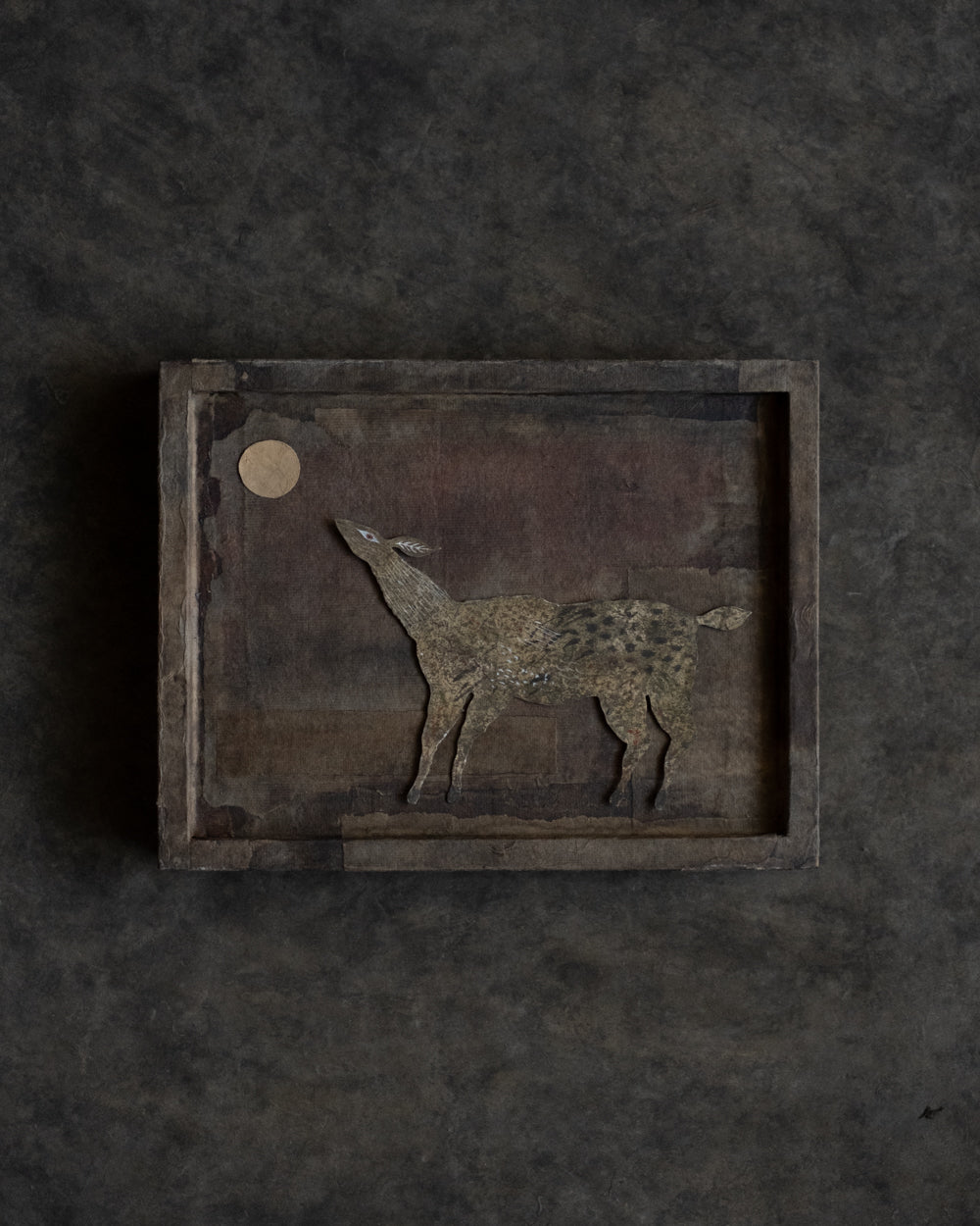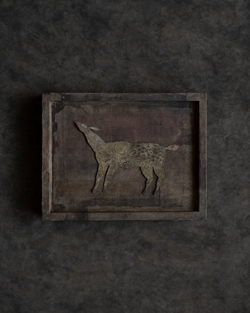 在這次《風之樹》展覽中,台灣作家Gyoku為熊谷隼人的「剪紙生物」製作手工紙敷染框,有「靛藍」與「咖啡」兩種色調,有著古布 boro 的質樸與溫度。以染紙為框,不僅讓作品更加完整,也讓熊谷隼人筆下充滿原始氣息的生物們,在光影之間顯得更加鮮活。
