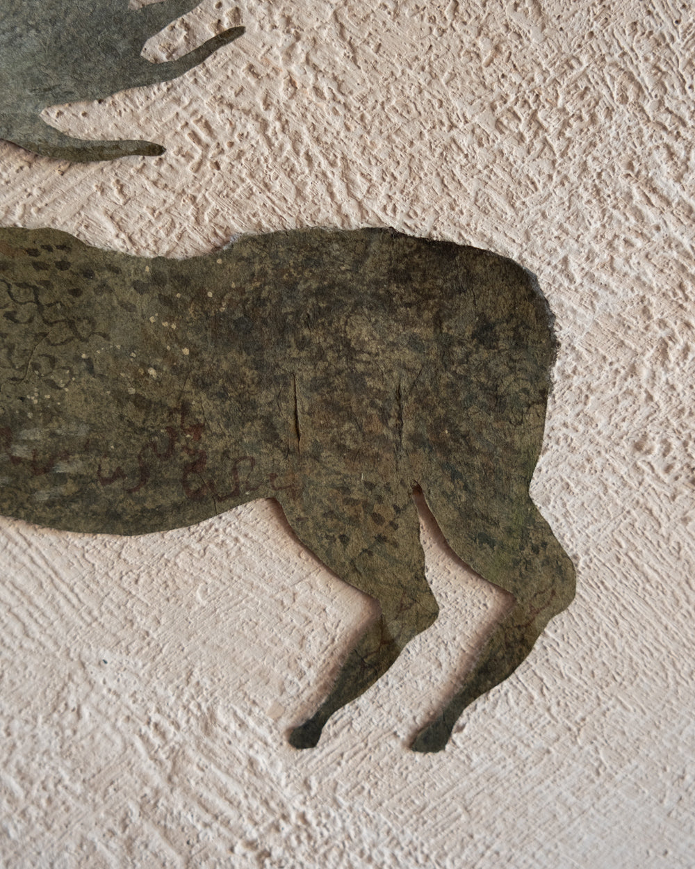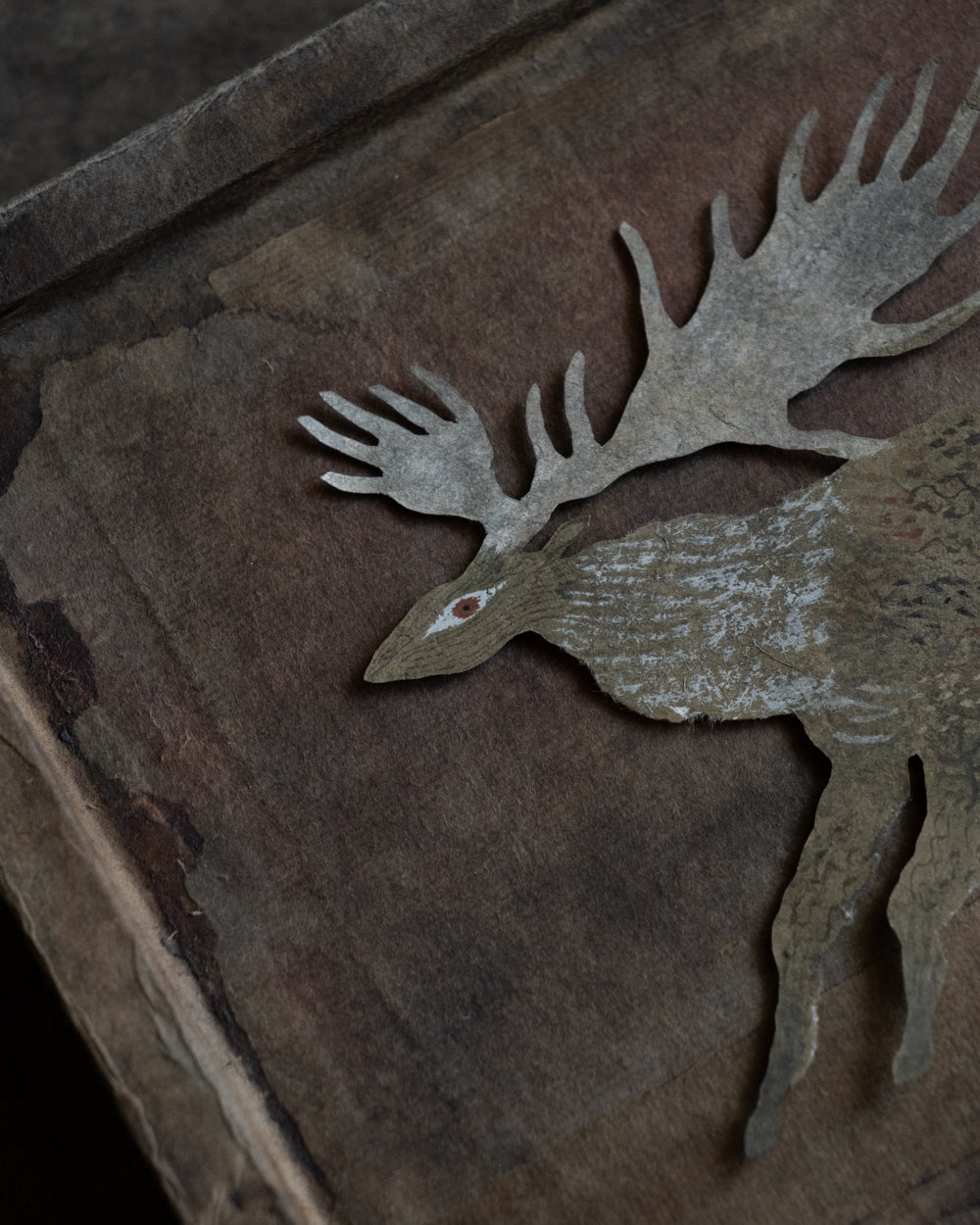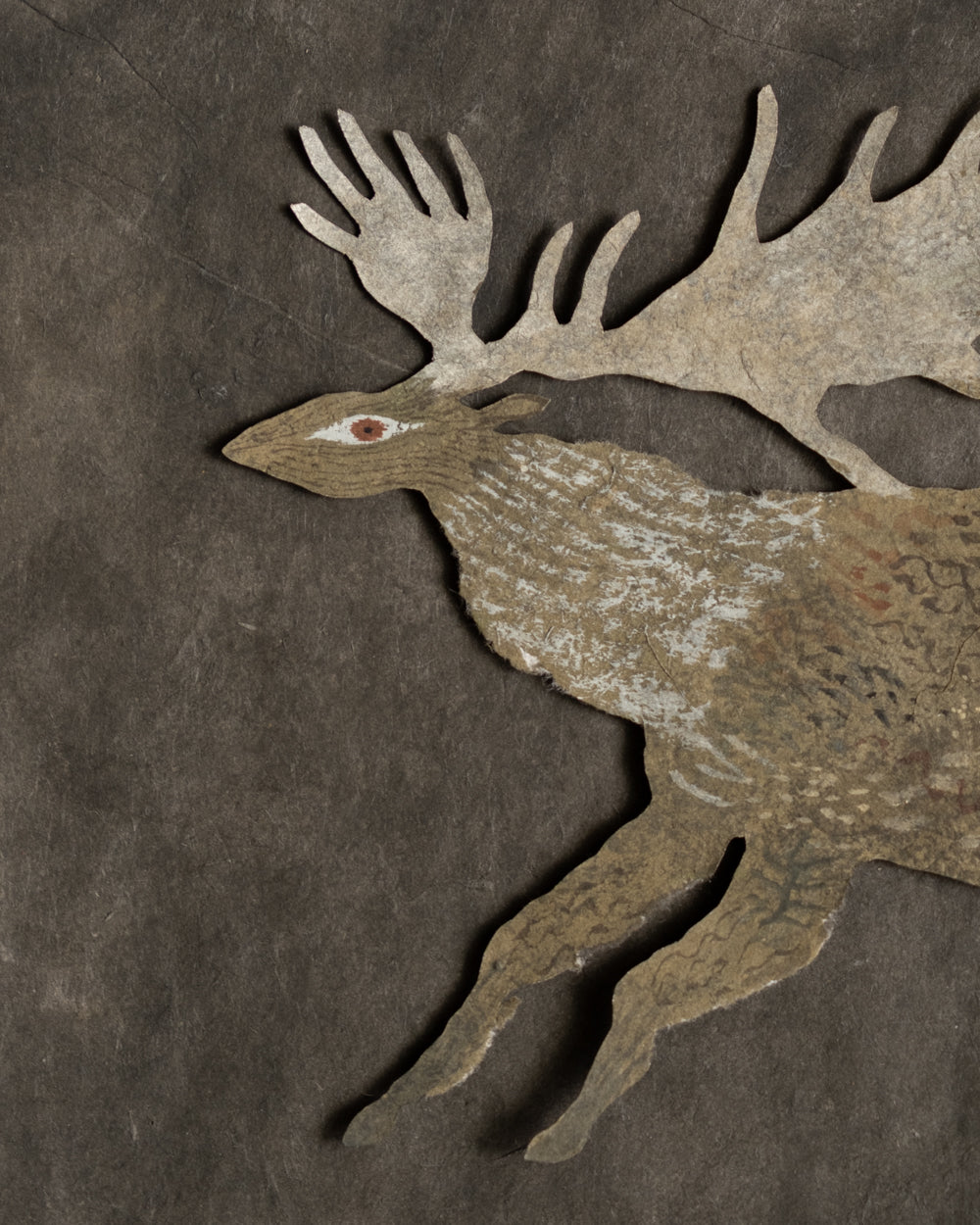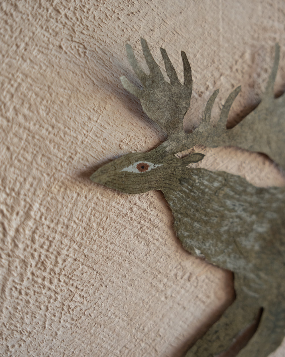 大約在五年前,熊谷遇見了名為Lokta的尼泊爾手工紙,從此他將這種有著自然紋理的紙當作岩壁,注入生命,訴說著無名的神話。熊谷移居至北海道後,大量描繪以鹿為主題的剪紙生物,在學習北方民族的文化信仰的過程中,他觀察到了許多以鹿、馴鹿、駝鹿為主題的壁畫與裝飾。在吸收這些元素的同時,他筆下剪紙生物們的眼神、體態、鹿角的形狀與花紋,也不斷地發生變化,而形成了現在的生物形貌。