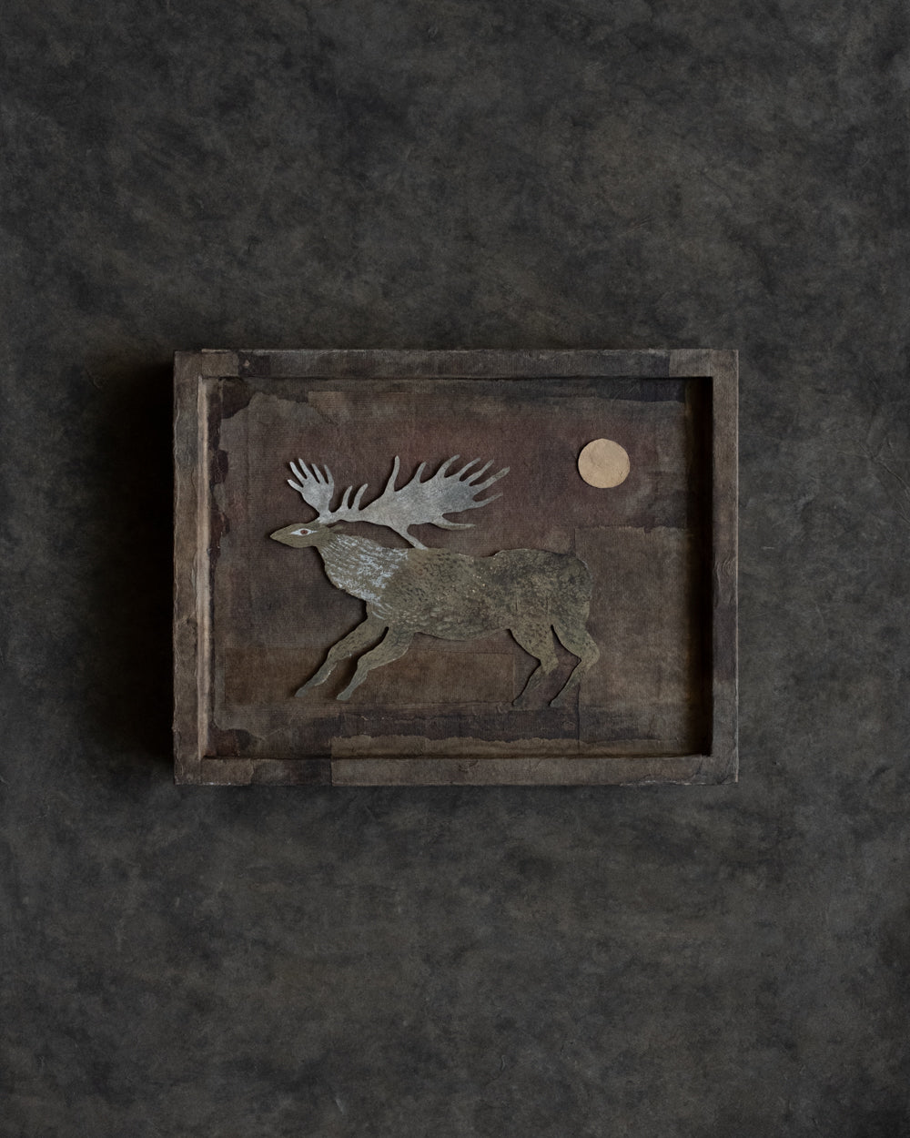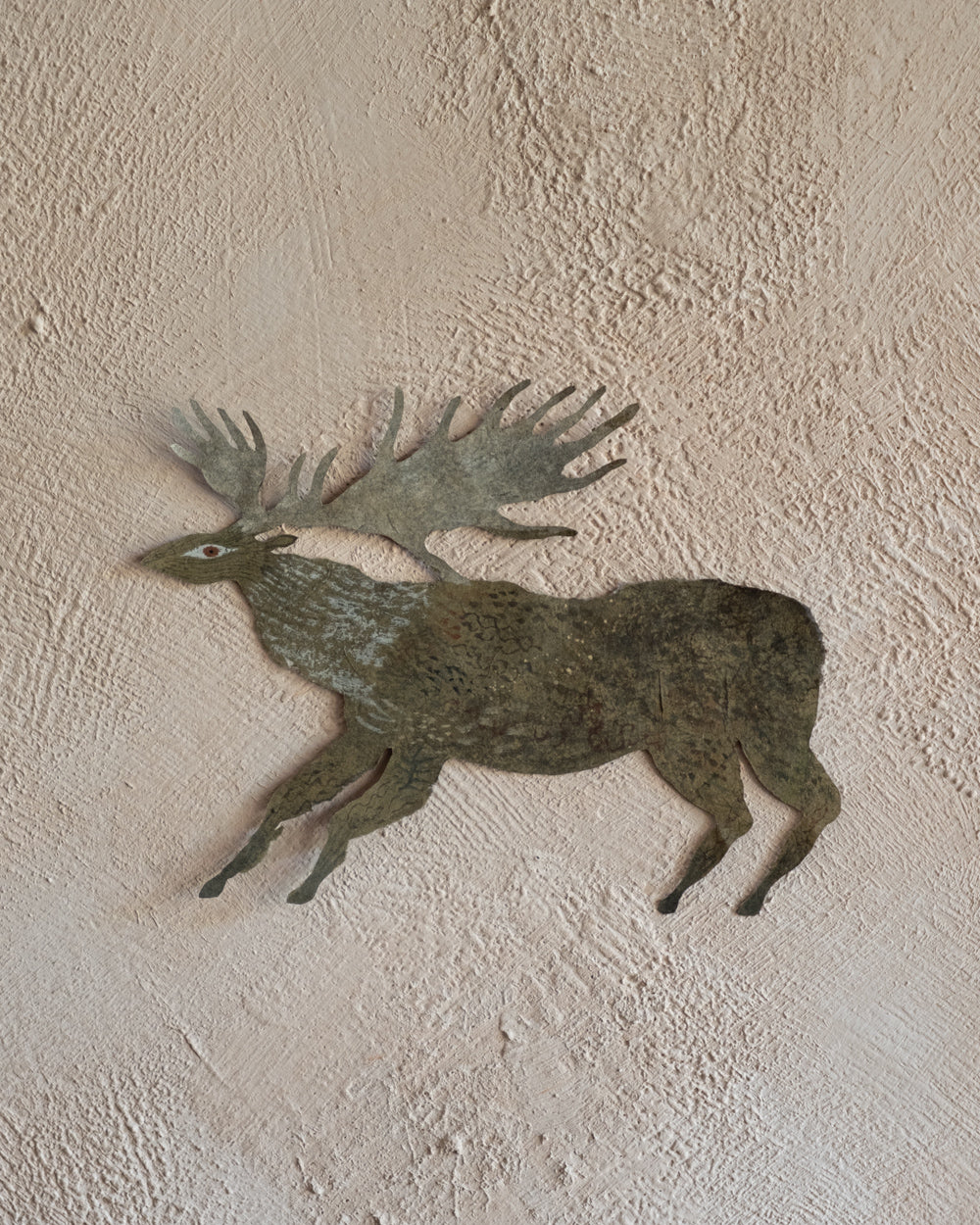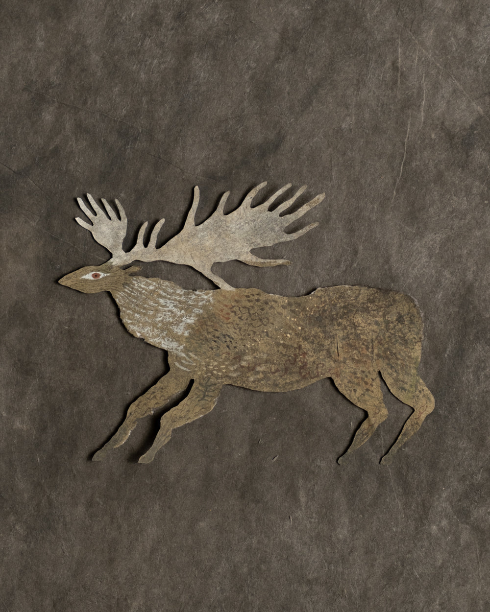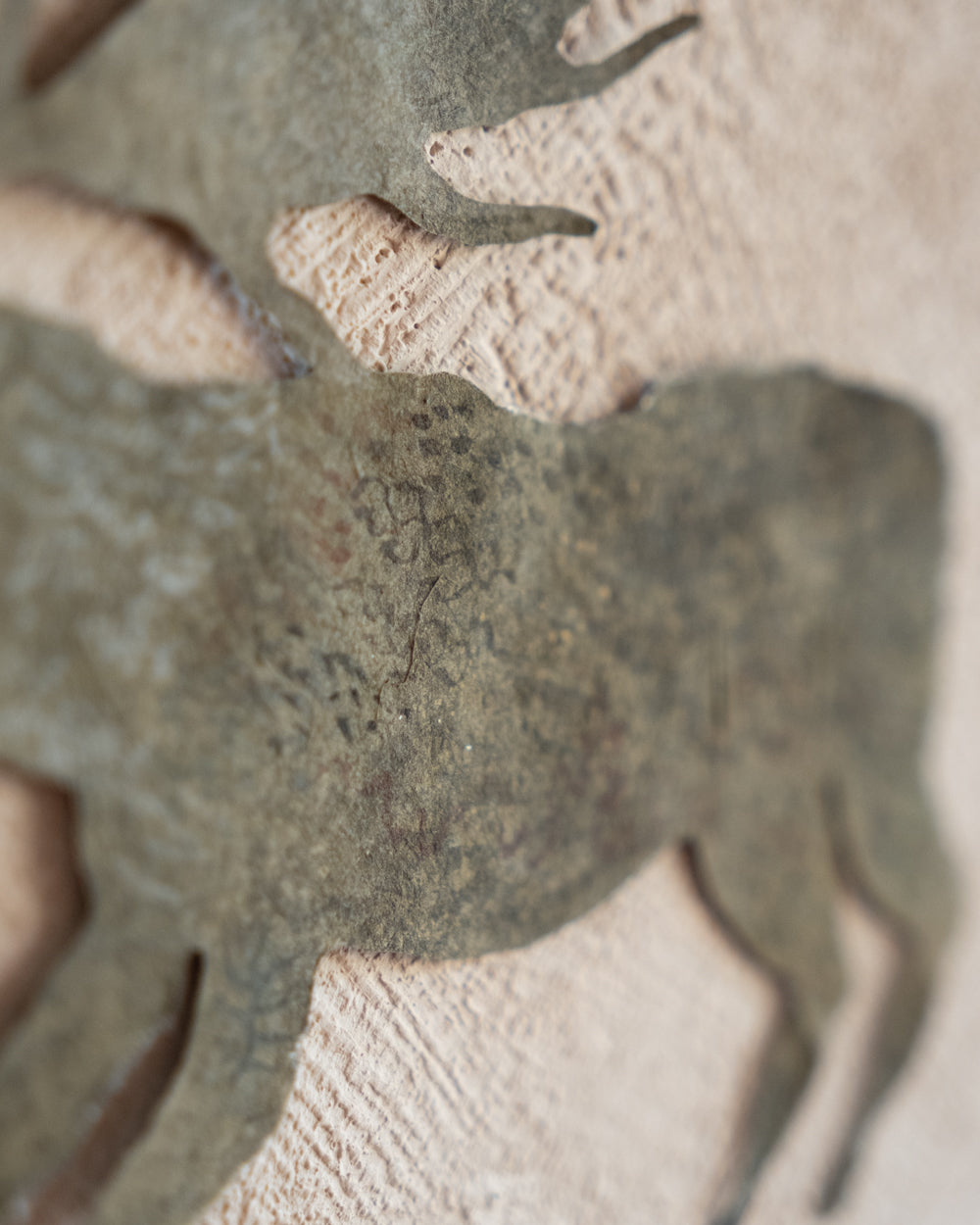 大約在五年前,熊谷遇見了名為Lokta的尼泊爾手工紙,從此他將這種有著自然紋理的紙當作岩壁,注入生命,訴說著無名的神話。熊谷移居至北海道後,大量描繪以鹿為主題的剪紙生物,在學習北方民族的文化信仰的過程中,他觀察到了許多以鹿、馴鹿、駝鹿為主題的壁畫與裝飾。在吸收這些元素的同時,他筆下剪紙生物們的眼神、體態、鹿角的形狀與花紋,也不斷地發生變化,而形成了現在的生物形貌。