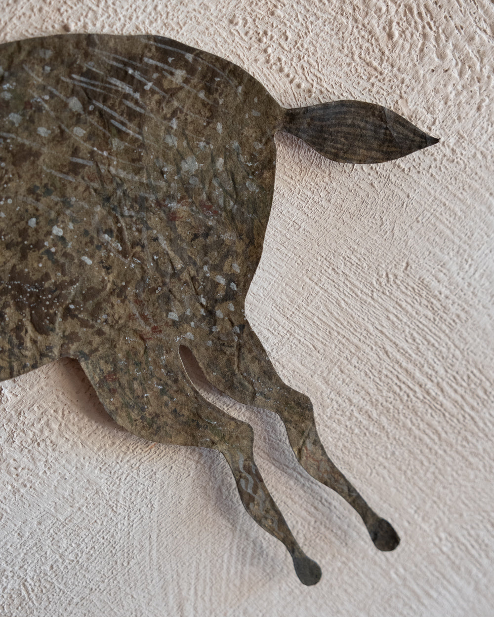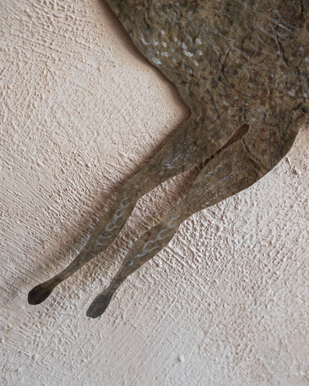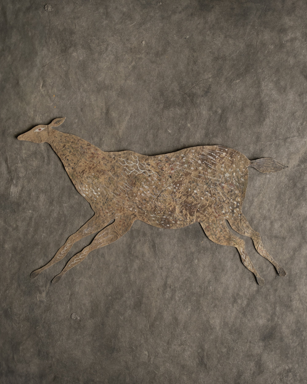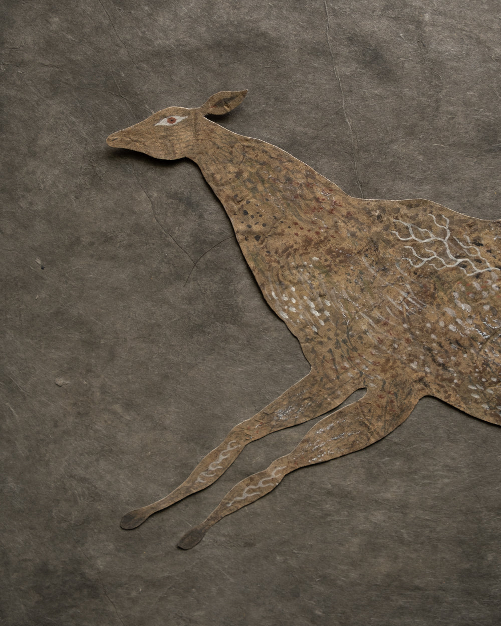 大約在五年前,熊谷遇見了名為Lokta的尼泊爾手工紙,從此他將這種有著自然紋理的紙當作岩壁,注入生命,訴說著無名的神話。熊谷移居至北海道後,大量描繪以鹿為主題的剪紙生物,在學習北方民族的文化信仰的過程中,他觀察到了許多以鹿、馴鹿、駝鹿為主題的壁畫與裝飾。在吸收這些元素的同時,他筆下剪紙生物們的眼神、體態、鹿角的形狀與花紋,也不斷地發生變化,而形成了現在的生物形貌。