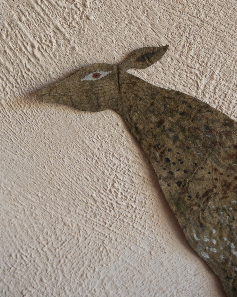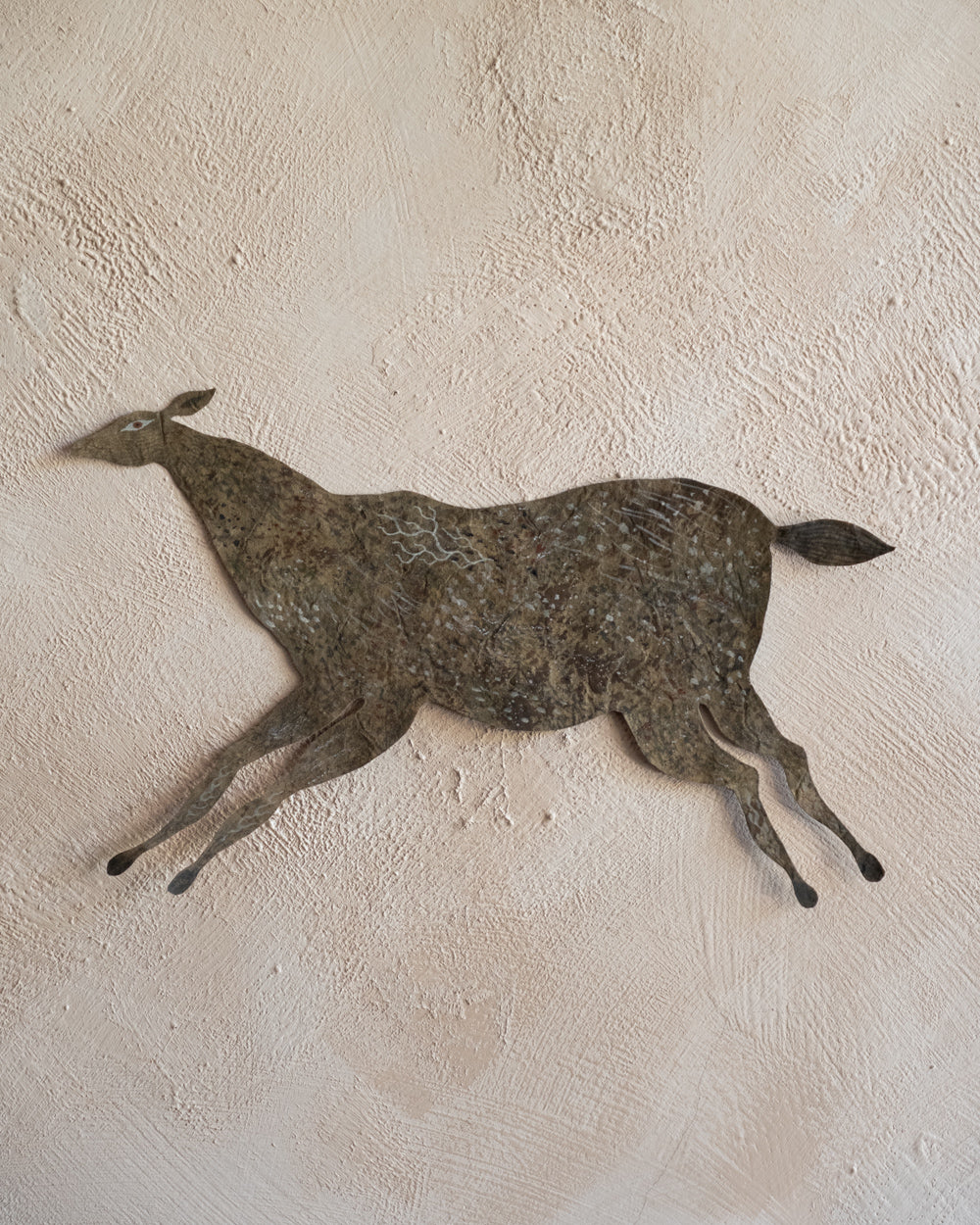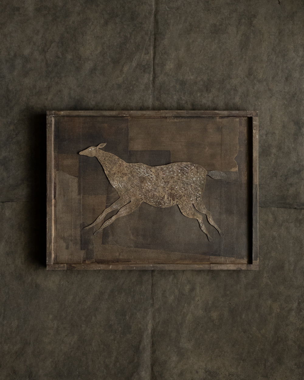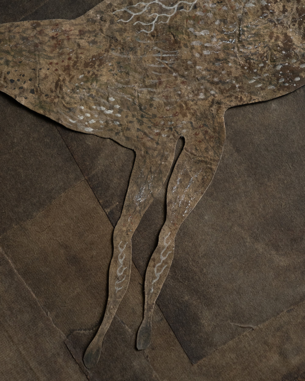 大約在五年前,熊谷遇見了名為Lokta的尼泊爾手工紙,從此他將這種有著自然紋理的紙當作岩壁,注入生命,訴說著無名的神話。熊谷移居至北海道後,大量描繪以鹿為主題的剪紙生物,在學習北方民族的文化信仰的過程中,他觀察到了許多以鹿、馴鹿、駝鹿為主題的壁畫與裝飾。在吸收這些元素的同時,他筆下剪紙生物們的眼神、體態、鹿角的形狀與花紋,也不斷地發生變化,而形成了現在的生物形貌。