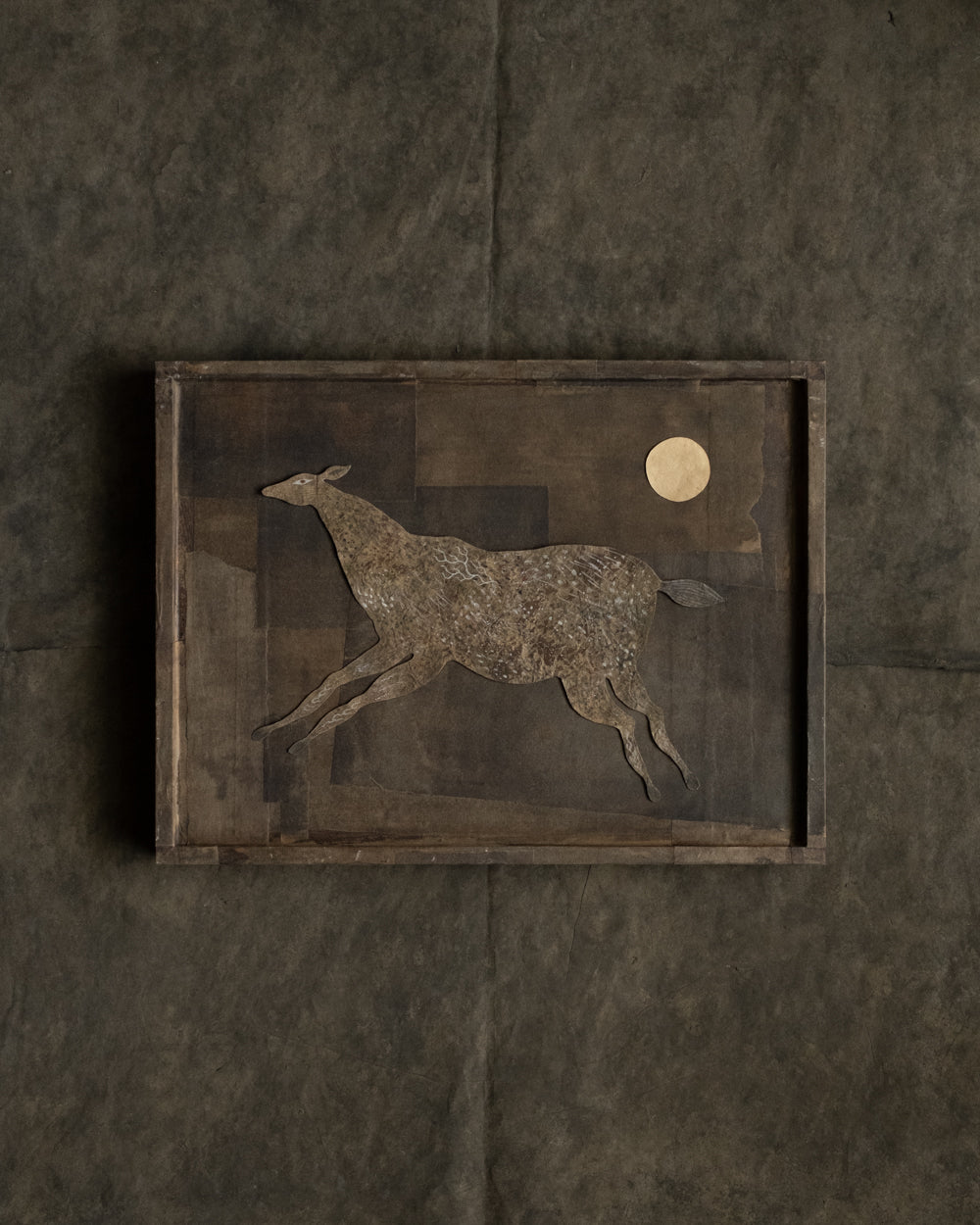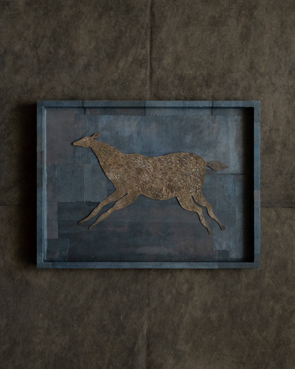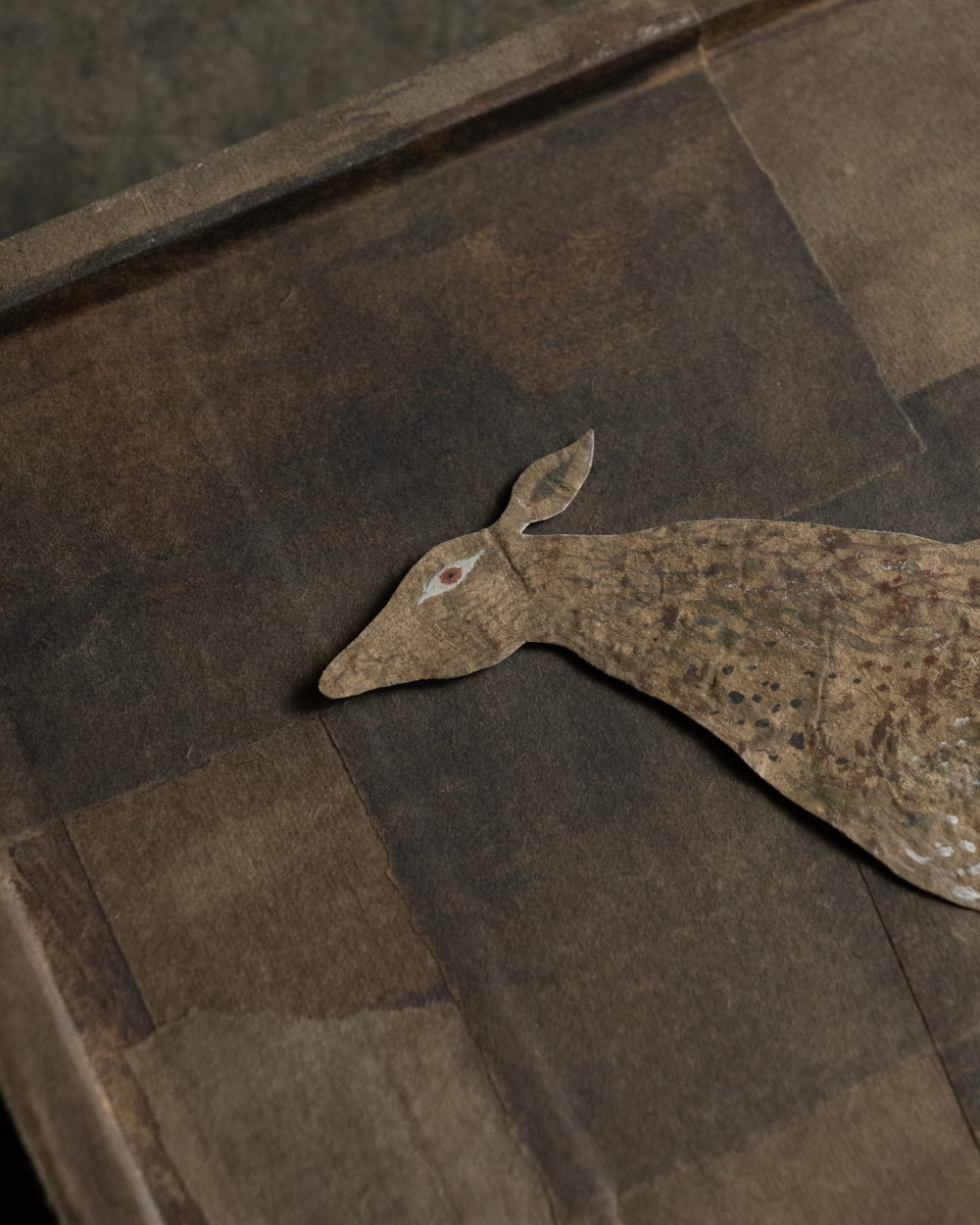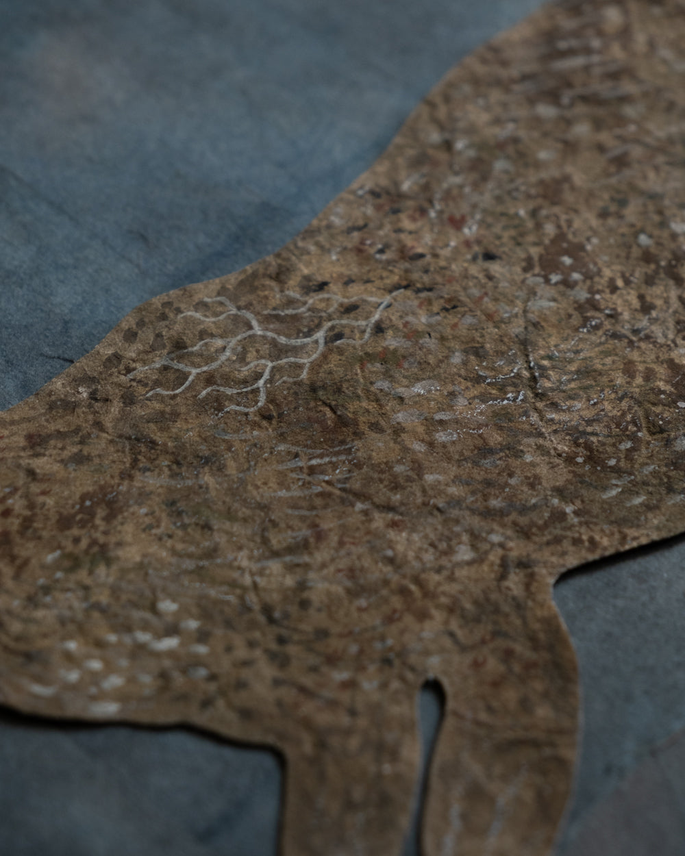 在這次《風之樹》展覽中,台灣作家Gyoku為熊谷隼人的「剪紙生物」製作手工紙敷染框,有「靛藍」與「咖啡」兩種色調,有著古布 boro 的質樸與溫度。以染紙為框,不僅讓作品更加完整,也讓熊谷隼人筆下充滿原始氣息的生物們,在光影之間顯得更加鮮活。