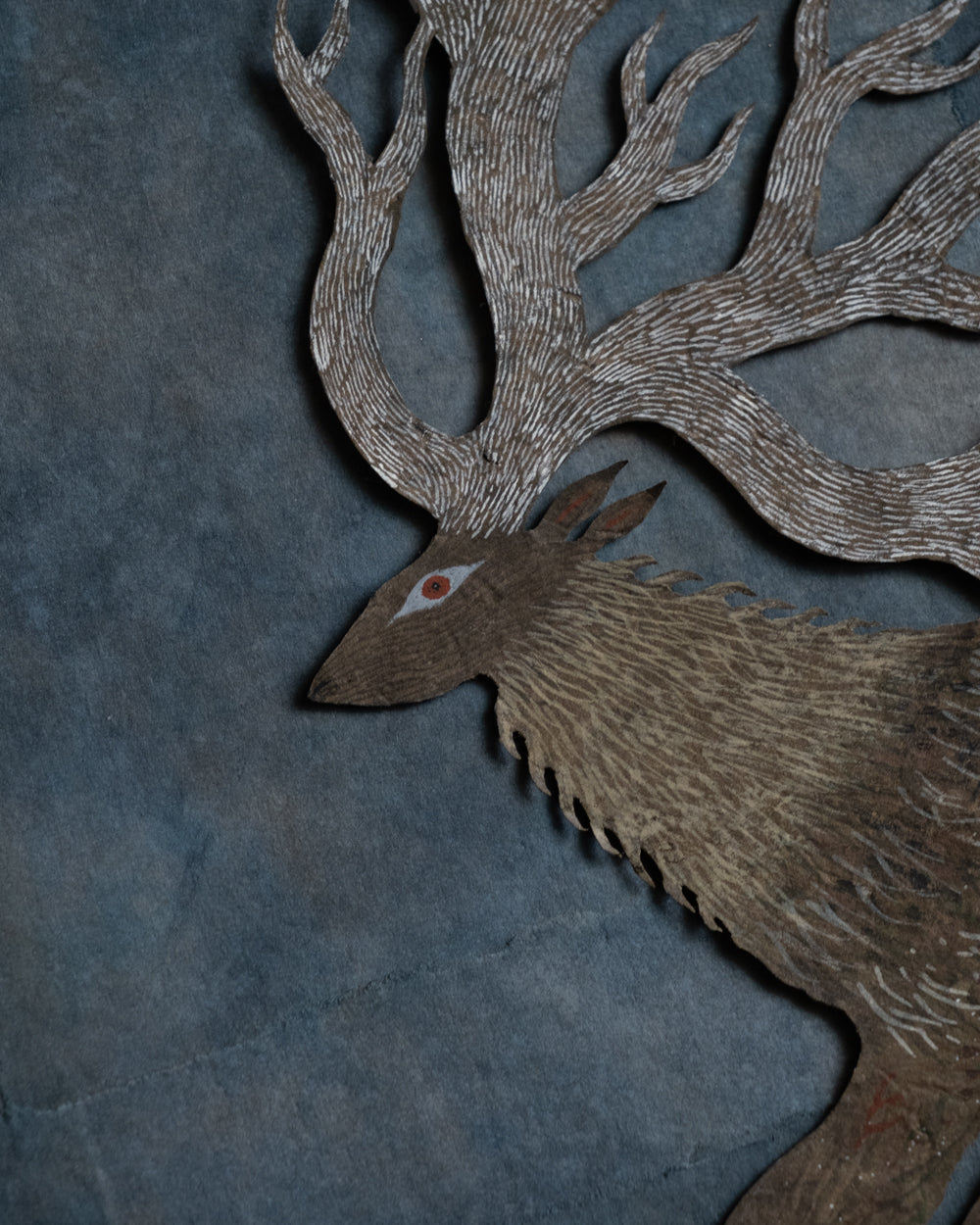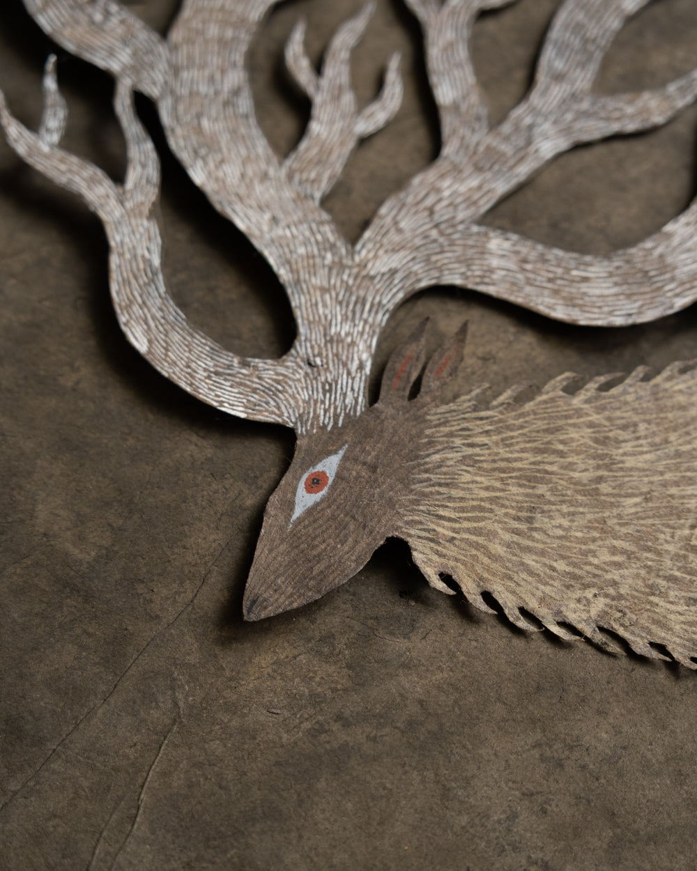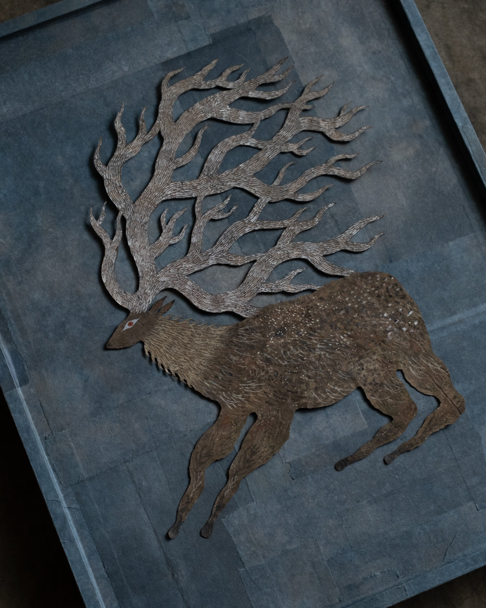 大約在五年前,熊谷遇見了名為Lokta的尼泊爾手工紙,從此他將這種有著自然紋理的紙當作岩壁,注入生命,訴說著無名的神話。熊谷移居至北海道後,大量描繪以鹿為主題的剪紙生物,在學習北方民族的文化信仰的過程中,他觀察到了許多以鹿、馴鹿、駝鹿為主題的壁畫與裝飾。在吸收這些元素的同時,他筆下剪紙生物們的眼神、體態、鹿角的形狀與花紋,也不斷地發生變化,而形成了現在的生物形貌。