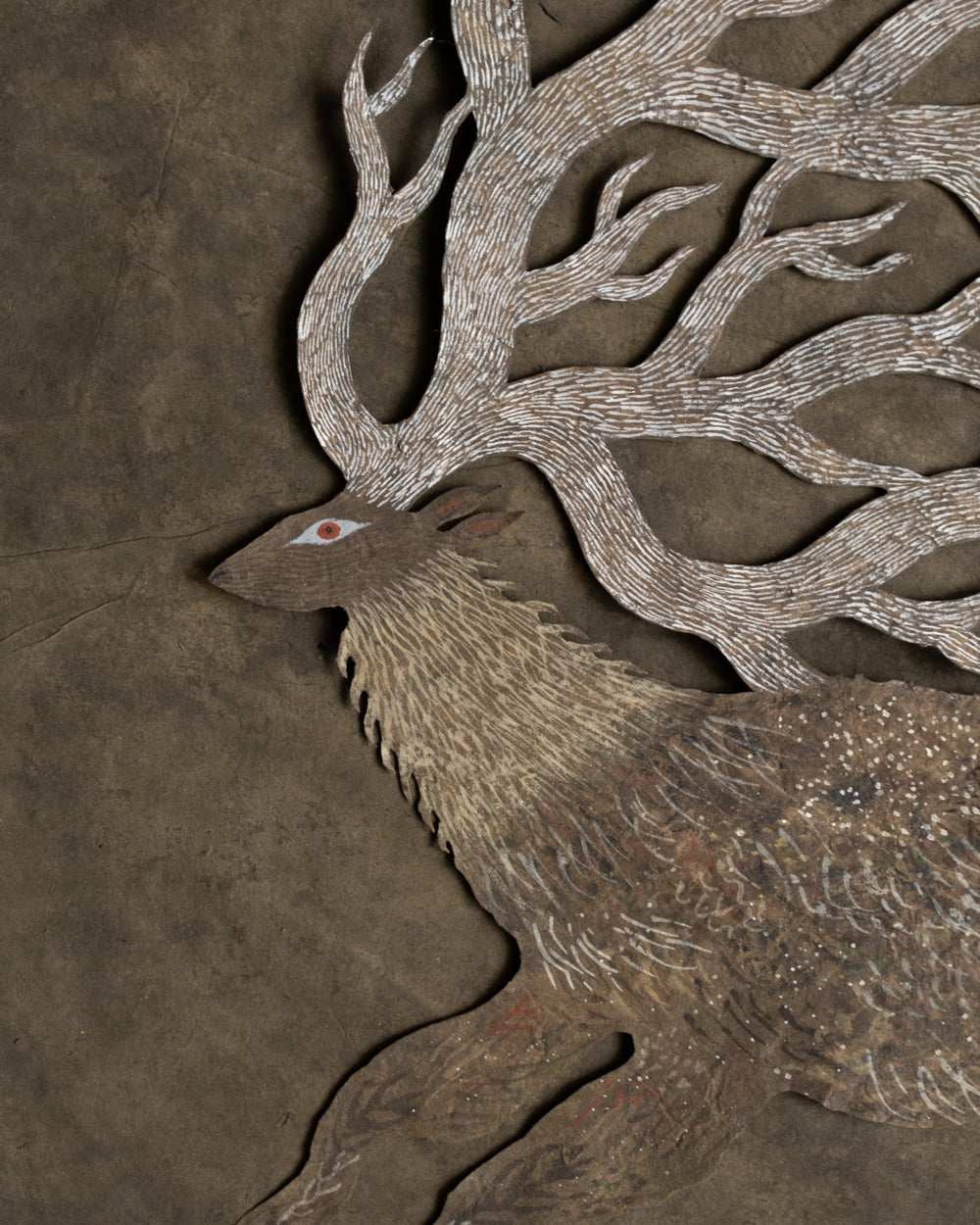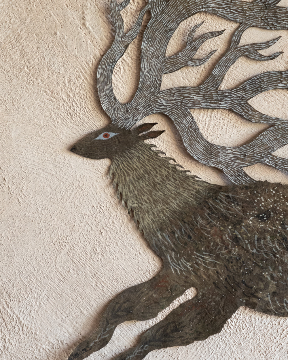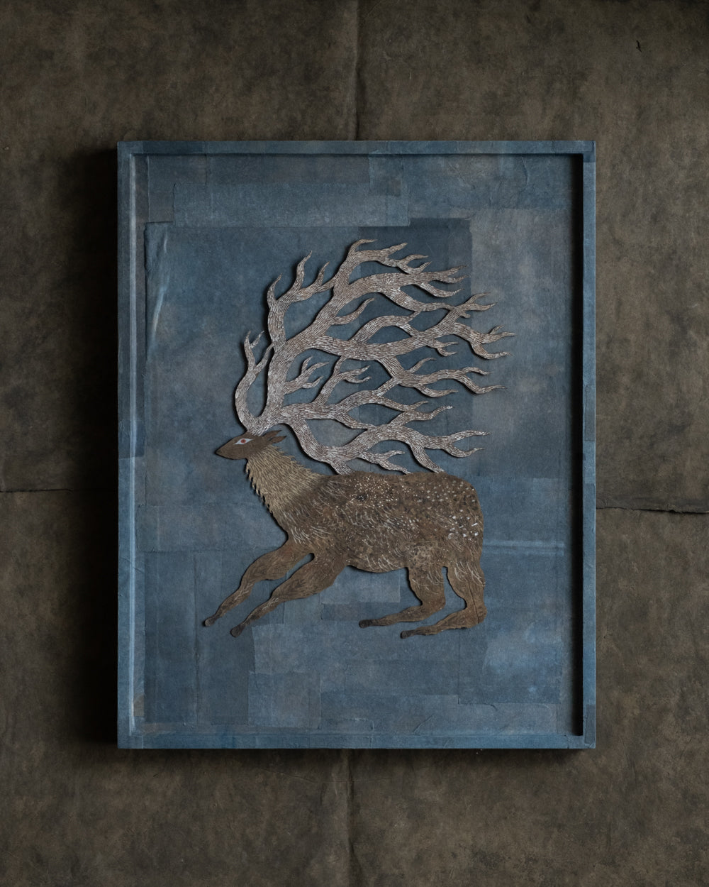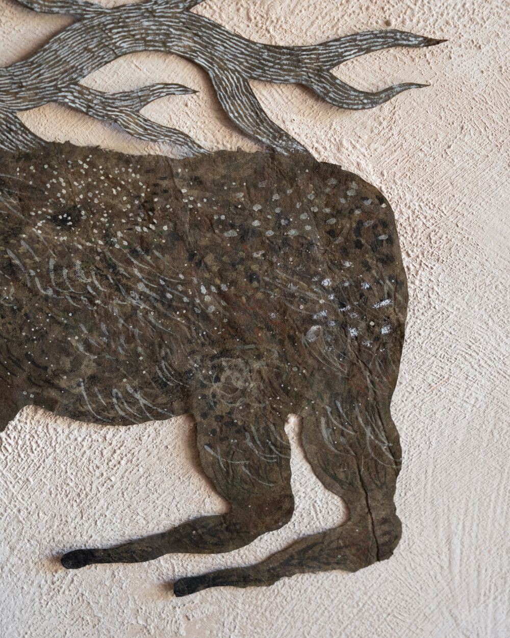 大約在五年前,熊谷遇見了名為Lokta的尼泊爾手工紙,從此他將這種有著自然紋理的紙當作岩壁,注入生命,訴說著無名的神話。熊谷移居至北海道後,大量描繪以鹿為主題的剪紙生物,在學習北方民族的文化信仰的過程中,他觀察到了許多以鹿、馴鹿、駝鹿為主題的壁畫與裝飾。在吸收這些元素的同時,他筆下剪紙生物們的眼神、體態、鹿角的形狀與花紋,也不斷地發生變化,而形成了現在的生物形貌。