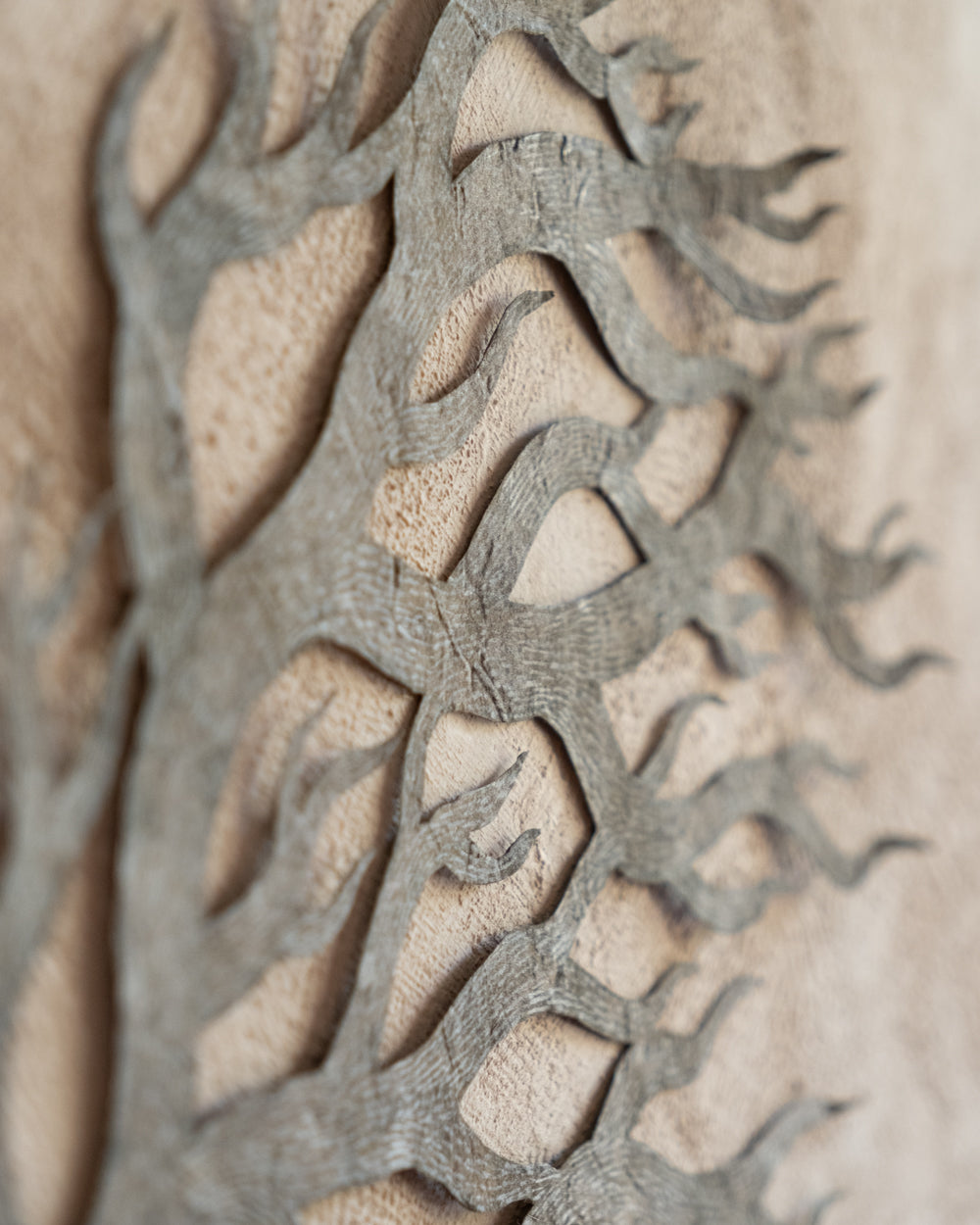 在這次《風之樹》展覽中,台灣作家Gyoku為熊谷隼人的「剪紙生物」製作手工紙敷染框,有「靛藍」與「咖啡」兩種色調,有著古布 boro 的質樸與溫度。以染紙為框,不僅讓作品更加完整,也讓熊谷隼人筆下充滿原始氣息的生物們,在光影之間顯得更加鮮活。